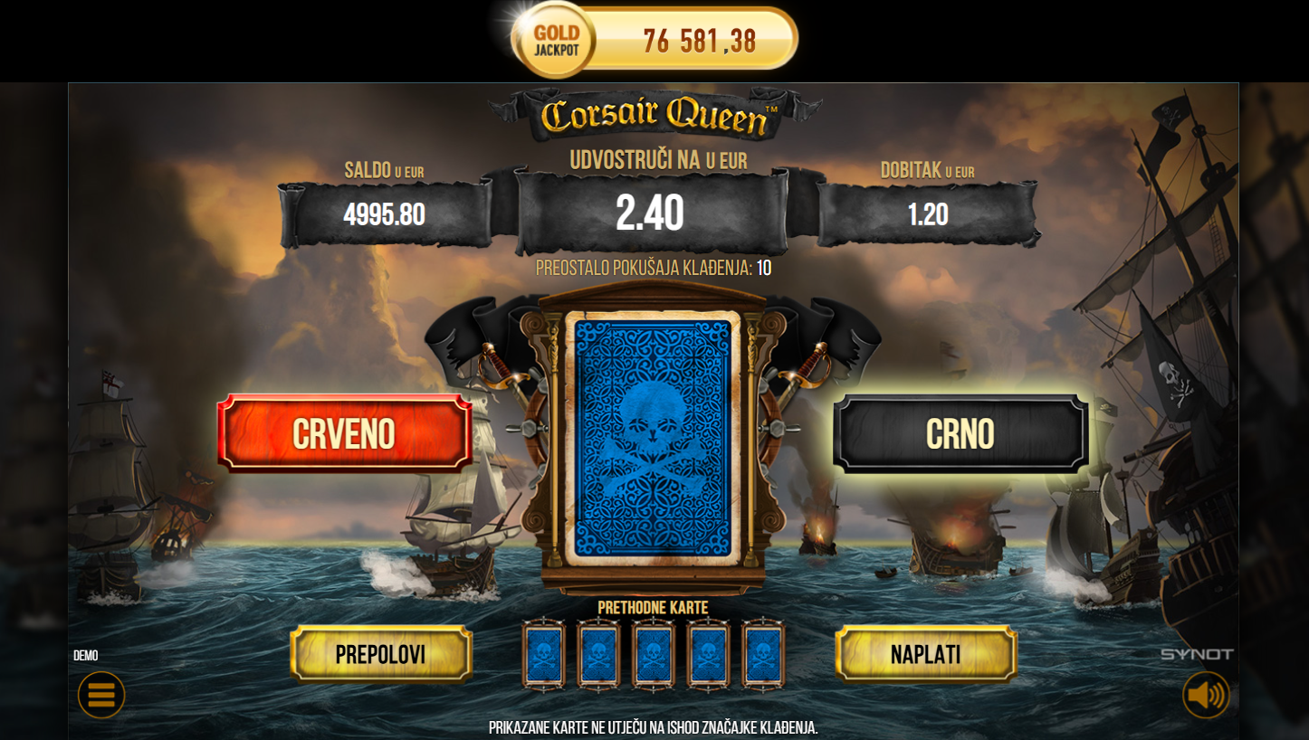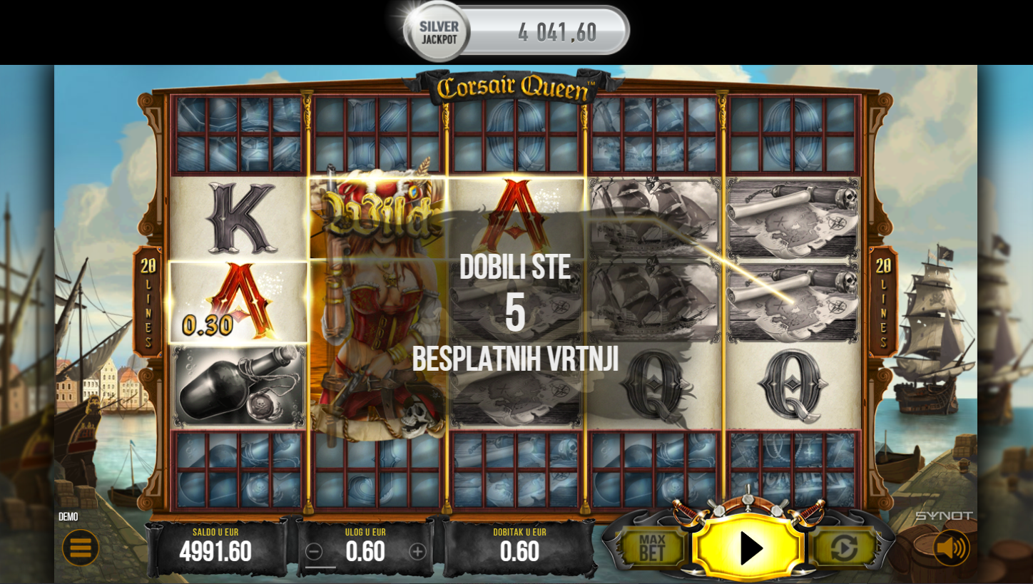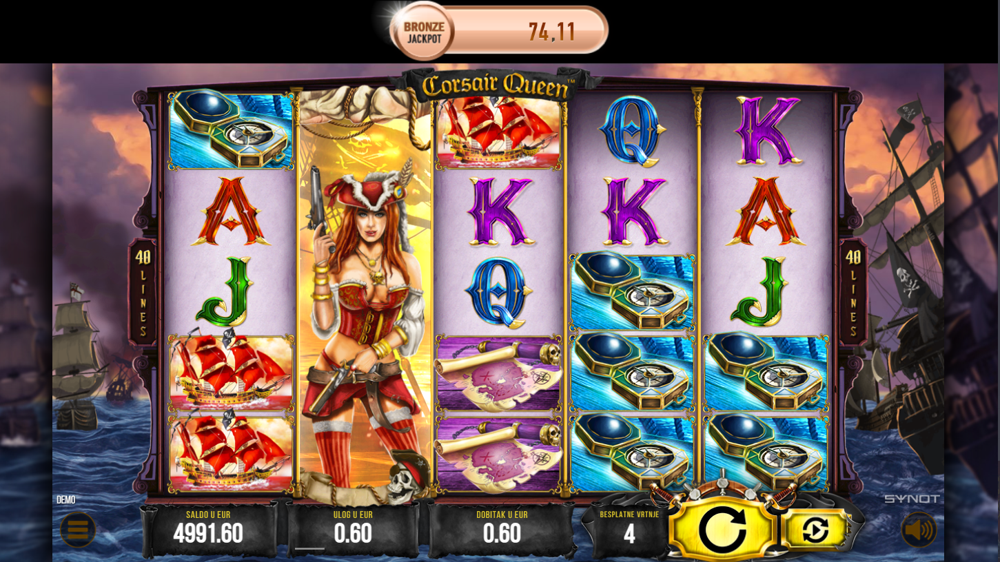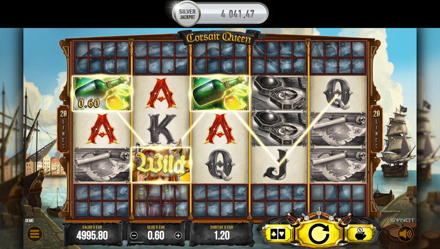 Corsair Queen je piratski slot od Synot Games koji donosi uzbudljivu atmosferu plovidbe i potrage za blagom. Igra se na 5 kolona, 3 reda i 20 fiksnih linija. Simboli uključuju boce ruma, kompase, karte i samu gusarsku kraljicu. Dizajn je živopisan i kombinira morsku avanturu s daškom steampunk stila.