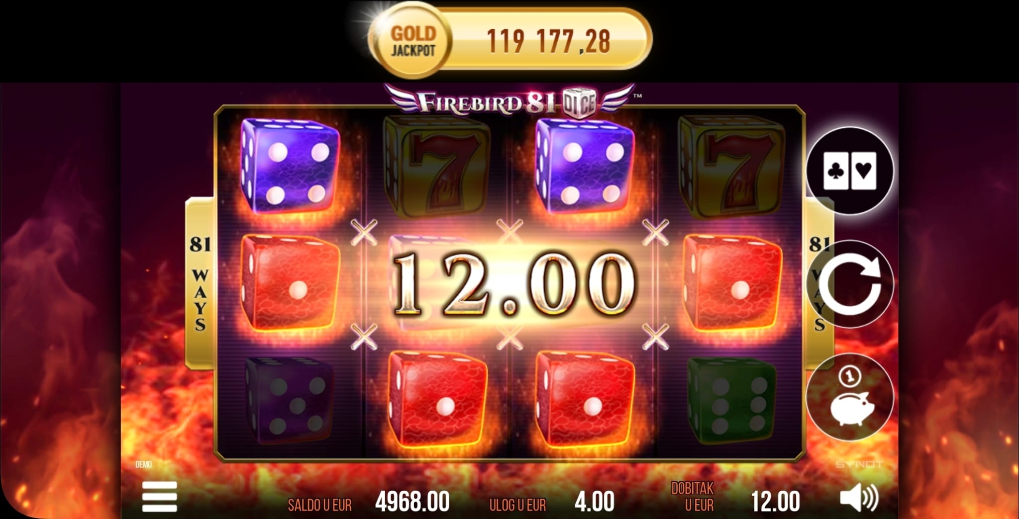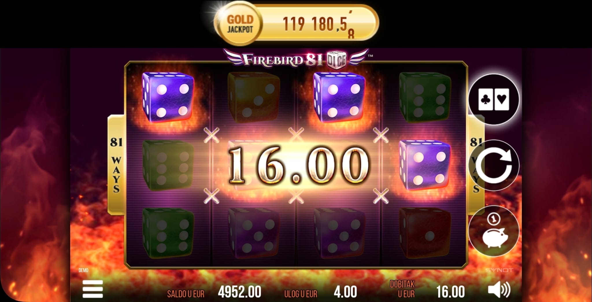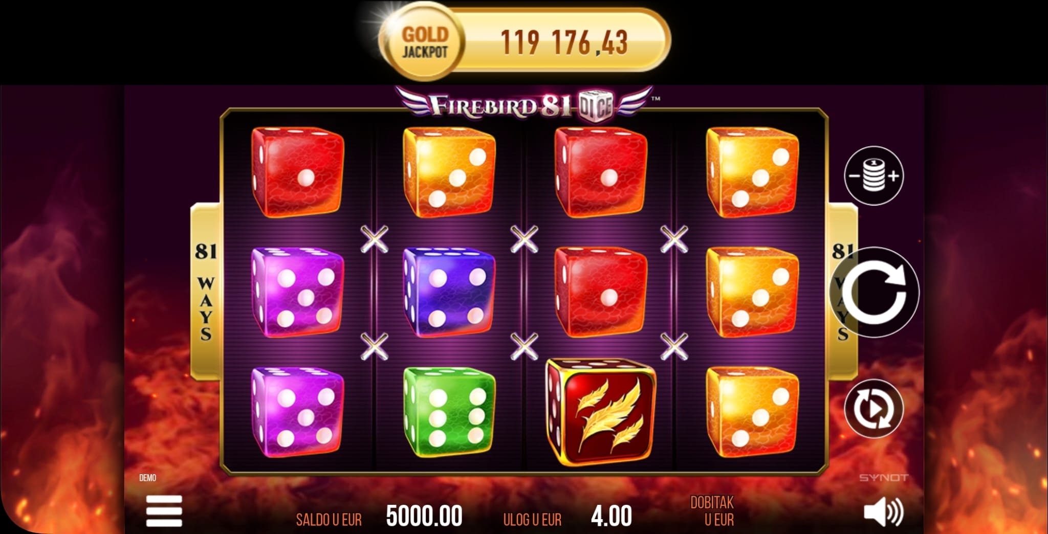 U igri Firebird 81 Dice, dobitne kombinacije se ostvaruju na 81 liniji, što znači da se dobici isplaćuju za kombinacije na susjednim valjcima.