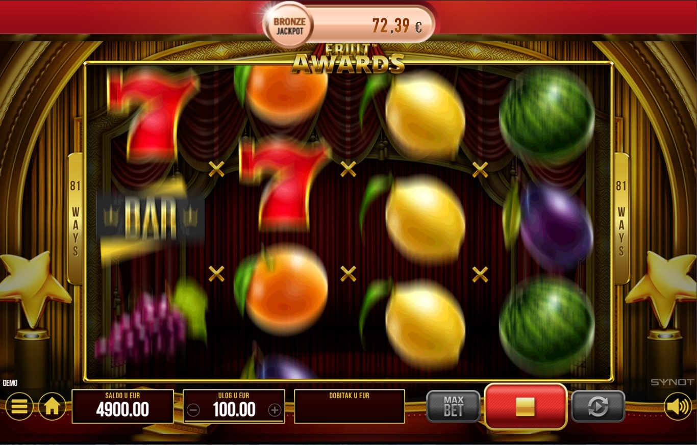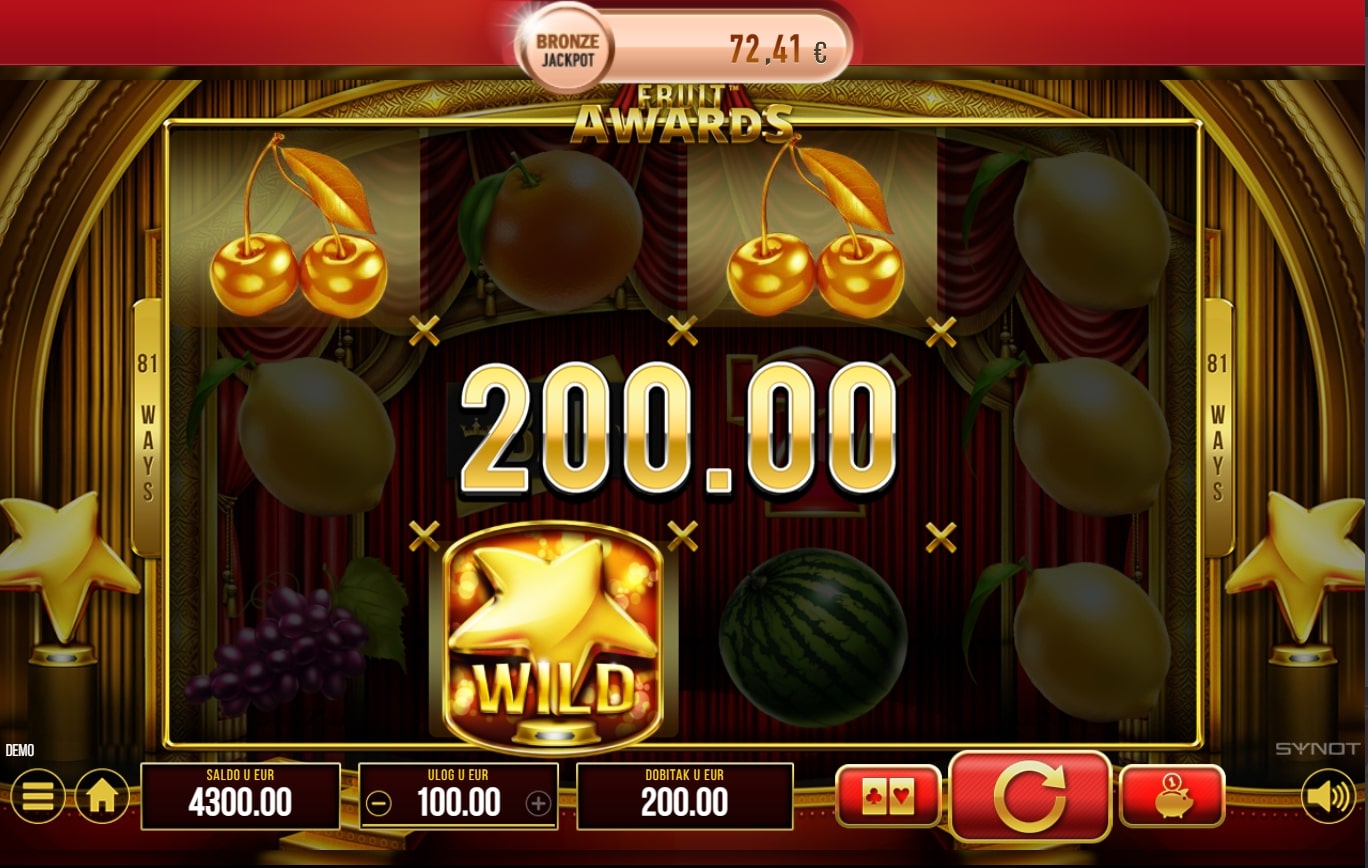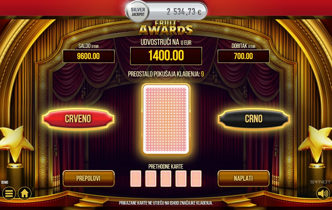 Fruit Awards slot je igra retro karaktera koja svijet voća i sedmica miješa sa svijetom zlata i glamura. Igra sadrži simbole grožđa, trešnja, šljiva, naranča i limuna, a simboli lubenica, zlatnih poluga i već spomenutih sedmica isplaćuju kao suho zlato. Igrač uz to može okrenuti simbol zvijezde koji mijenja druge simbole. U slučaju dobitka, igrač ga može pokušati udvostručiti pogađanjem boje karte okrenute licem prema dolje. Zaigraj Fruit Awards i ostvari sočne dobitke!
