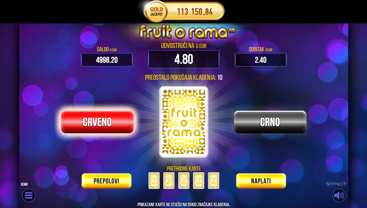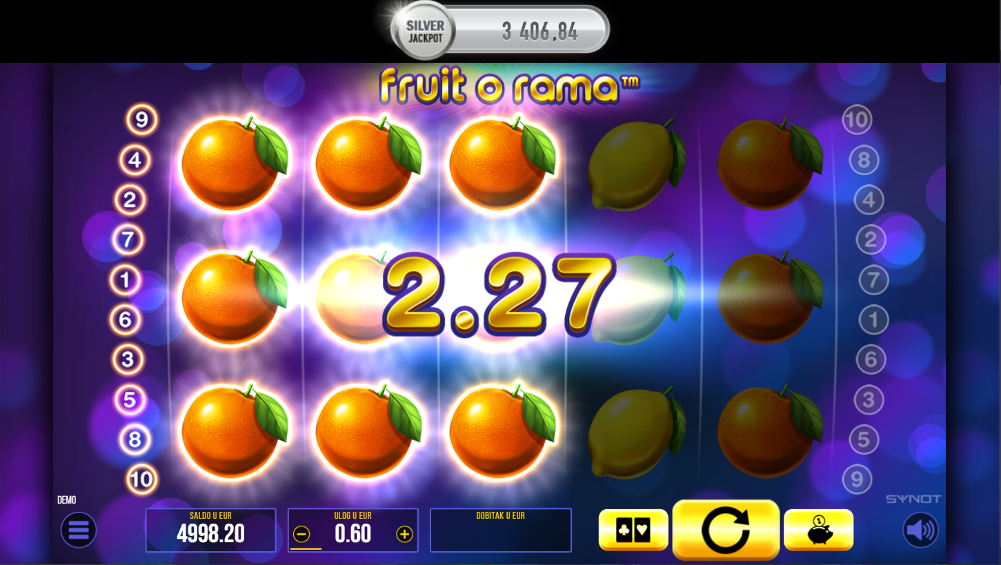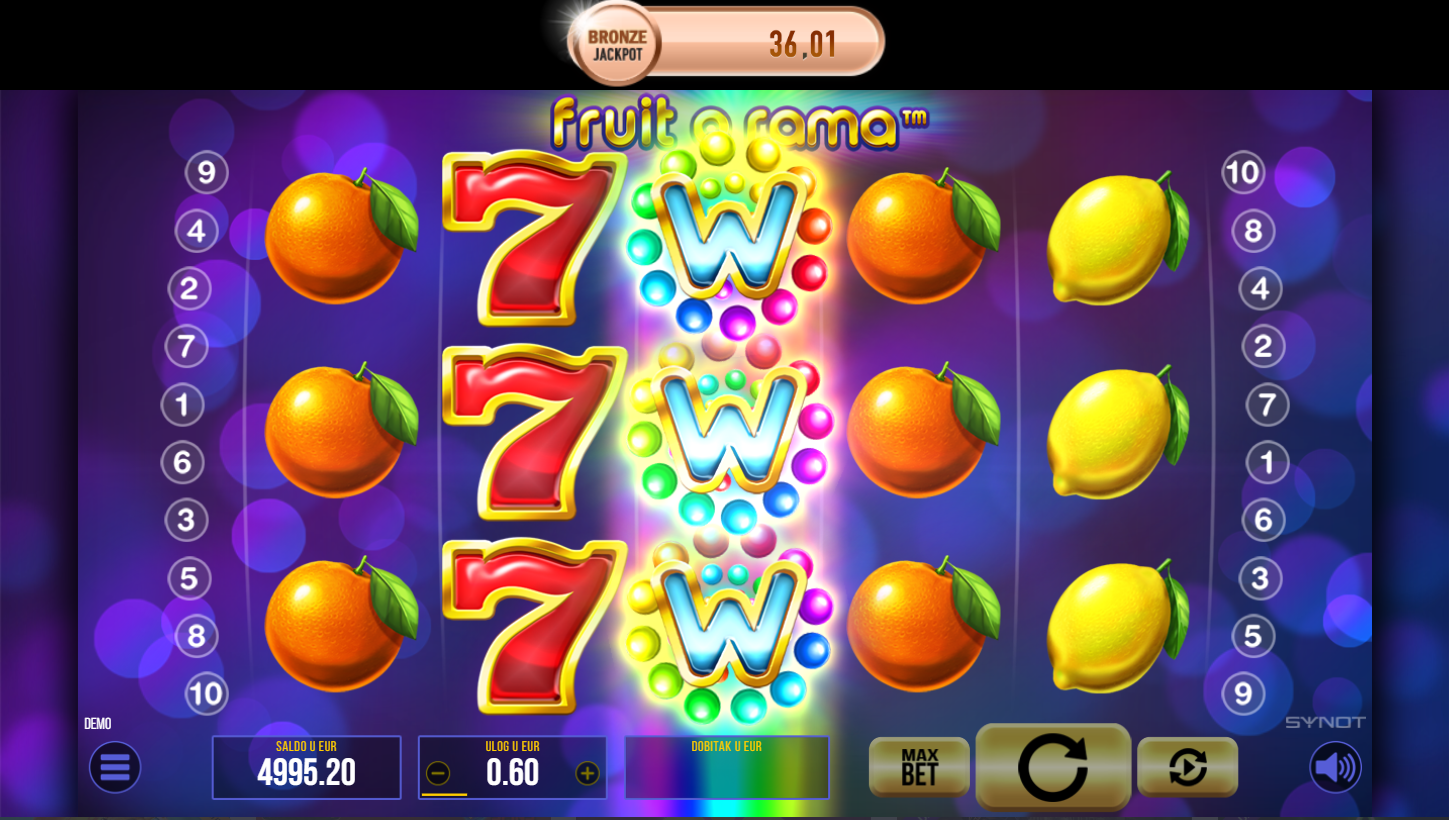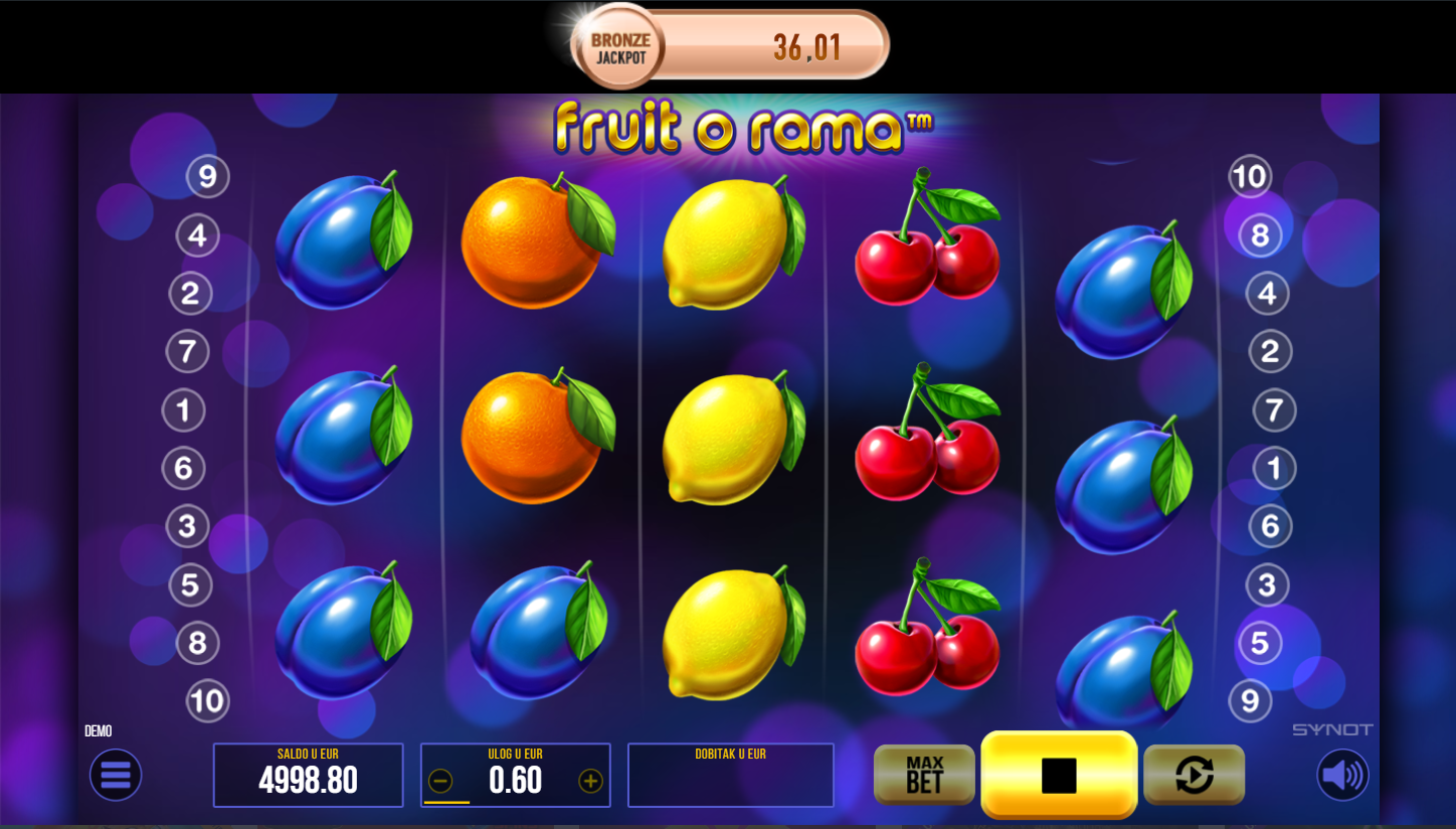 Fruit o Rama je klasični voćni slot od Synota s modernim dodirom. Na 5x3 bubnjeva i 10 linija isplate čekaju te trešnje, limuni, lubenice i zvijezde sreće. Grafika je svijetla i šarena, a igra zadržava retro šarm s dodatnim bonus značajkama. Ako voliš jednostavne, ali dinamične slotove, Fruit o Rama je pravi izbor.