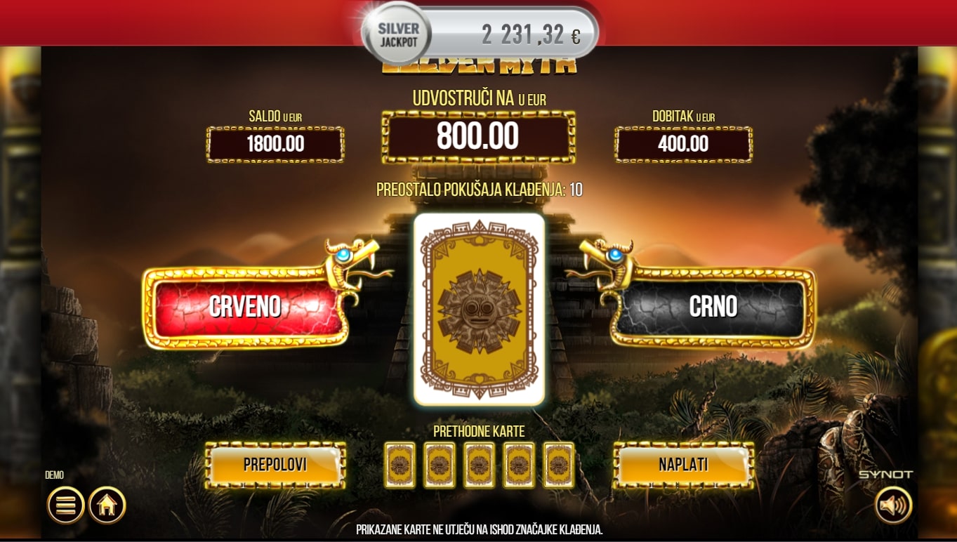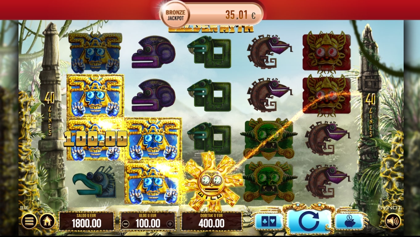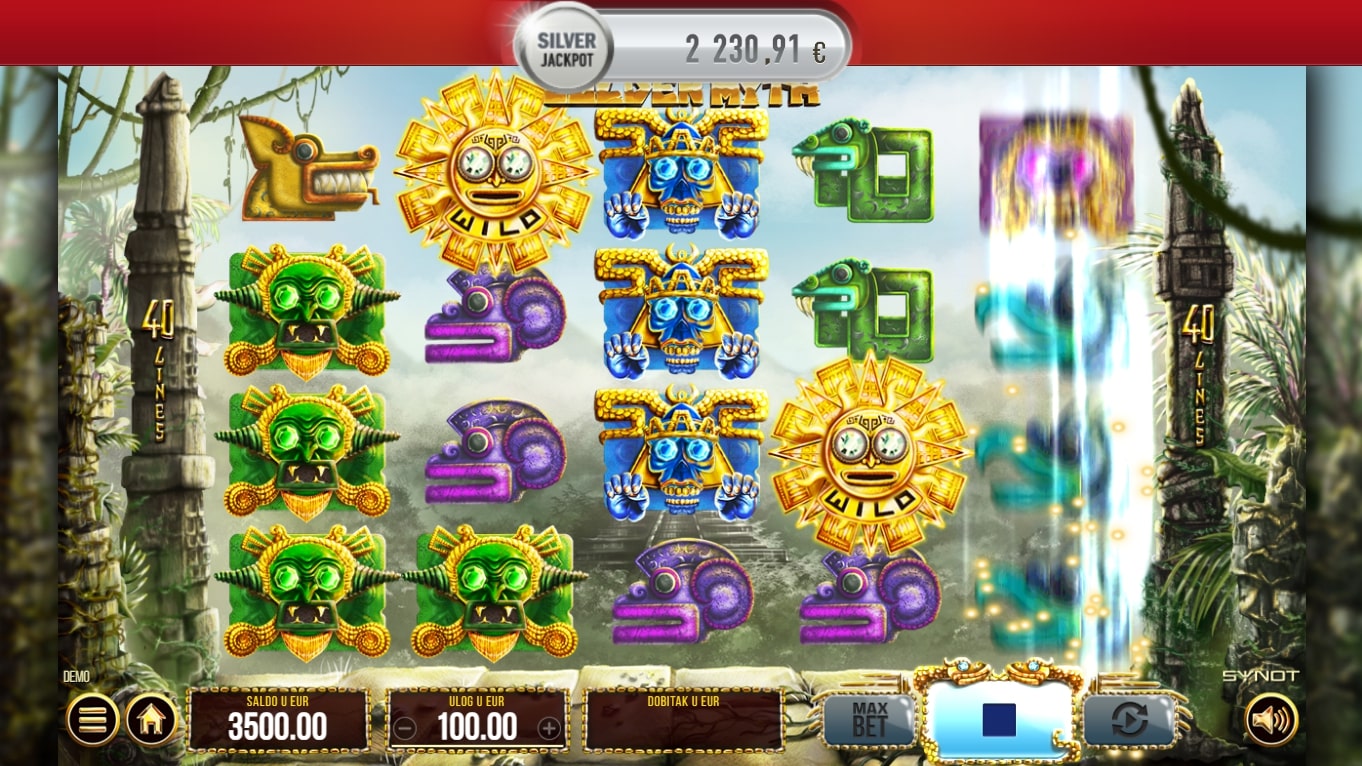 Golden Myth slot je igra povijesne tematike što vodi igrača u susret s drevnim civilizacijama Amerike u potrazi za vrhunskim dobicima. Najviše isplaćuju simboli ugravirani u zid, dok onaj sunca djeluje kao alfa i omega igre - može zamijeniti druge simbole, ali i odvesti igrača do besplatnih vrtnji. U slučaju dobitka, igrač ga može 'poduplati' pogađanjem boje karte okrenute licem prema dolje. Zaigraj Golden Myth te osvoji legendarne nagrade!
