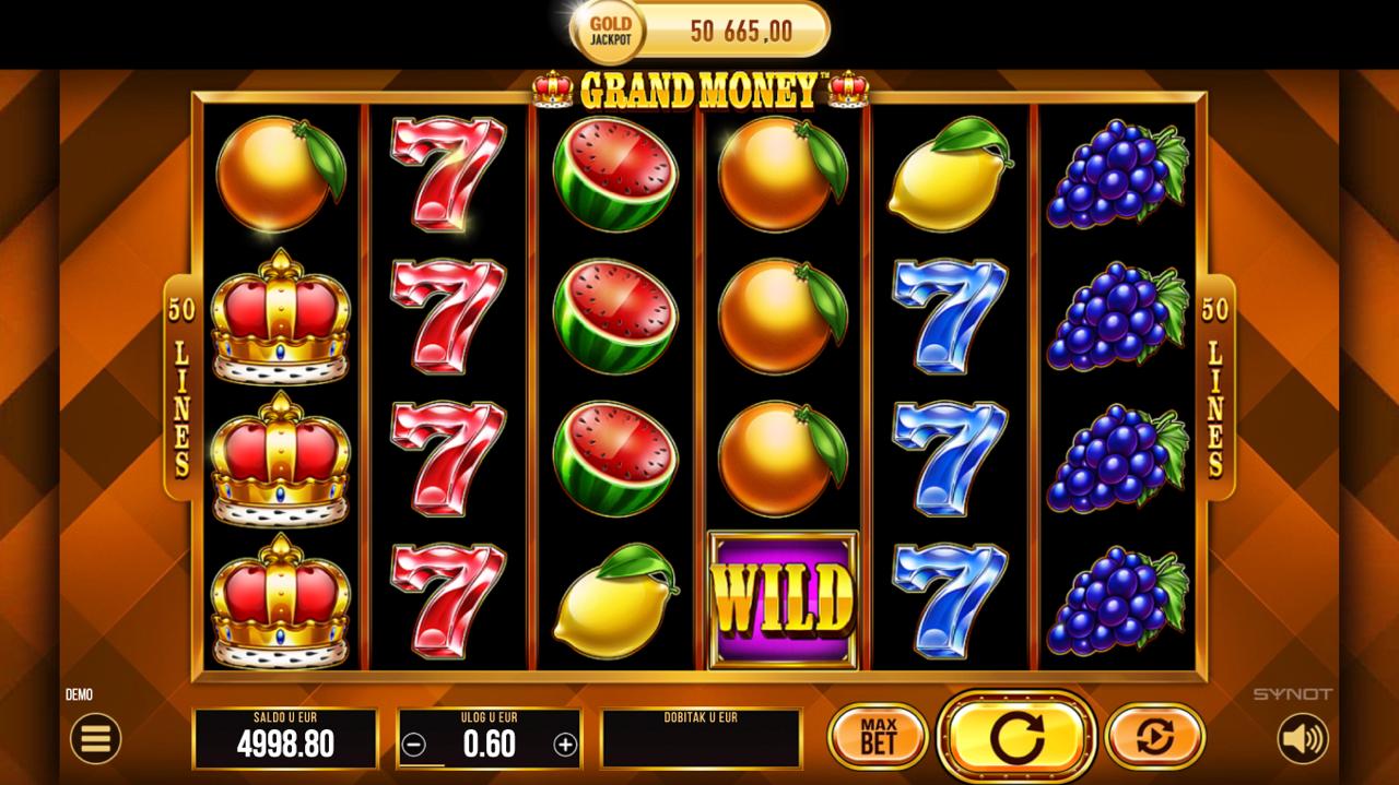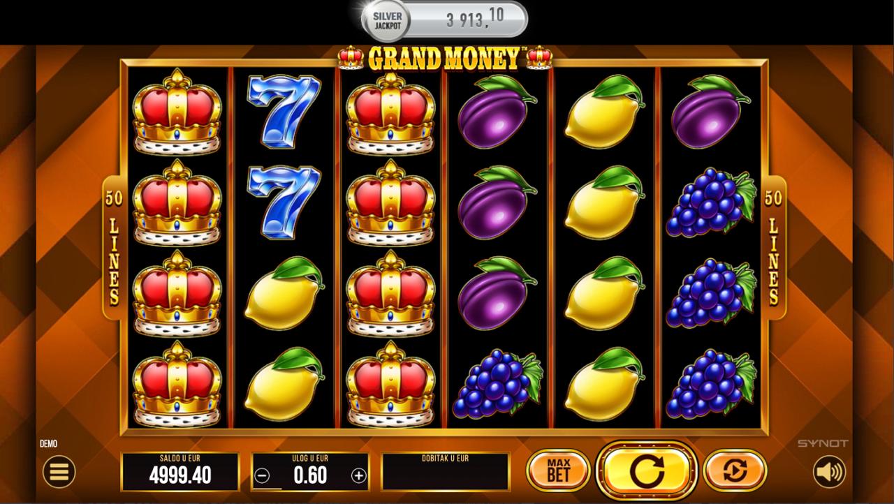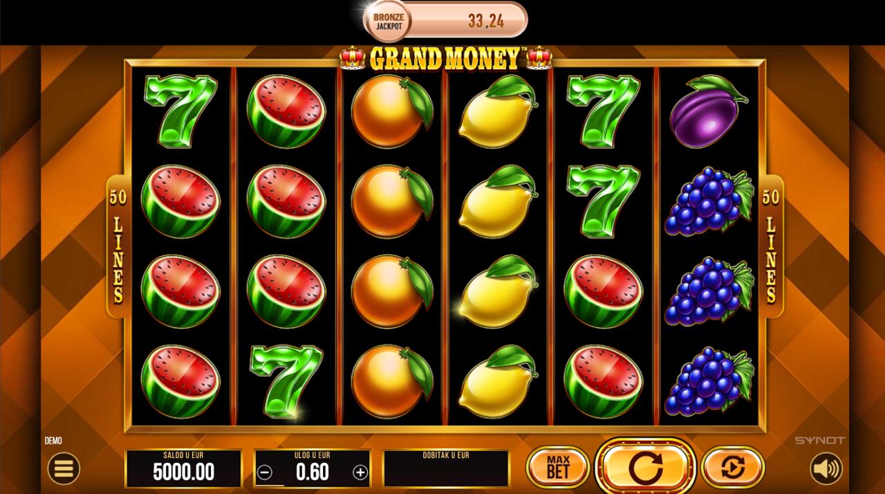 Grand Money igra se na 5 rola, a cilj je složiti iste simbole na aktivnim linijama, počevši s lijeve strane kako bi ostvario dobitak. Simboli inspirirani bogatstvom i luksuzom donose razne razine nagrada, dok posebni simboli i bonus značajke mogu povećati tvoje šanse za velike isplate. Postavi željeni ulog, zavrti role i uživaj u uzbudljivom slot iskustvu punom mogućnosti dobitaka — uključujući jackpot!