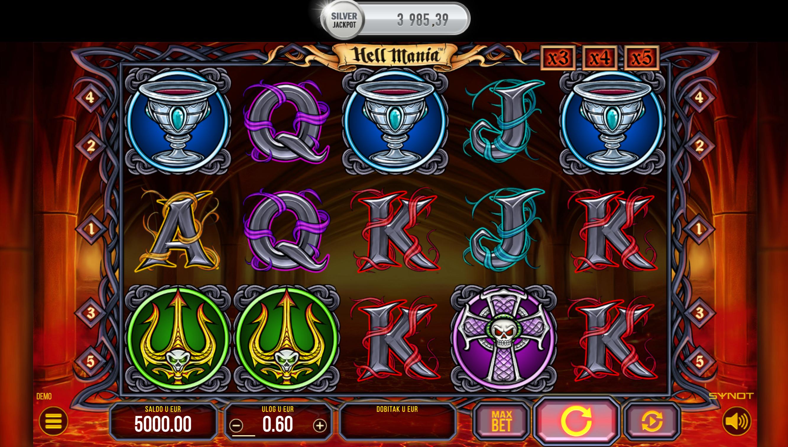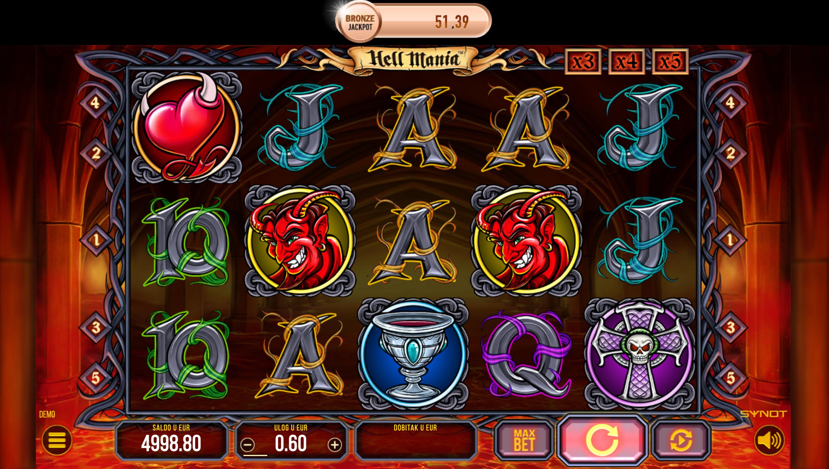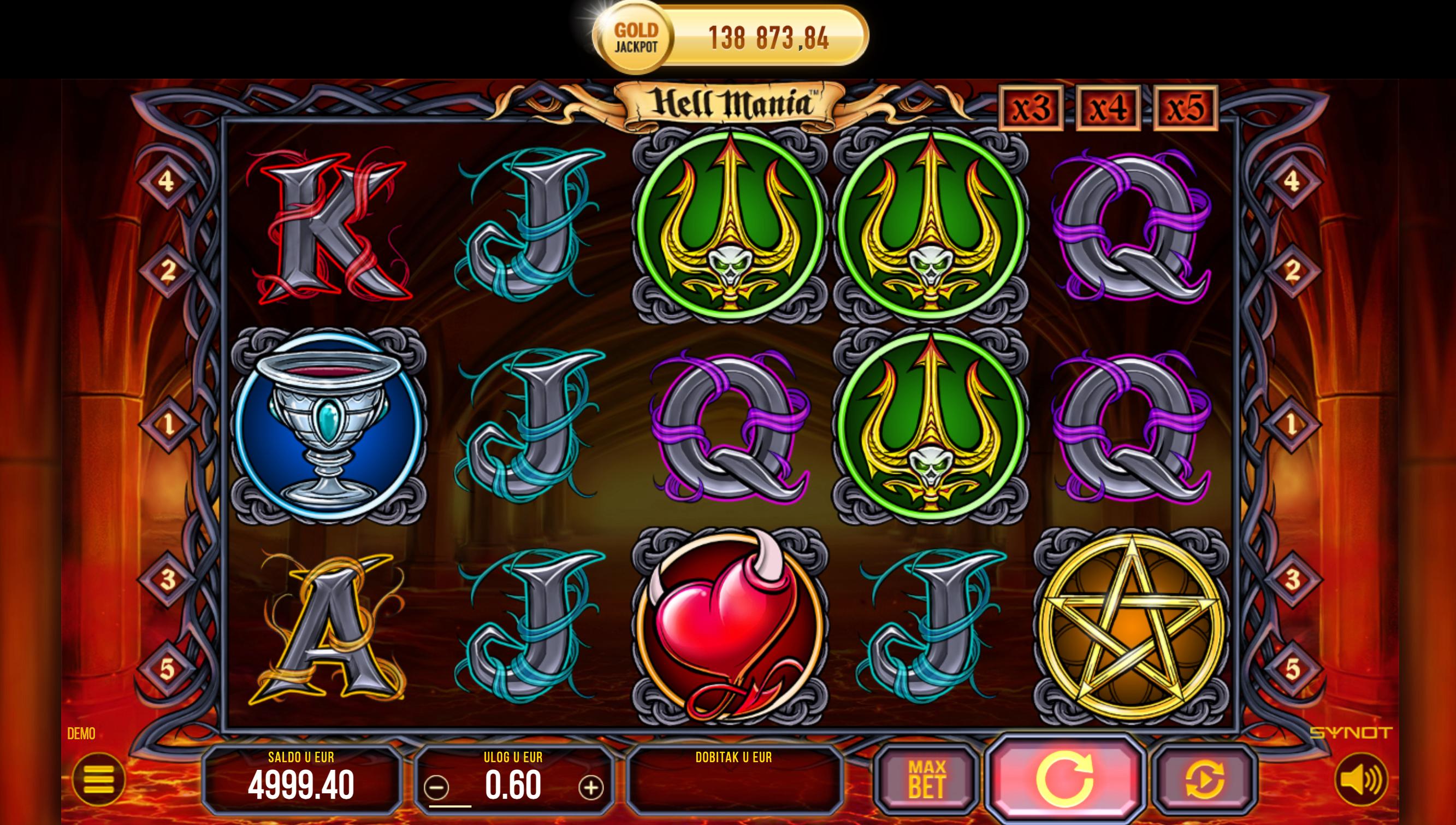 Hell Mania je video slot koji je razvio Synot Games. Smješten u svijet pakla, igra se odvija na 5 koluta i 3 reda s 5 isplatnih linija. Tema igre uključuje simbole poput tridents, chalica, srca, križa, pentagrama i samog vraga. Pozadina igre prikazuje vatrenu atmosferu pakla, stvarajući uzbudljivu igračku okolinu.