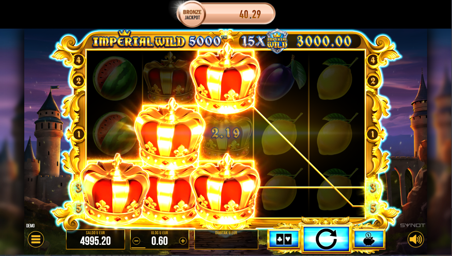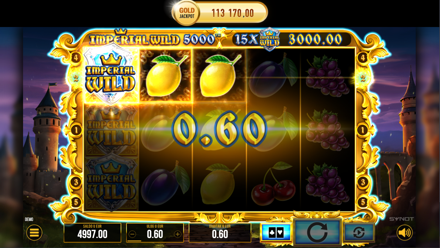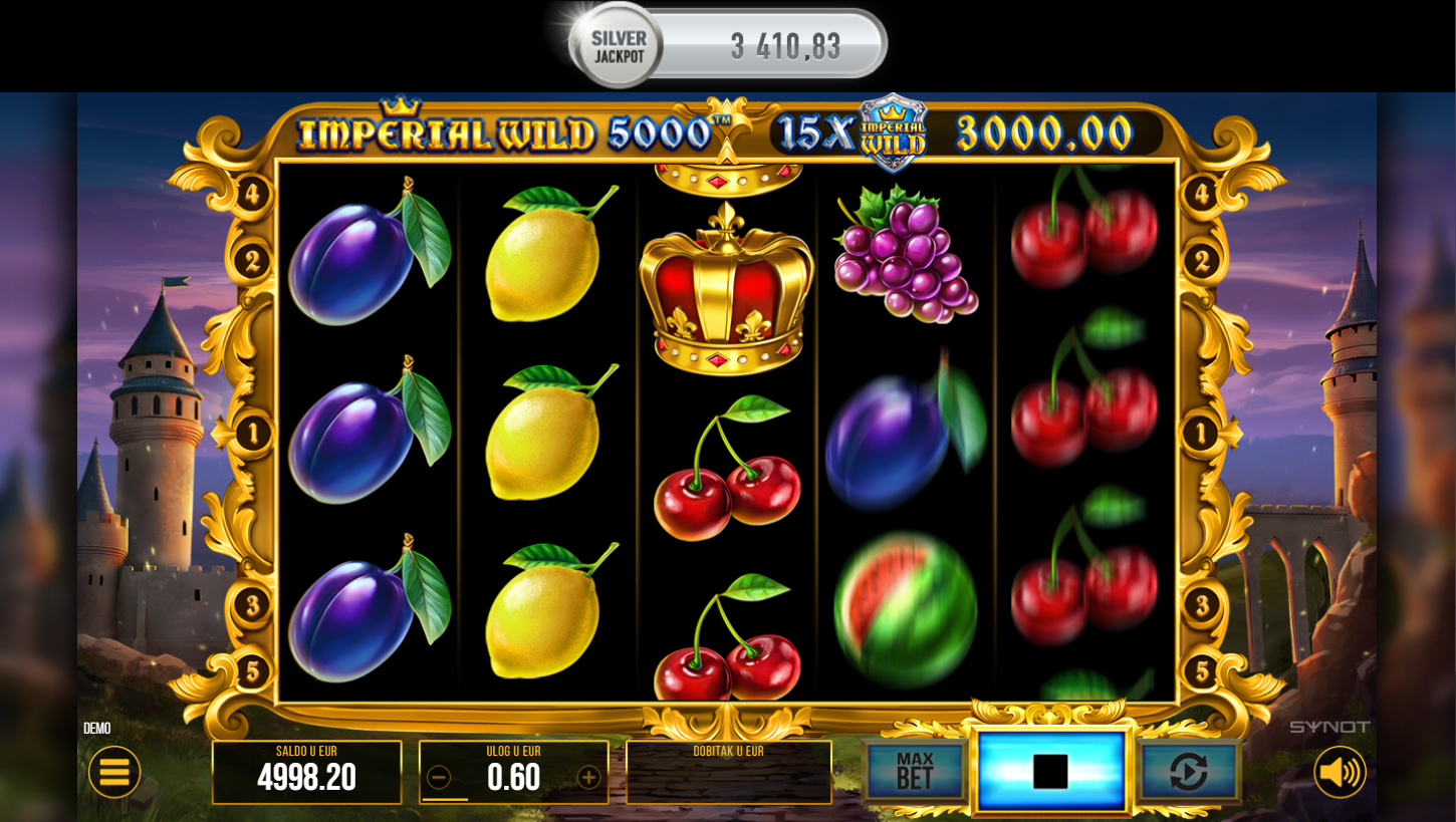 Imperial Wild 5000, od Synot, spaja klasične voćkice i kraljevsku eleganciju u jedinstvenom slotu. Na 5 bubnjeva i 5 linija isplate čeka te jednostavna, ali dinamična igra. Grafika kombinira voće, krune i blještave simbole za luksuzni osjećaj. Ako voliš retro automate s modernim naglaskom, ovo je pravi pogodak.