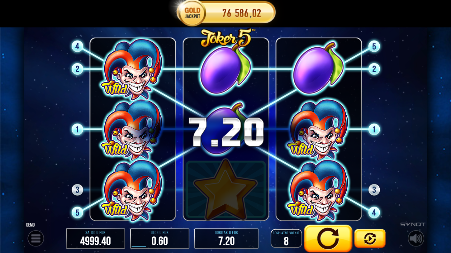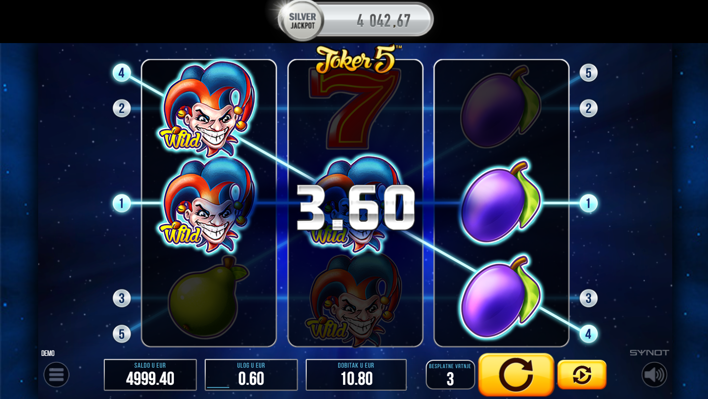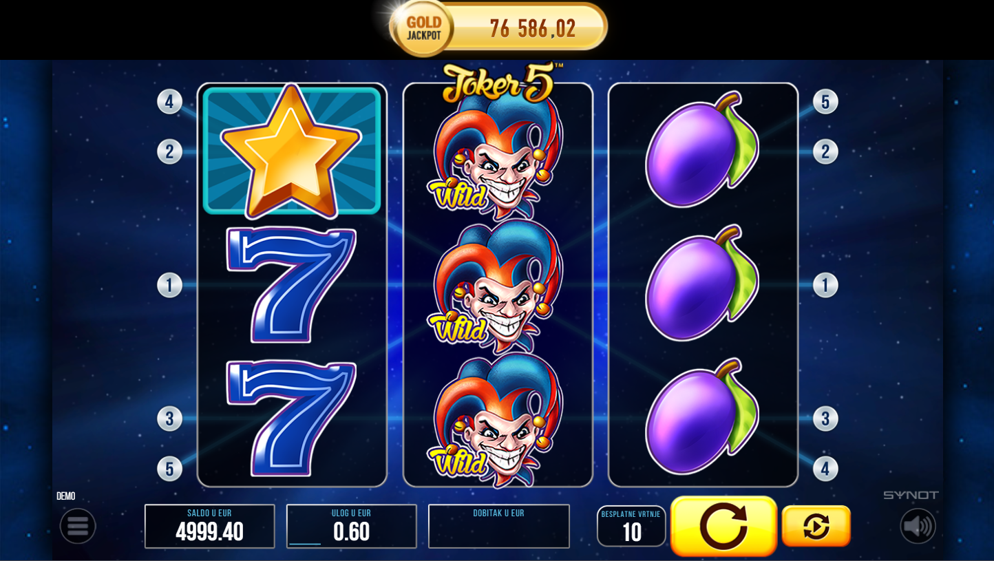 Joker 5 je klasični slot od Synot-a s jednostavnim dizajnom i retro atmosferom. Igra se na 3 kolone, 3 reda i 5 fiksnih dobitnih linija. Simboli uključuju voće, sedmice, zvijezde i džokera koji unosi dinamiku u igru. Dizajn podsjeća na tradicionalne automate, ali s modernim vizualnim dodirom.