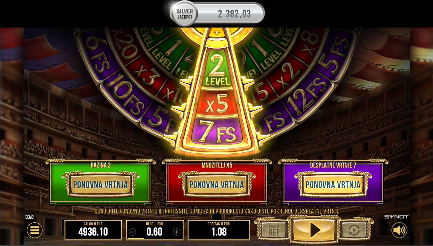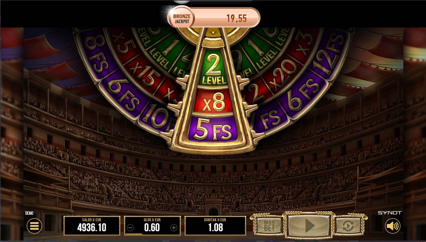 Vrtiš kolute, ali zapravo igra vodi tebe kroz arenu punu neizvjesnosti! Cascading winovi, misteriozni simboli i bonus koji pokreće kotač koji određuje tvoju nagradu. Svaki scatter je ulaznica za besplatne vrtnje, koje nisu obične jer ovdje biraš svoju razinu, multiplikator i broj spinova. A usput skupljaš zlatne novčiće koji te guraju sve dublje u arenu. Što duže izdržiš to te čeka veći dobitak.