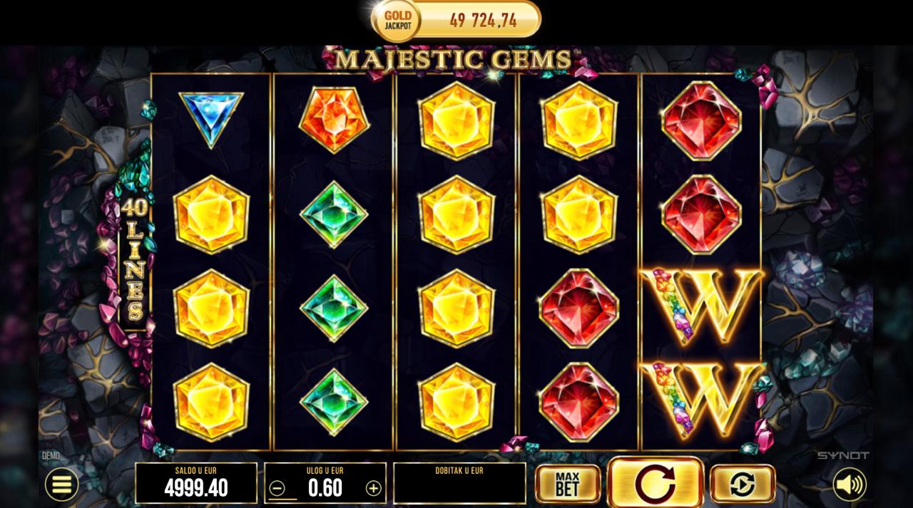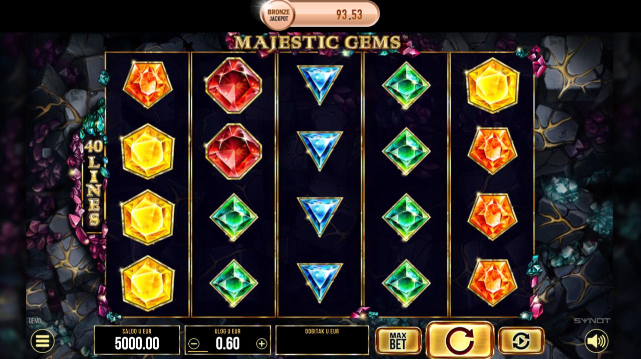 Majestic Gems igra se na 5 rola, a cilj je složiti iste simbole na aktivnim linijama, počevši s lijeve strane, kako bi se ostvarili dobitci. Dragulji različitih boja i vrijednosti donose razne razine nagrada, dok posebni simboli mogu aktivirati dodatne mogućnosti za veću isplatu. Postavi željeni ulog, zavrti role i uživaj u blistavom doživljaju igre koji svaki spin može učiniti vrijednim!