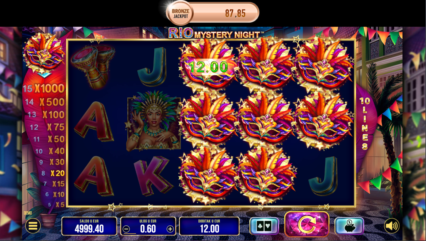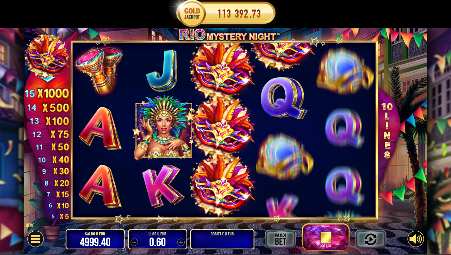 Rio Mystery Night od Synota vodi te na glamurozni karneval u Rio de Janeiru. Slot s 5 bubnjeva i šarenim simbolima donosi atmosferu plesa, glazbe i noćnog spektakla. Grafika je vibrantna, a soundtrack pun energije, pa svaki spin izgleda kao dio parade. Ako voliš igre s karnevalskim duhom, ovo je pravi izbor.