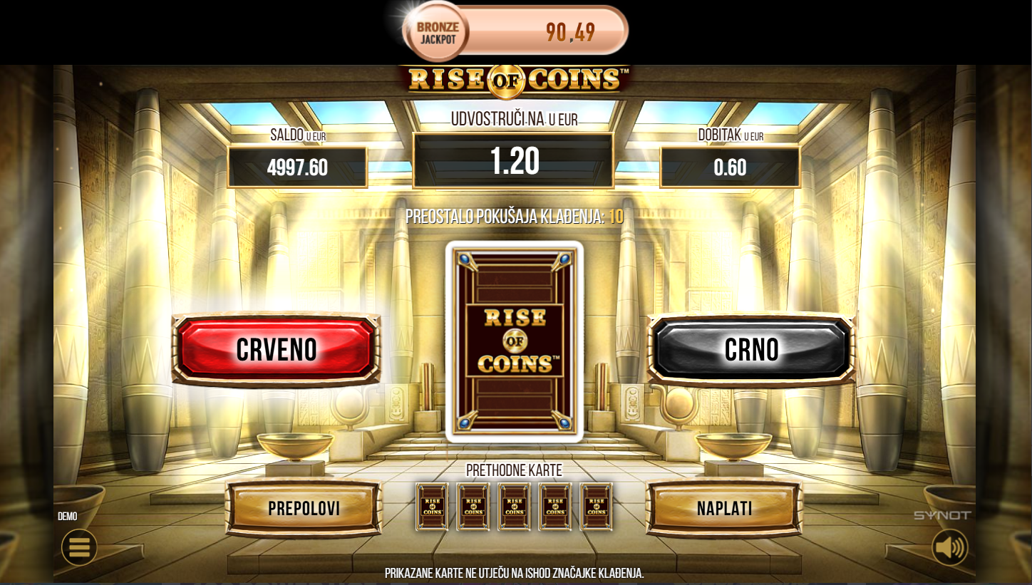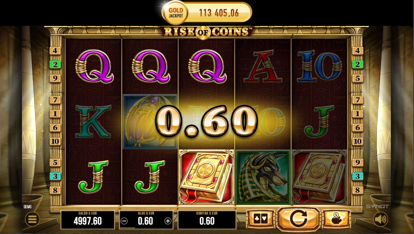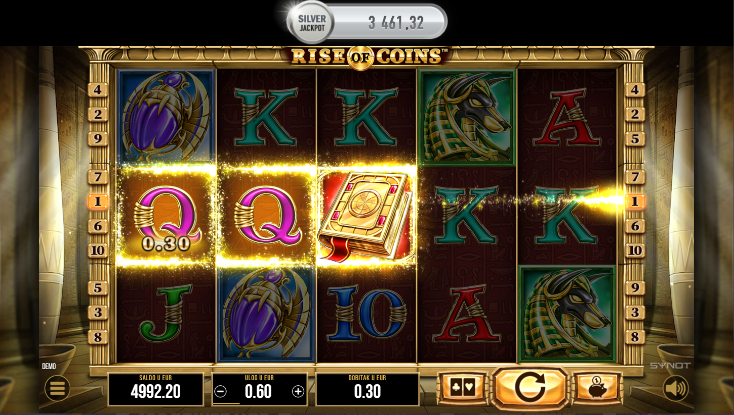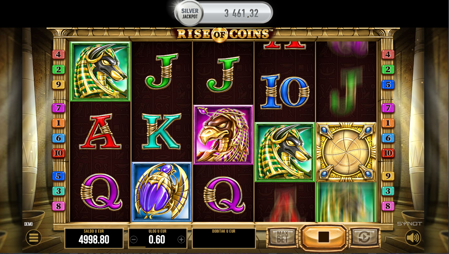 Rise of Coins i Synot vode te u stare egipatske grobnice, gdje zakopano blago čeka da ga otkriješ. Simboli glazbe, boja i zlatnih kovanica sjaje pod hijeroglifima. Tematika je mješavina avanture i mistike, s dekorom kakav zaslužuje kralj ili faraon!