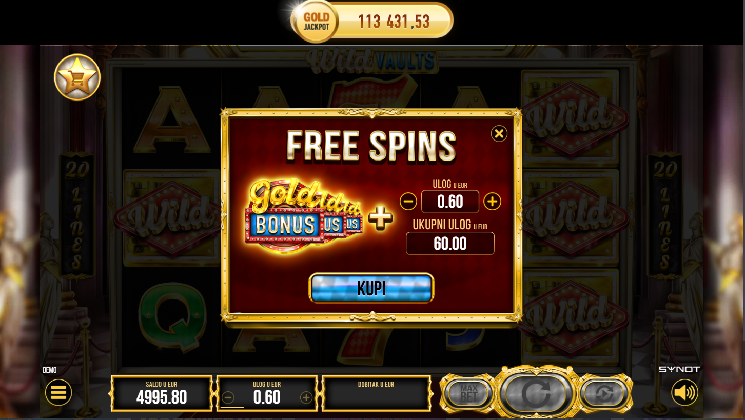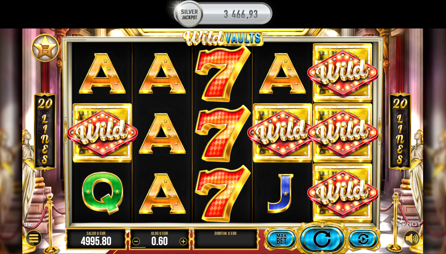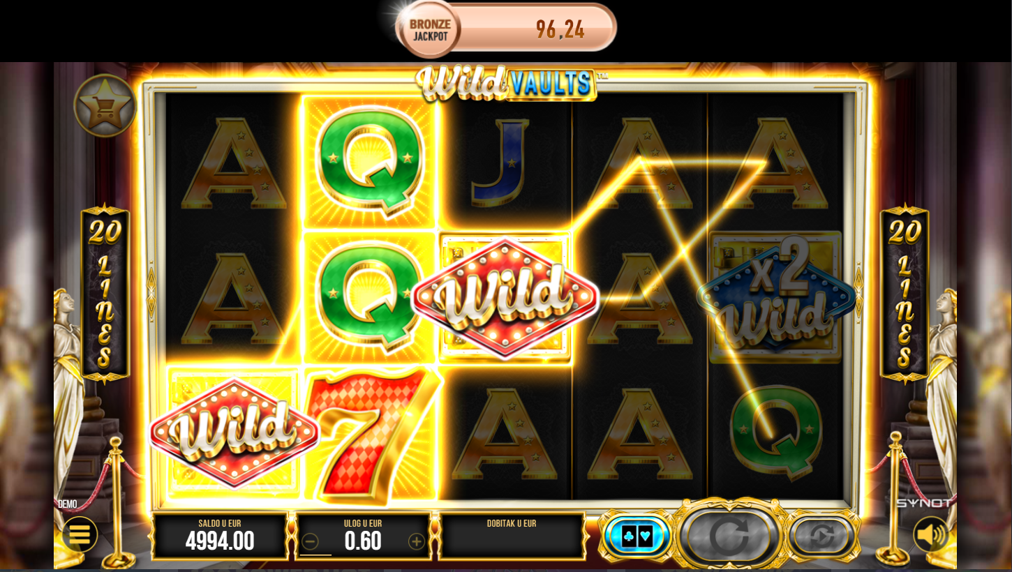 Wild Vaults i Synot vode te ravno u svijet sefova, ključeva i skrivenog bogatstva! Na 5 bubnjeva i 20 linija isplate kriju se simboli zlata, dragulja i tajnih kodova. Svaki spin može otvoriti nova vrata i povećati broj bubnjeva i linija. Ako voliš igre s osjećajem pljačke i otključavanja blaga, ovo je prava avantura!