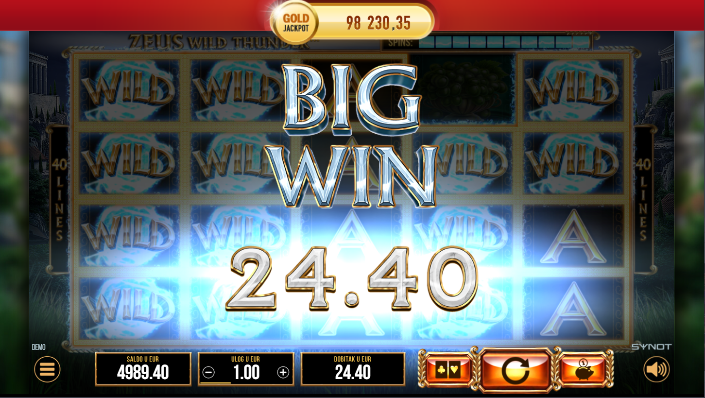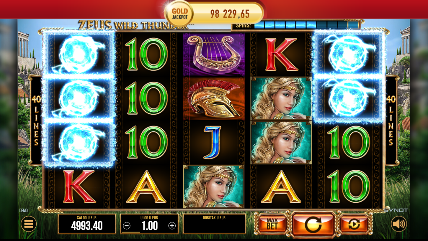 Vrtnje počinju jednostavno, ali vrlo brzo shvatiš da svaki simbol groma može pokrenuti lavinu promjena. Kada se pojavi lightning simbol, ostavlja trag u obliku zlatnog okvira koji se puni i čeka svojih deset okretaja. Kad dođe trenutak, okvir se pretvara u wild i može ti donijeti lavinu dobitaka. Ulaskom u bonus rundu biraš svoj stil igre: više vrtnji s manje wildova ili manje vrtnji s većim rizikom i nagradom. Sve je u tvojim rukama, a svaki izbor izgleda kao da si upravo Zeus koji odlučuje o svojoj sudbini.
