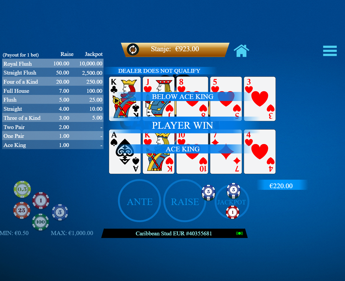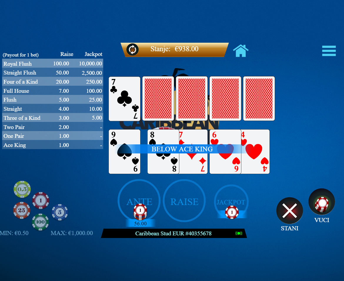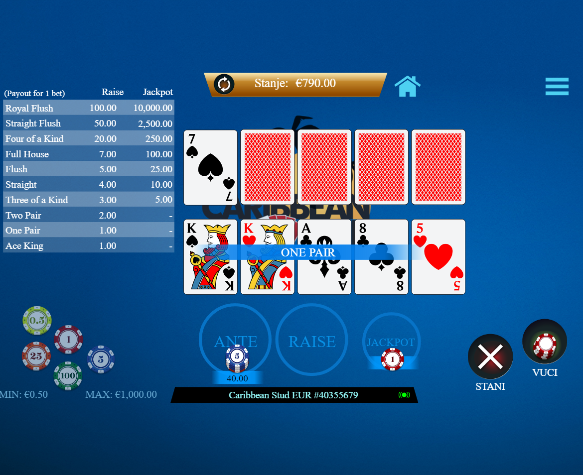 Caribbean Stud Poker je uzbudljiva kartaška igra koja donosi osjećaj pravog casina direktno do tebe. Cilj igre je imati jaču ruku od djelitelja, uz mogućnost osvajanja jackpota. Svaki igrač započinje s ante ulogom i opcijskim jackpot ulogom. S pet karata u ruci, možeš odlučiti hoćeš li povećati svoj ulog ili odustati. Jedna od karata djelitelja je otkrivena, što dodaje dodatnu dozu strategije i napetosti. Uživaj u carstvu karipskog pokera s brojnim prilikama za dobitak!