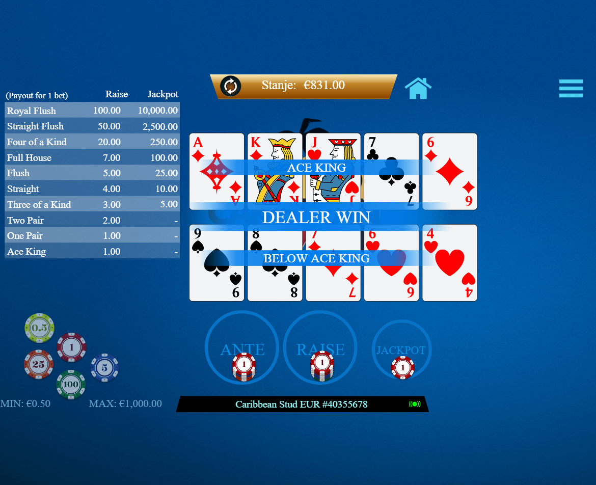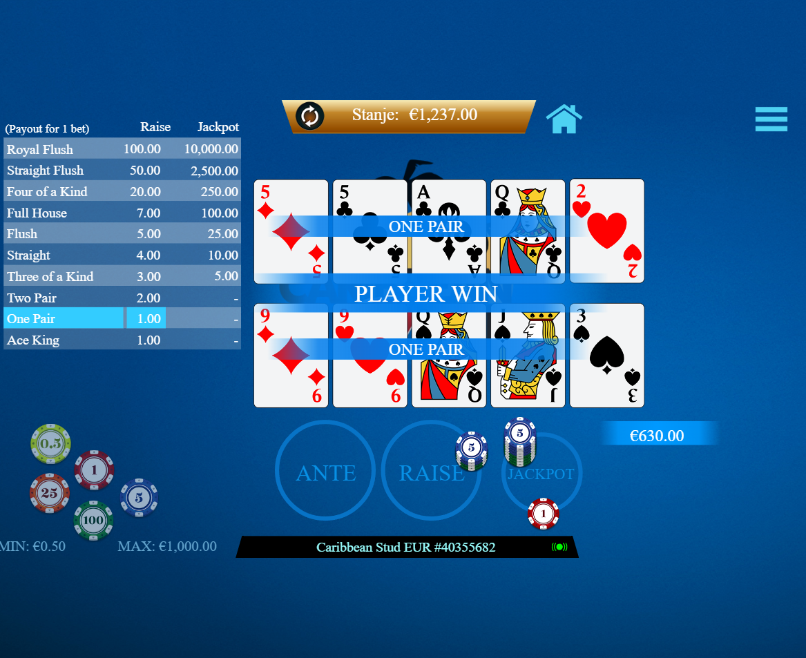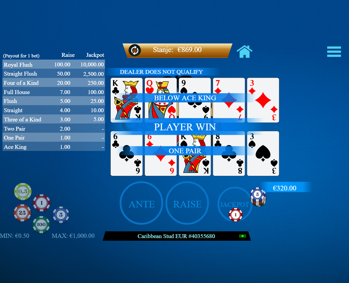 Caribbean Stud Poker je uzbudljiva kartaška igra koja donosi osjećaj pravog casina direktno do tebe. Cilj igre je imati jaču ruku od djelitelja, uz mogućnost osvajanja jackpota. Svaki igrač započinje s ante ulogom i opcijskim jackpot ulogom. S pet karata u ruci, možeš odlučiti hoćeš li povećati svoj ulog ili odustati. Jedna od karata djelitelja je otkrivena, što dodaje dodatnu dozu strategije i napetosti. Uživaj u carstvu karipskog pokera s brojnim prilikama za dobitak!