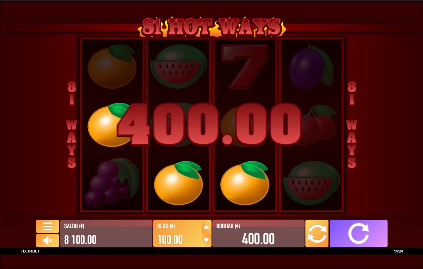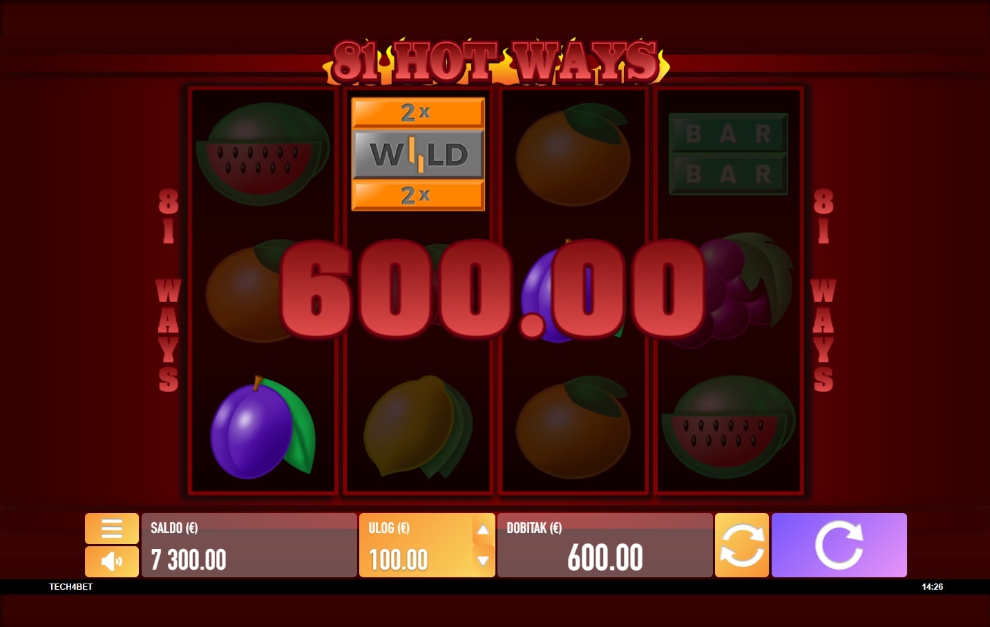 81 Hot Ways slot je igra klasične tematike koja vodi igrača na nezaboravnu avanturu ispunjenu slasnim dobicima. Najveće dobitke donose simboli sedmica, a za njima slijede lubenice i grožđe. Igra uz to sadrži poseban simbol Wilda koji može zamijeniti druge simbole u potrazi za dobicima. Zaigraj 81 Hot Ways te osvoji luksuzne nagrade!