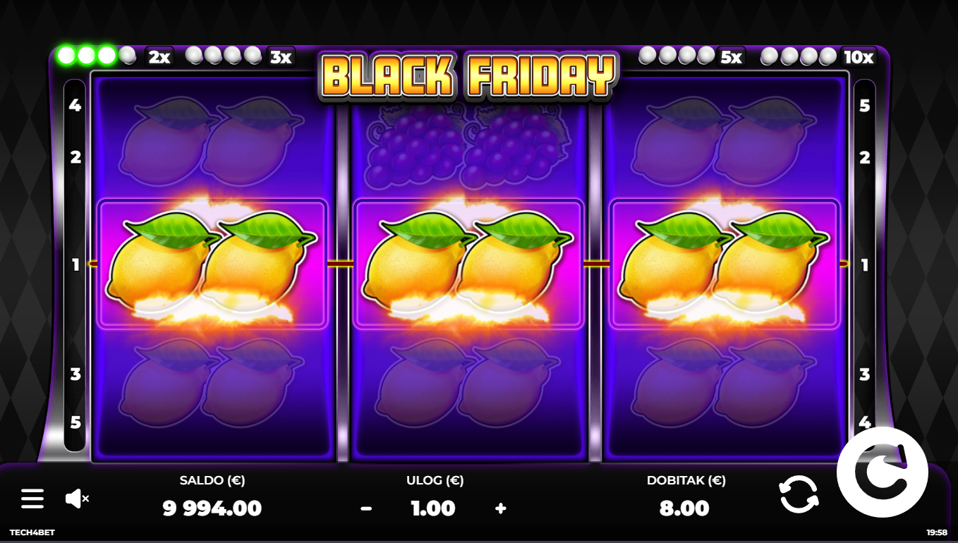 Ne, Black Friday nema progresivni jackpot, ali zahvaljujući wild simbolima i bonus mogućnostima može donijeti velike nagrade.
