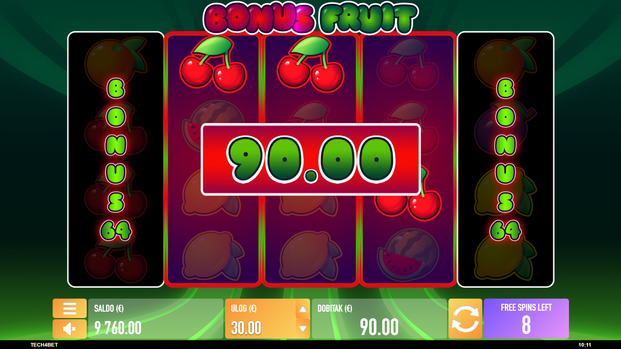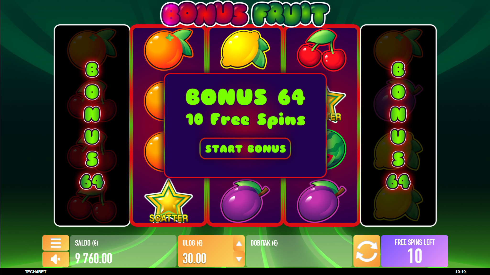 Bonus Fruit vodi svoje igrače kroz fantaziju voćnih okusa začinjenu motivima zlata i bogatim wild simbolima. Primamljivo ilustrirano voće jednostavnog dizajna kao i način igranja učiniti će dozu zabave i zanimacije nedostižnom! Kako uzbuđenju tu nebi bio kraj pobrinuti će se wild simbol i igranje pretvoriti u super uzbudljivo te bogato po pitanju dobitaka! Kao jedan od najpopularnijih slotova, Bonus Fruit odličan je izbor za sve igrače koji vole izvrstan omjer rizika i dobitaka.