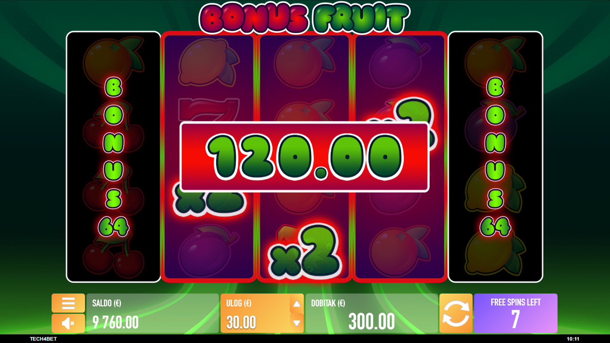 Igra Bonus Fruit ima RTP u iznosu od 95.51%, što znači da igrači imaju dobre šanse za ostvariti dobitak. Volatilnost igre je srednja, što znači da igrači mogu očekivati česte, ali niže dobitke.