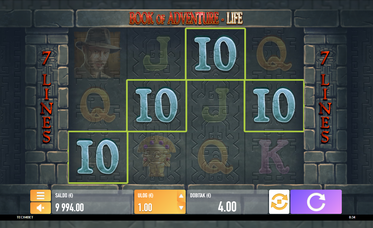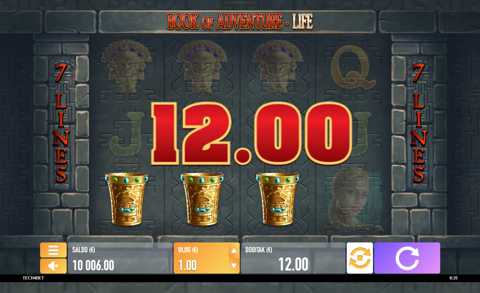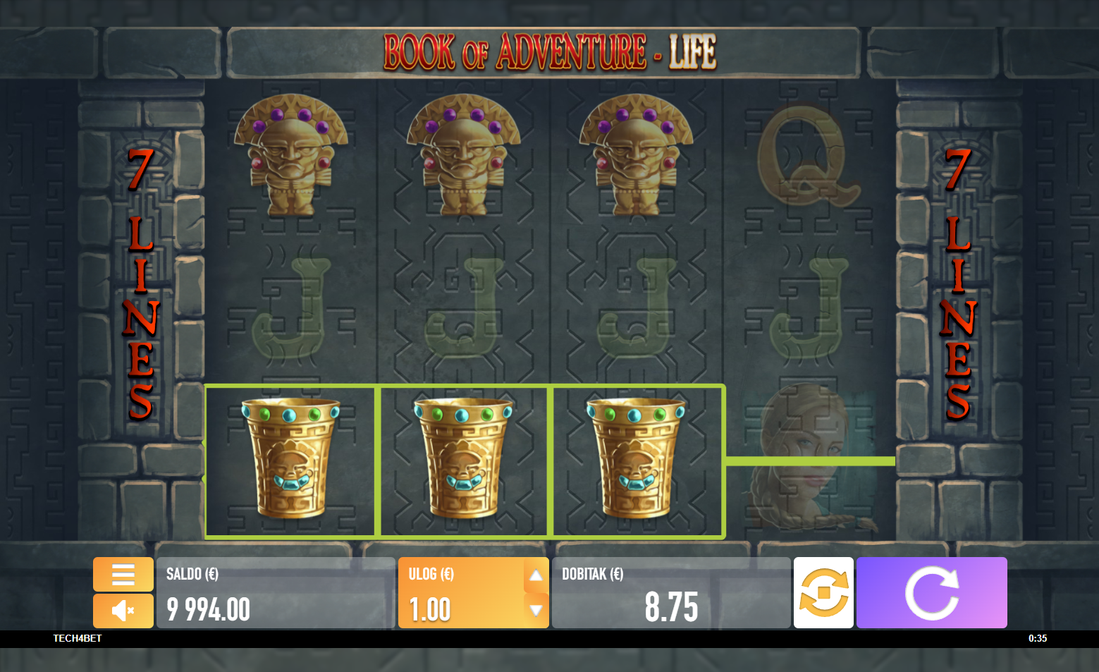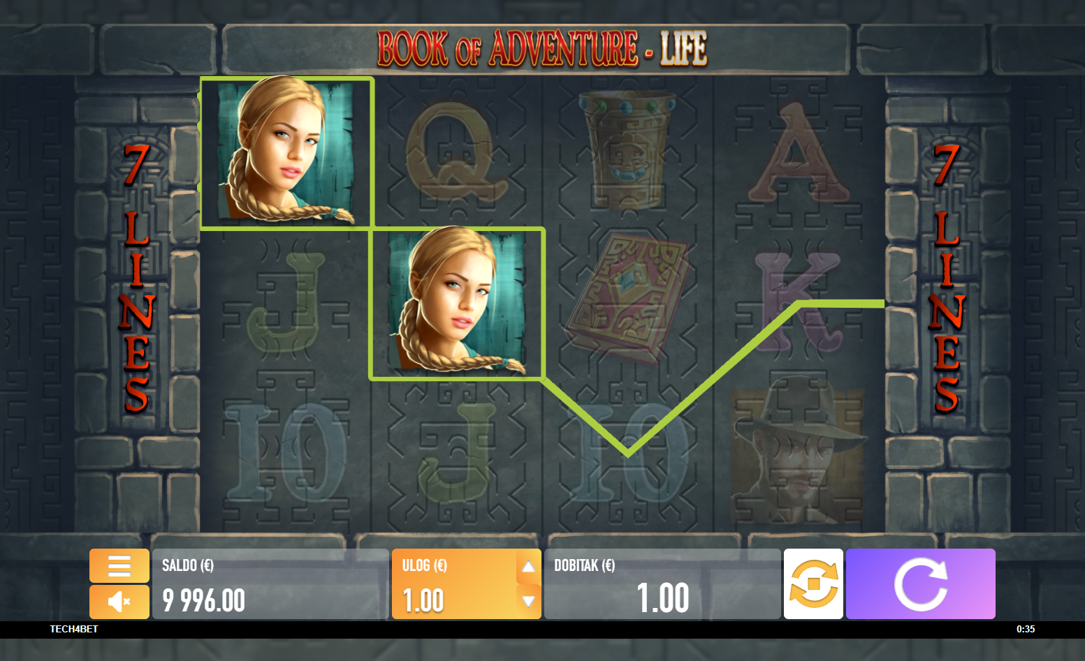 Book of Adventure - Life je dinamična slot igra s četiri valjka i tri reda, nudeći sedam dobitnih linija. Igra pruža uzbuđenje zahvaljujući svom posebnom simbolu knjige (Wild), koji ne samo da nadopunjuje dobitne kombinacije već ti donosi i 10 besplatnih okretanja kada spojiš tri ili više simbola. Tijekom bonus igre, poseban simbol koji se proširuje može značajno povećati tvoje šanse za dobitak, jer se može proširiti na cijeli valjak i donijeti pobjedu bez obzira na poziciju. S dodatnim mogućnostima za dobitak tijekom bonus igara, Book of Adventure - Life nudi jedinstveno i uzbudljivo iskustvo igranja.