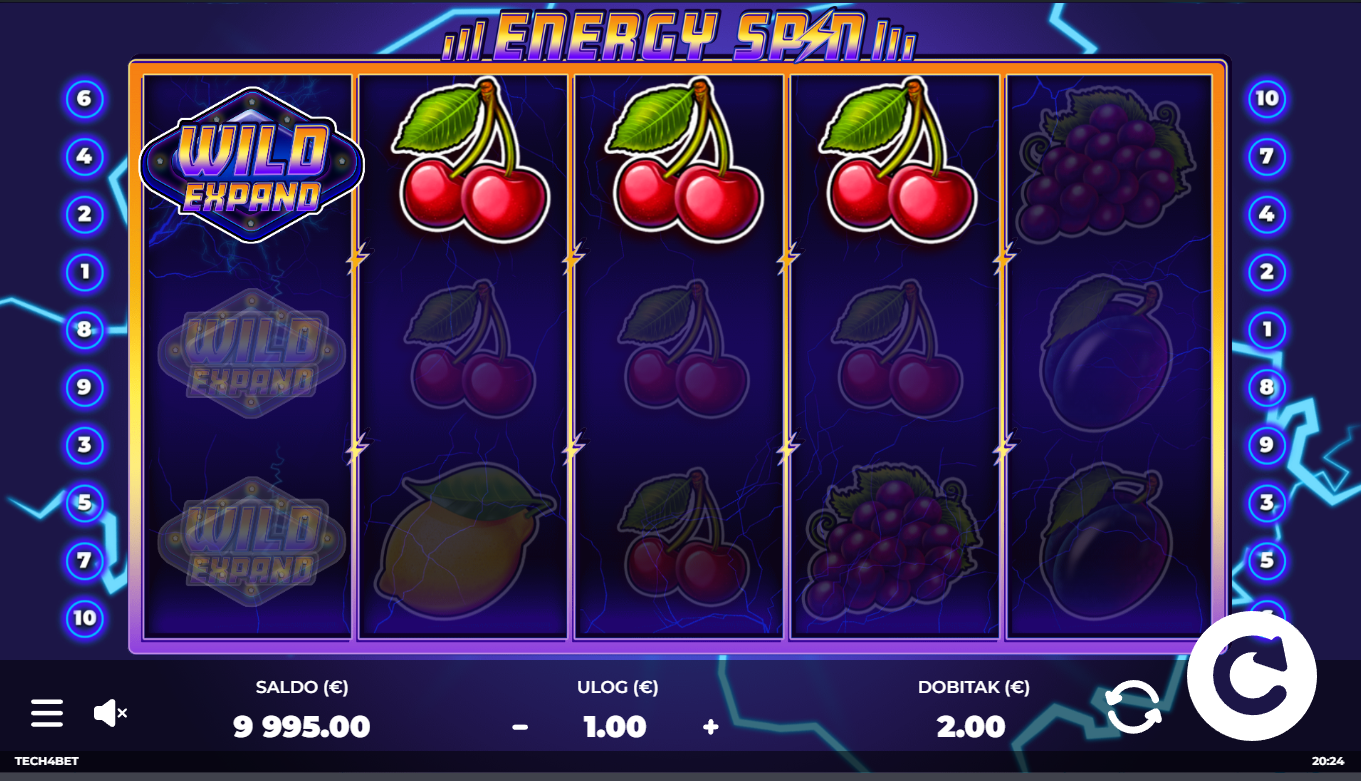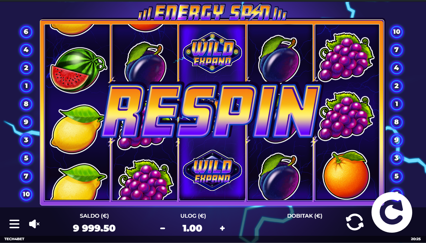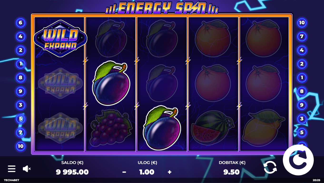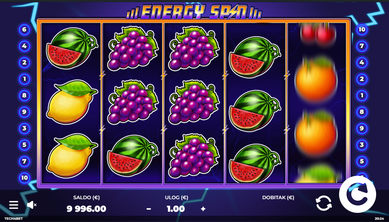 Energy Spin od Tech4Bet je brza, eksplozivna slot igra koja pršti energijom, bojama i adrenalinskim momentima. Koluti su puni neon simbola, bljeskova i efekata koji stvaraju osjećaj kao da si u futurističkom kasinu. Igra je dizajnirana tako da svaki spin izgleda kao energetski prasak, a dinamika ne popušta ni sekunde. Vizuali su moderni, fluidni i puni intenziteta. Ako voliš slotove koji te odmah dignu i ostave bez daha, ovo je igra koja puni baterije.