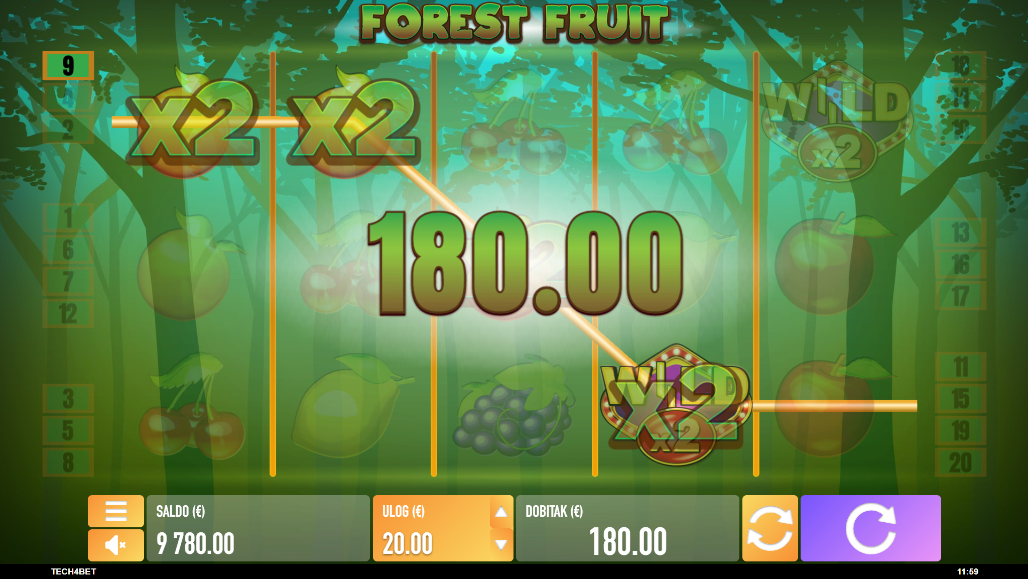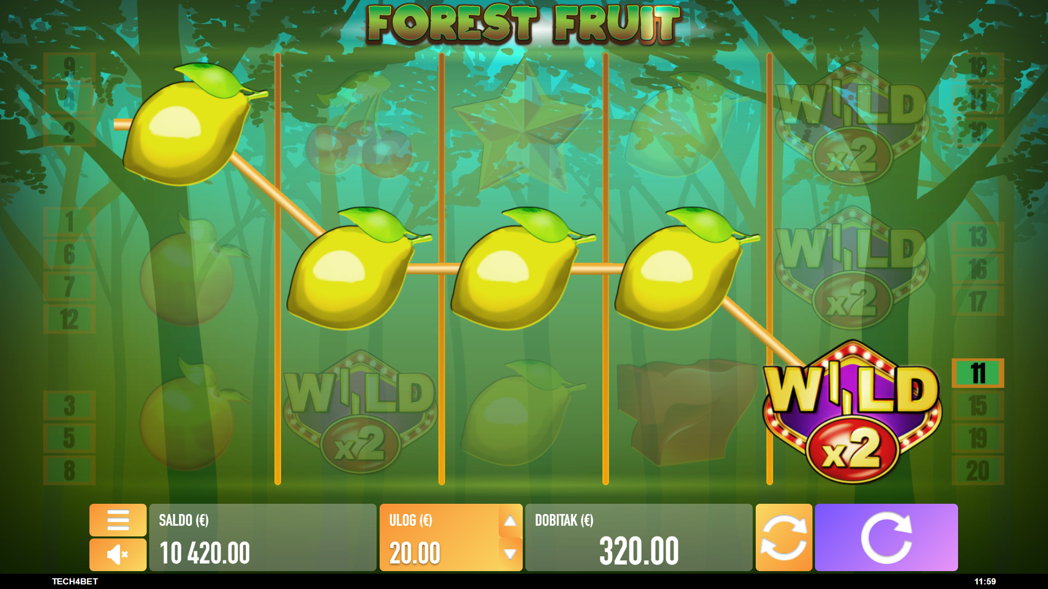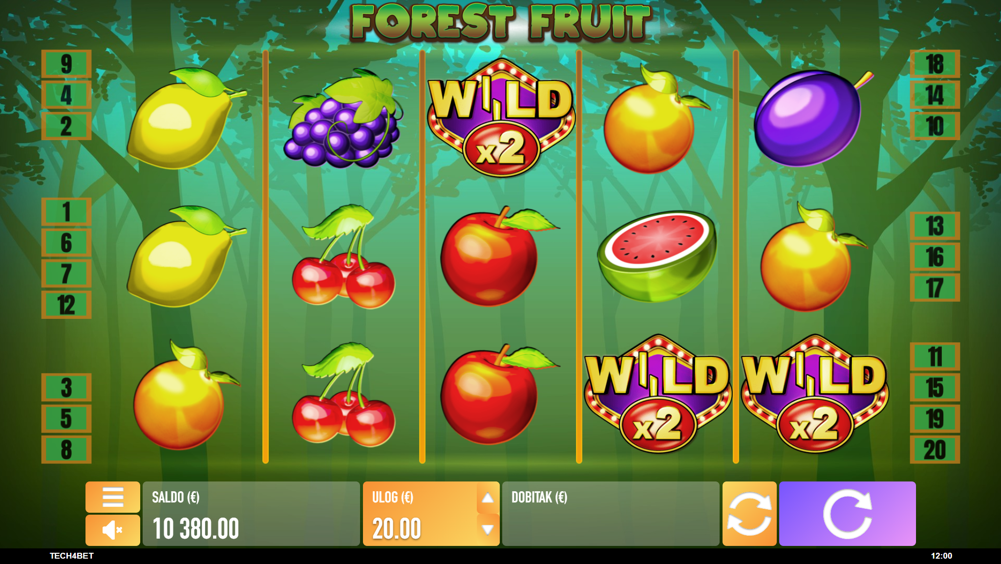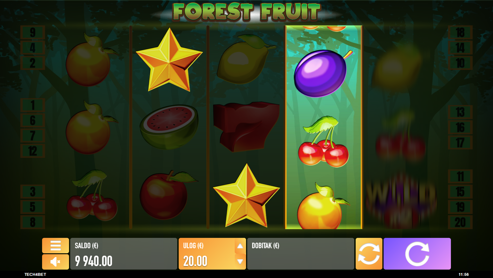 Forest Fruit vodi svoje igrače kroz fantaziju voćnih okusa začinjenu motivima zlata i bogatim wild simbolima. Primamljivo ilustrirano voće jednostavnog dizajna kao i način igranja učiniti će dozu zabave i zanimacije nedostižnom! Kako uzbuđenju tu nebi bio kraj pobrinuti će se wild simbol i igranje pretvoriti u super uzbudljivo te bogato po pitanju dobitaka! Kao jedan od najpopularnijih slotova, Forest Fruit odličan je izbor za sve igrače koji vole izvrstan omjer rizika i dobitaka.