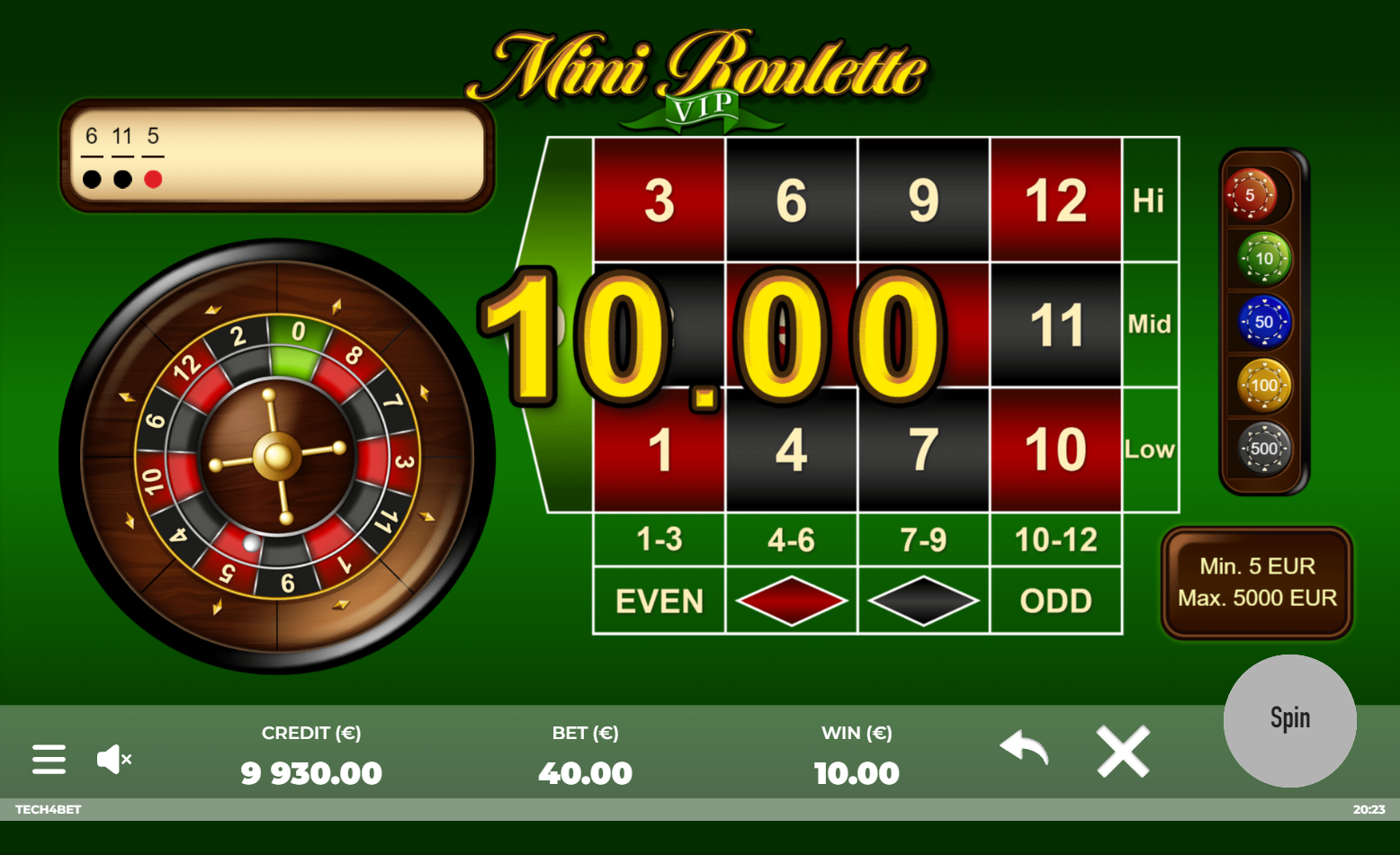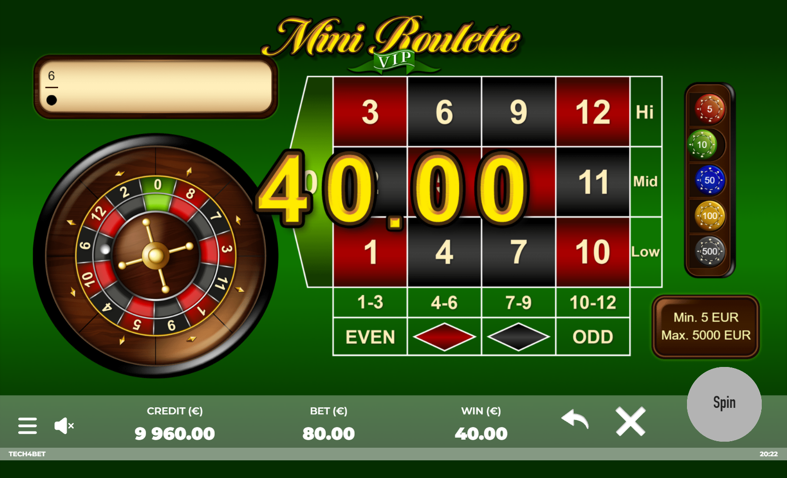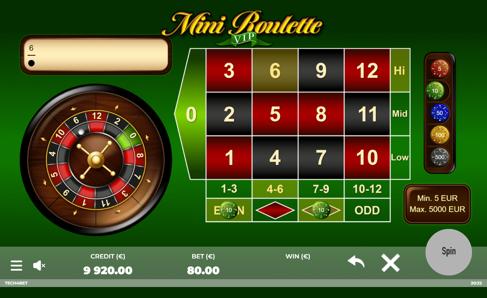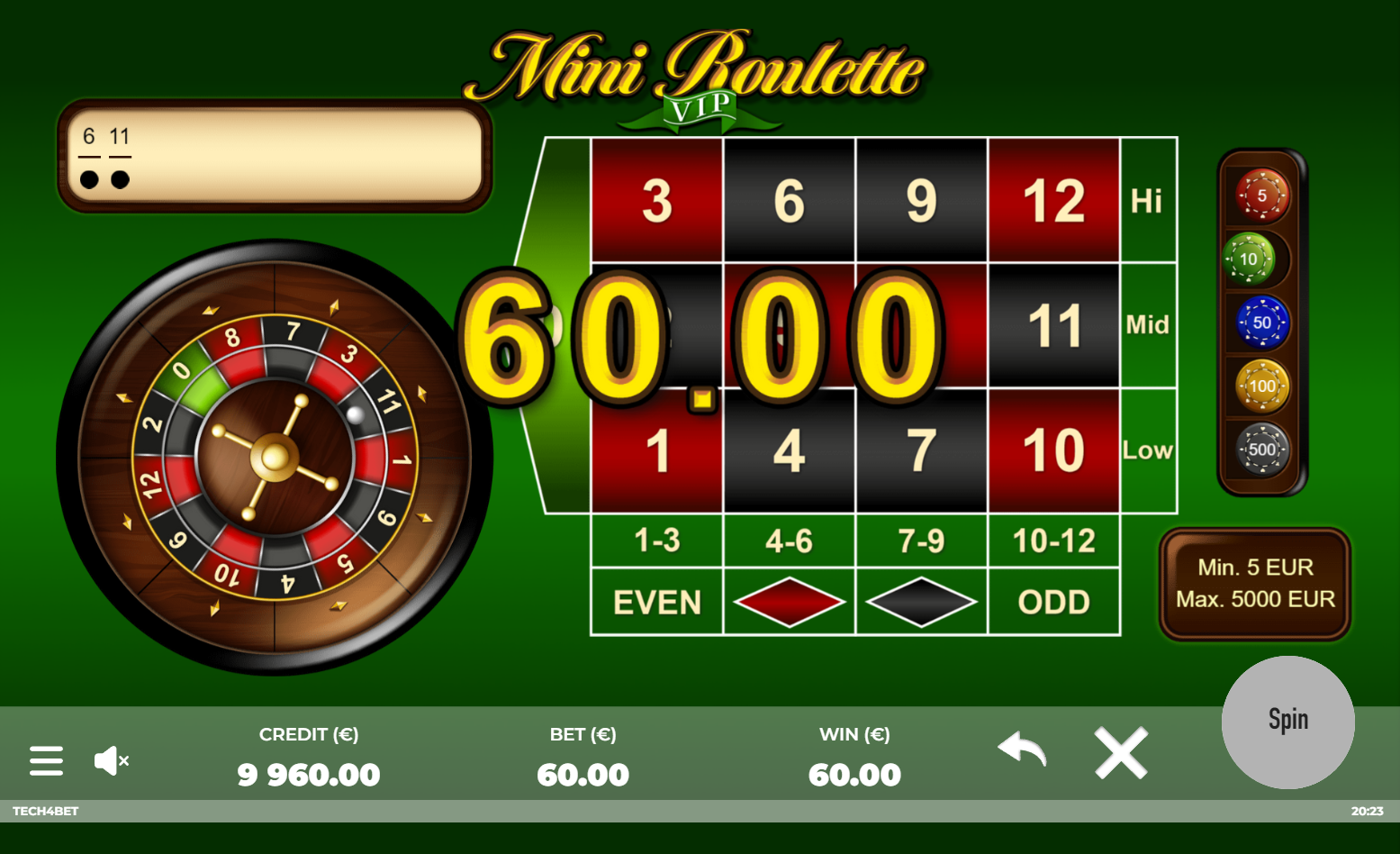U Mini Roulette VIP, možeš birati između unutarnjih i vanjskih ulaganja. Unutarnji ulozi omogućuju ti da staviš ulog na točan broj, par brojeva ili manje skupine brojeva, dok vanjski ulozi pokrivaju veće skupine poput crvenih/crnih brojeva ili parnih/neparnih brojeva. Igra je jednostavna za korištenje — samo postavi svoje uloge pomoću kovanica i zavrti ruletni kotač. Zlatna Runda, koja se aktivira nasumično, udvostručuje sve dobitke, pružajući dodatno uzbuđenje pri svakom okretu.