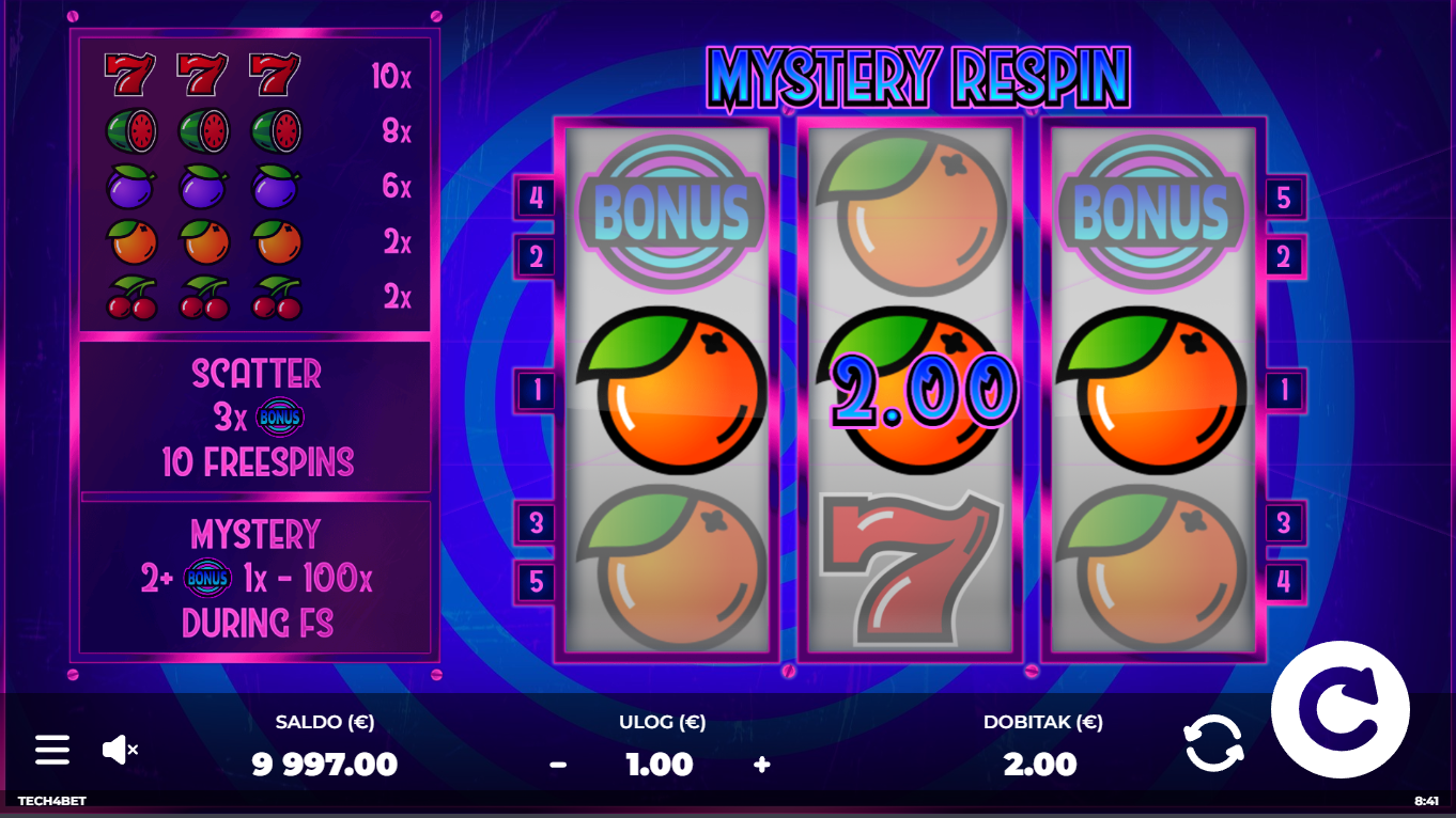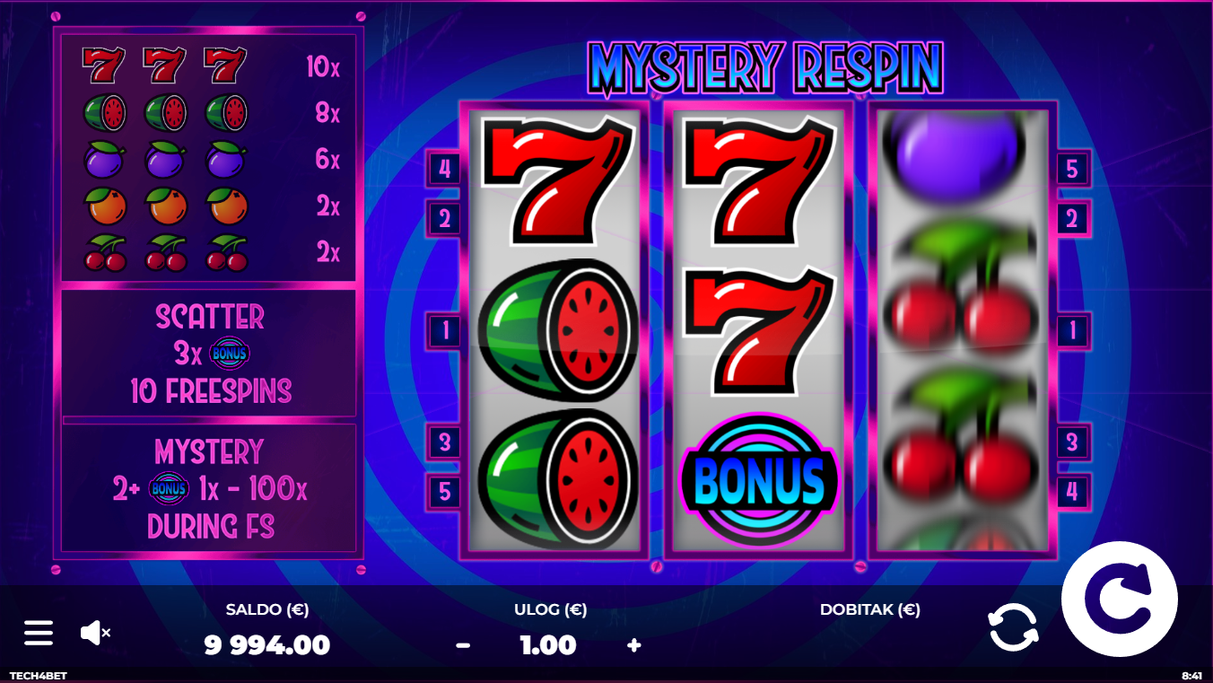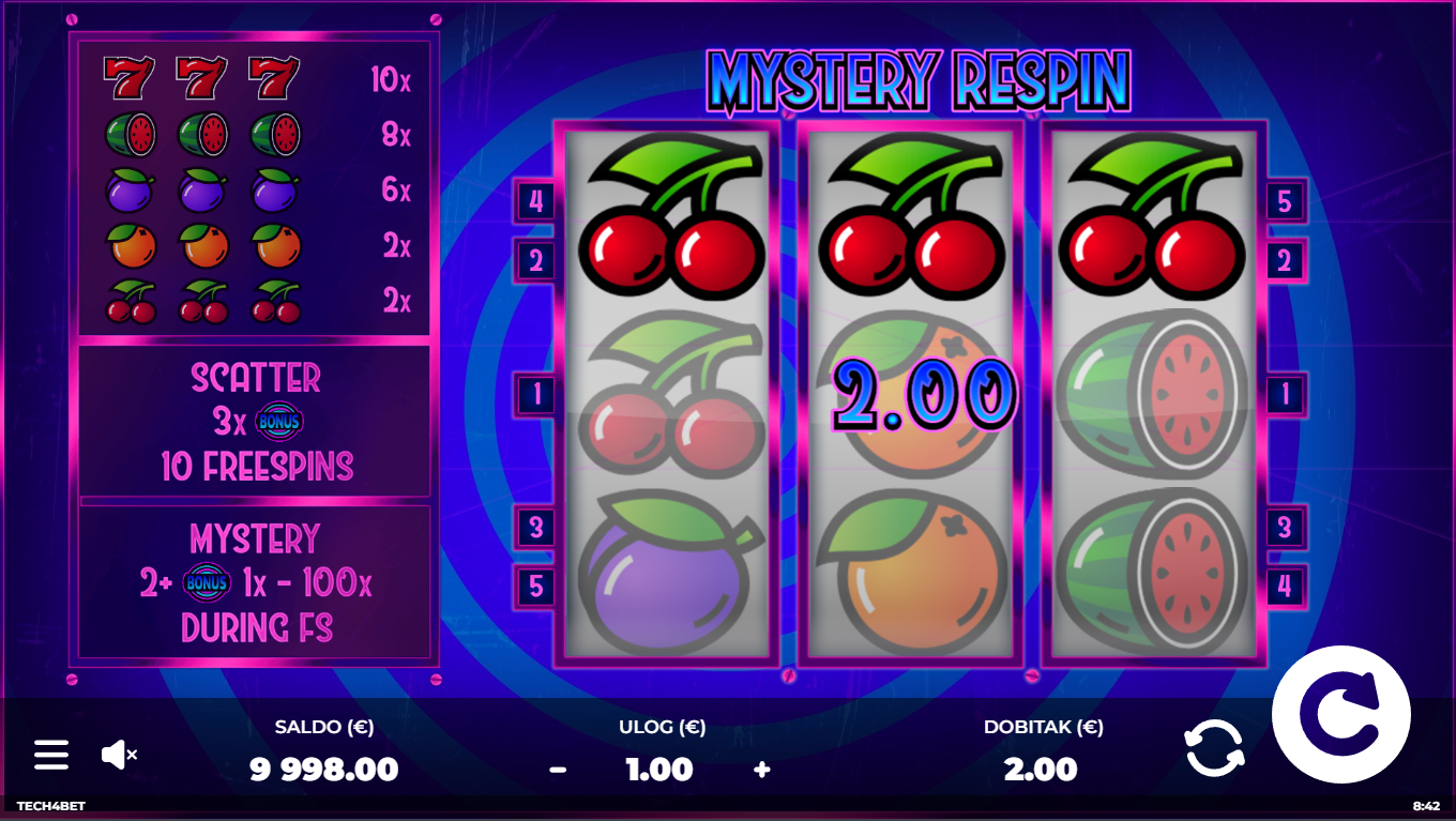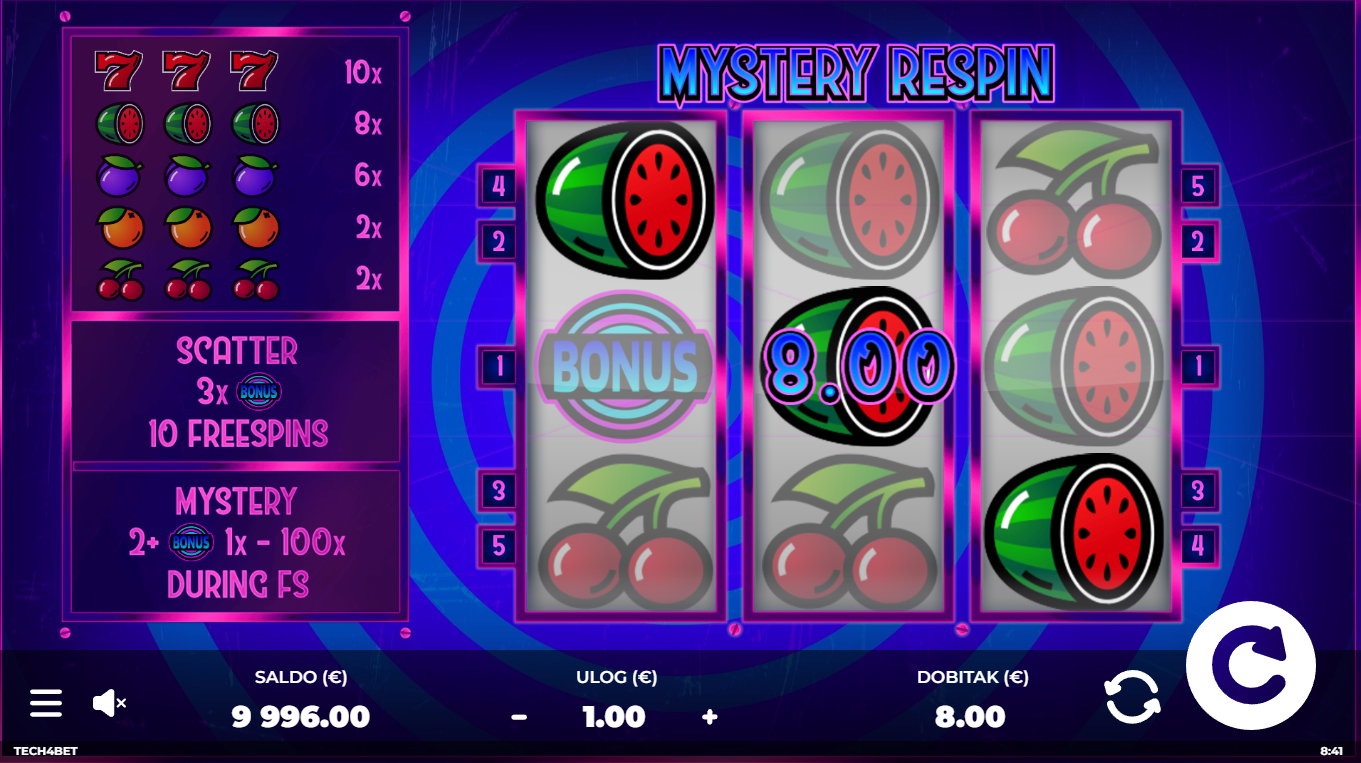 Mystery Respin od Tech4Bet je slot koji živi na neočekivanosti, nikad ne znaš kad će se respin aktivirati i promijeniti cijelu igru. Koluti su ispunjeni klasičnim simbolima voćkica i zvončića, ali misteriozni simboli donose trenutak napetosti. Igra izgleda elegantno, čisto i brzo, bez nepotrebnih komplikacija. Svaki spin ima potencijal da se pretvori u mystery moment. Ako voliš osjećaj iznenađenja i instant adrenalina, ovo je slot za tebe.