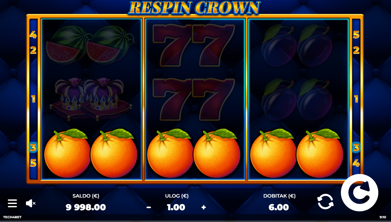 Respin Crown ima RTP od 96%, što je standardno za Tech4Bet slotove i predstavlja dobar povrat tijekom dugog igranja. Volatilnost je srednja do visoka, ne pobjeđuje se u svakom spinu, ali velike isplate dolaze kroz respin funkciju. Savršeno za sve koji žele balans između rizika i nagrade.