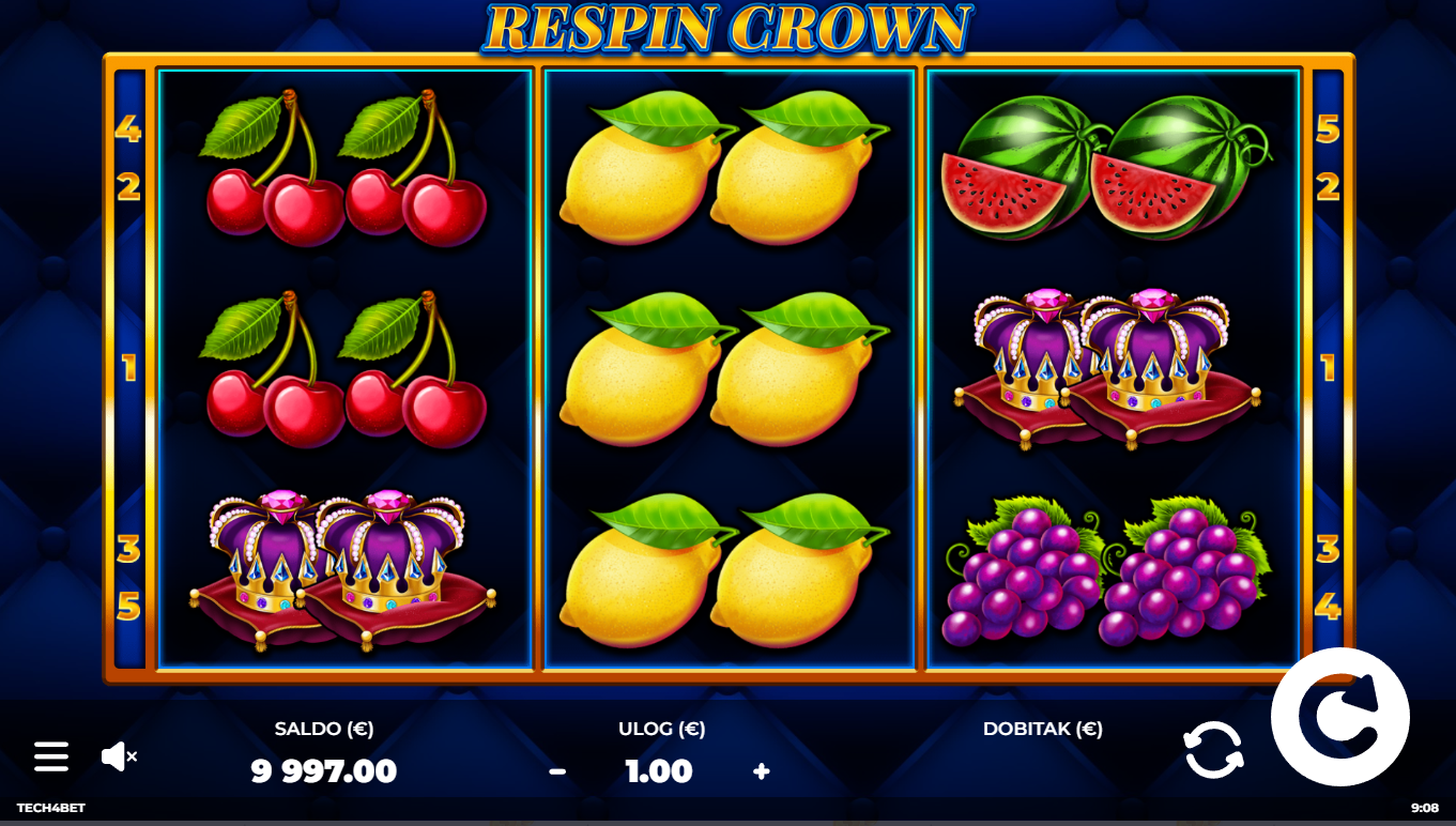 Respin Crown od Tech4Bet kombinira luksuz i jednostavnost: krune, zlato i voćkice pretvaraju svaki spin u kraljevsku šansu za dobitak. Igra ima klasičnu voćnu estetiku, ali s premium vizualima i jasnim, blještavim efektima. Najvažniji simbol je kruna, jer ona može aktivirati posebne respin trenutke. Igra je brza, elegantna i puna potencijala za iznenadne dobitke. Ako voliš voćne slotove s moćnim bonusima, ovo je prava kraljevska poslastica.