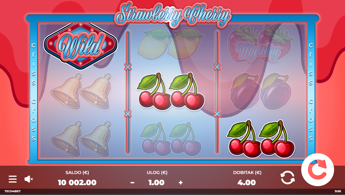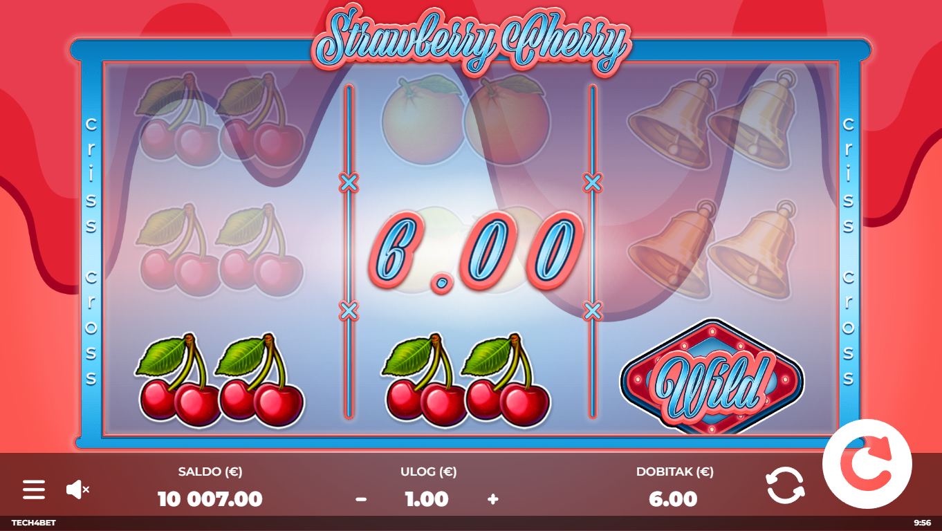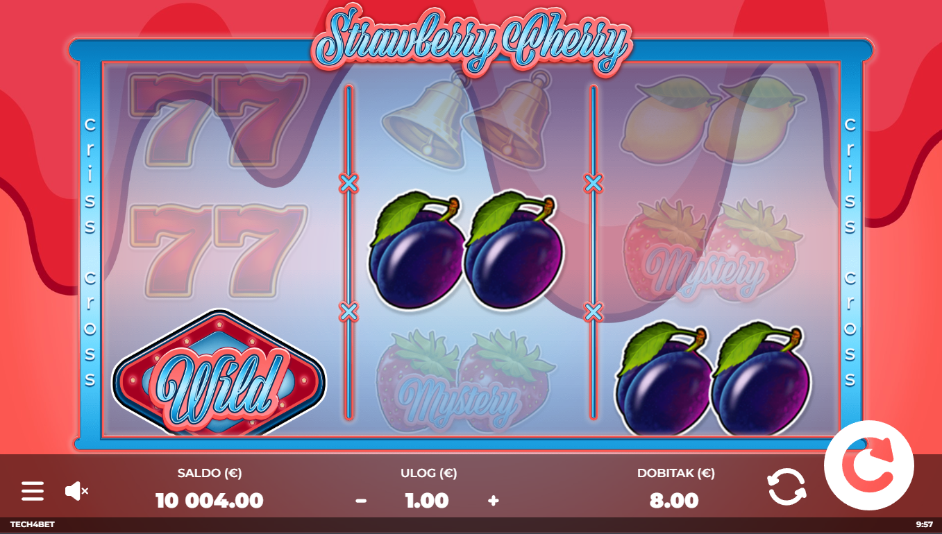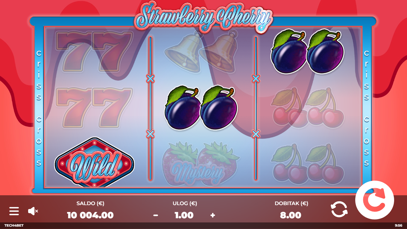 Strawberry Cherry od Tech4Bet je svježa voćna eksplozija na kolutima: jagode, trešnje i ostale voćkice pretvaraju svaki spin u slatku slot poslasticu. Igra izgleda jednostavno, ali nudi iznenađujuće česte isplate i brzu dinamiku. Simboli su sjajno dizajnirani, kao da su upravo ubrani s voćnjaka, a atmosfera je lagana i opuštajuća. Fokus je na čistoj slot akciji bez komplikacija. Savršena igra za one koji žele voćni klasik s modernim sjajem.