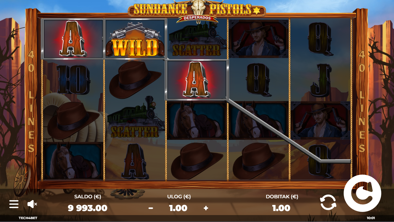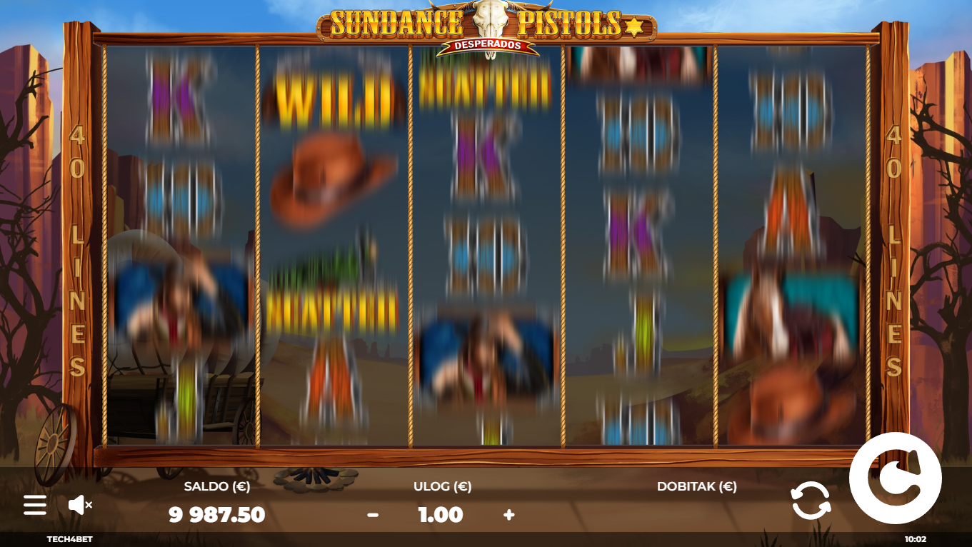 Sundance Pistols od Tech4Bet vodi te pravo na Divlji zapad gdje bande, revolveri i vlakovi puni zlata čine svaki spin napetim kao obračun u podne. Koluti su smješteni u vagonu, dok se iza njih prostire pustinjski pejzaž i tipična western atmosfera. Glavni simboli su šeširi, konji i opasni desperadosi, a Wild simbol predstavlja ukrštene pištolje. Igra je brza, vizualno impresivna i puna akcije. Ako voliš kaubojske teme i slotove s karakterom, ova igra puca na velike dobitke.