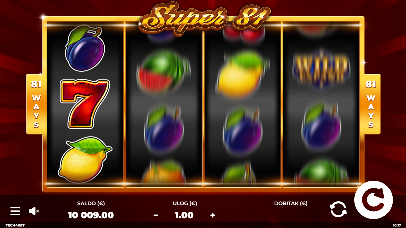 Odaberi ulog, zavrti kolute i pokušaj složiti simbole bilo gdje na 4 koluta, nije bitno gdje se nalaze, jer igra automatski računa sve moguće dobitne kombinacije. Wild simbol pomaže dovršiti kombinacije, a ponekad pretvara slab spin u snažan win. Nema komplikacija, tablica je pregledna, a sve ovisi o brzini i sreći. Igra je idealna za početnike i one koji žele brzu akciju. U Super 81 svaki spin ima potencijal.