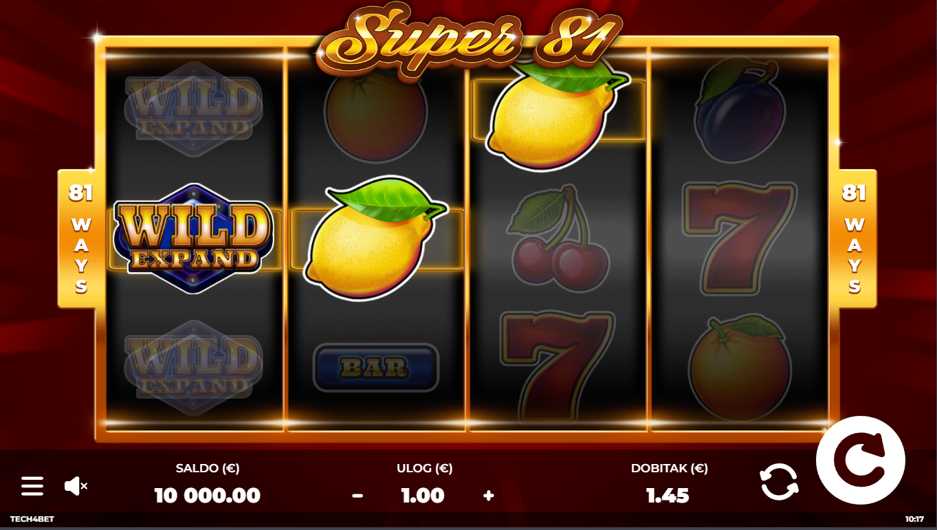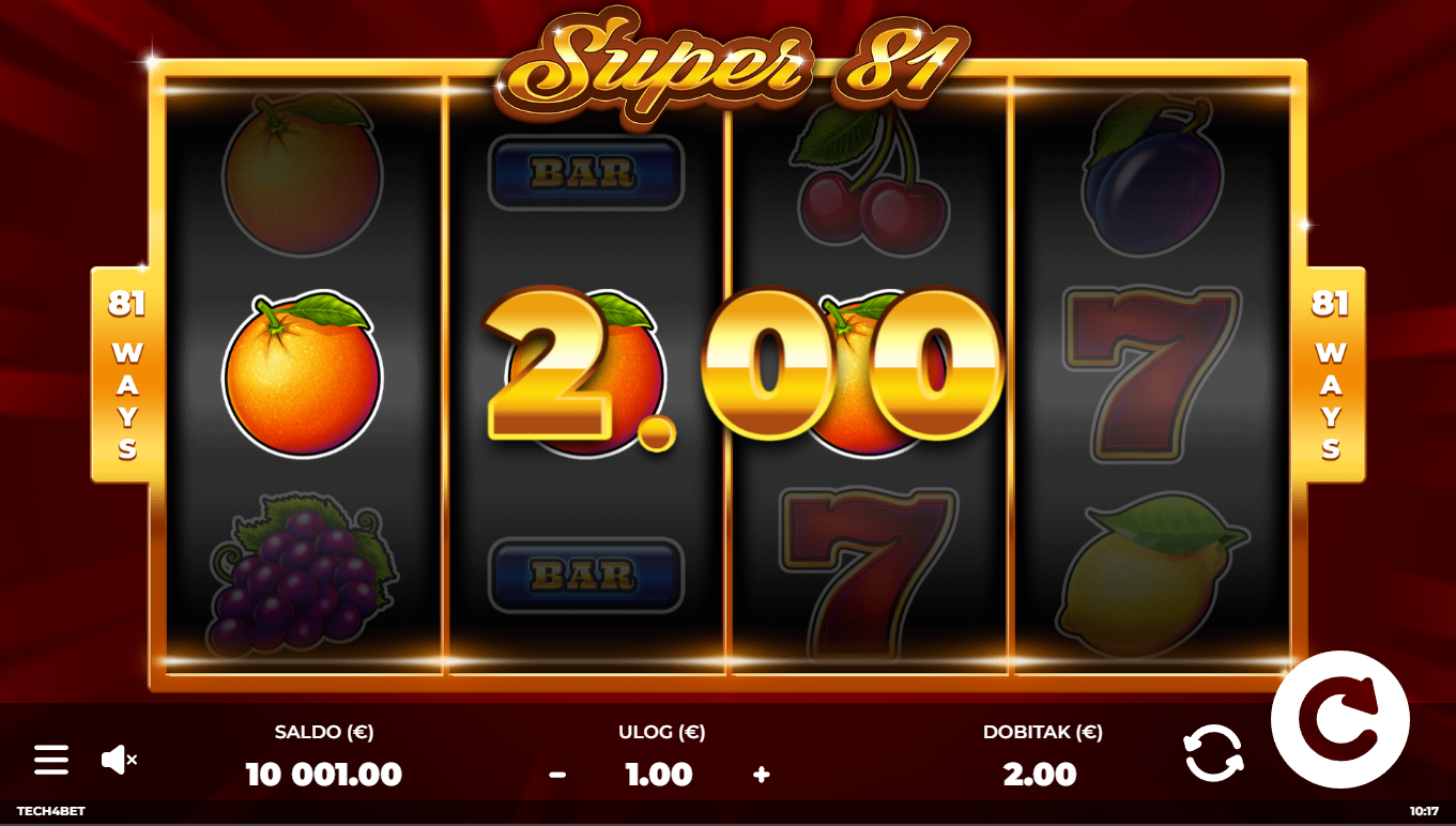 Super 81 od Tech4Bet je klasični voćni slot, ali s twistom: jednostavna igra na 4 koluta koja nudi čak 81 način za dobitak. Grafika je čista i retro, a gameplay brz i direktan, što daje pravi old school casino feeling. Svaki spin može iznenaditi jer se kombinacije slažu na sve strane zahvaljujući 81 win modu. Ako voliš jednostavne, brze i isplative slotove, Super 81 je točno ono što ime obećava.