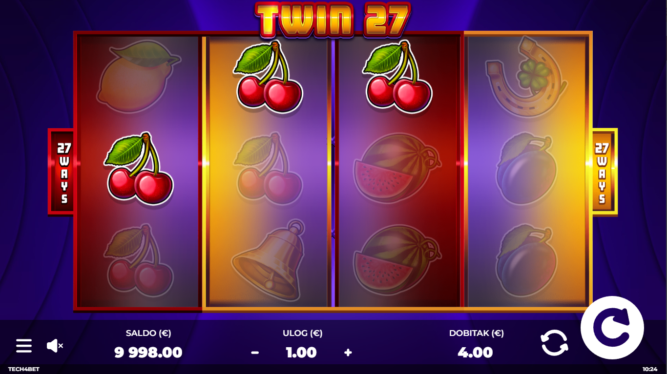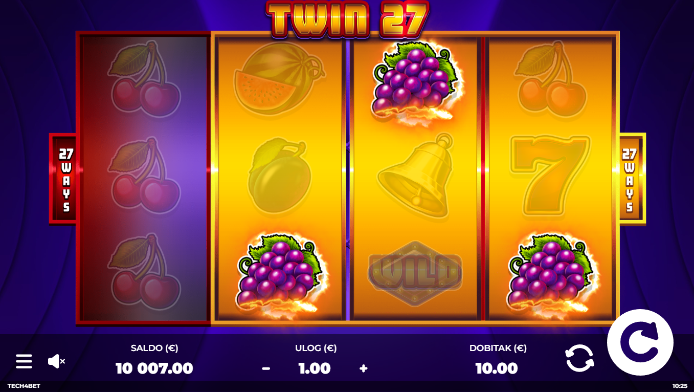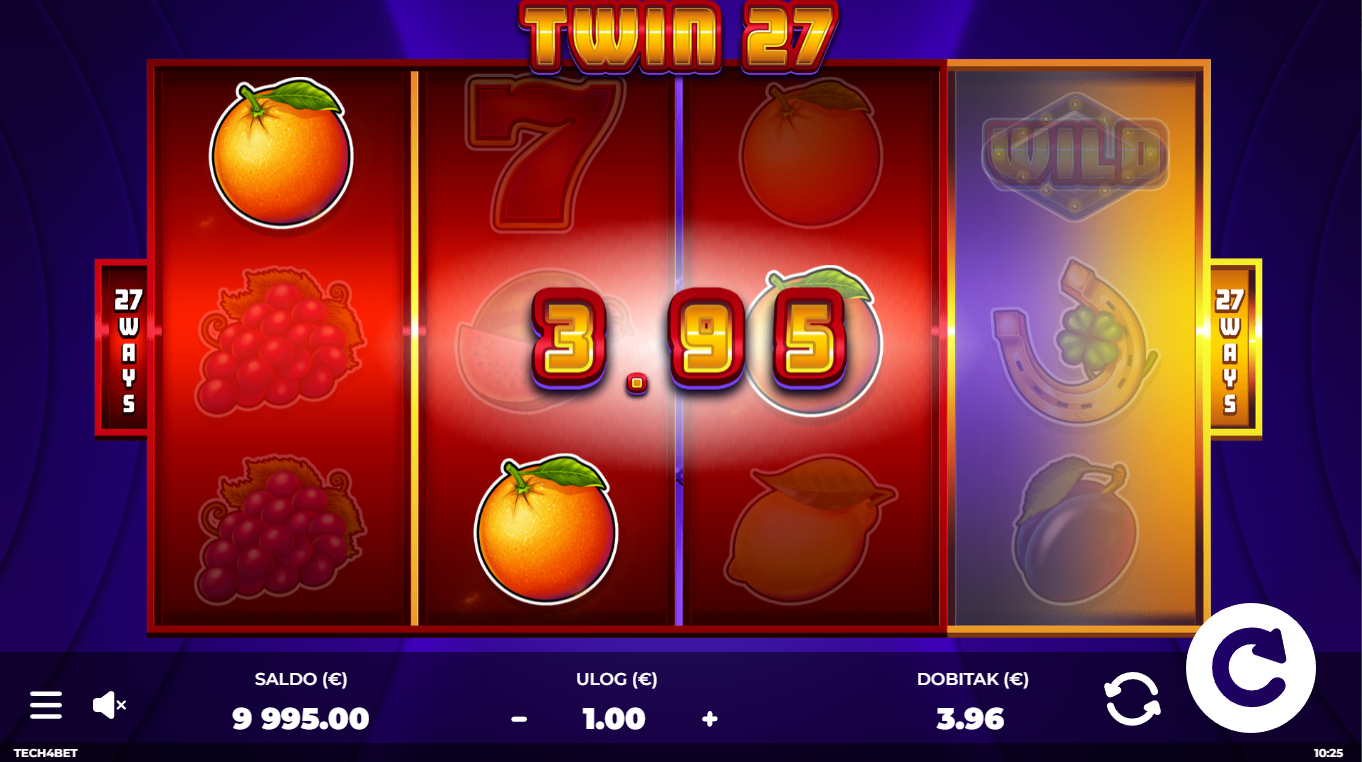 Twin27 ima RTP od 96.04%, što je vrlo solidno za klasični voćni slot s 27 načina dobitka. Volatilnost je srednja, što znači da možeš očekivati česte manje dobitke, uz povremene veće hitove kada se simbole poklope na oba seta koluta. Savršeno za igrače koji vole ravnotežu između rizika i stabilnih isplata.