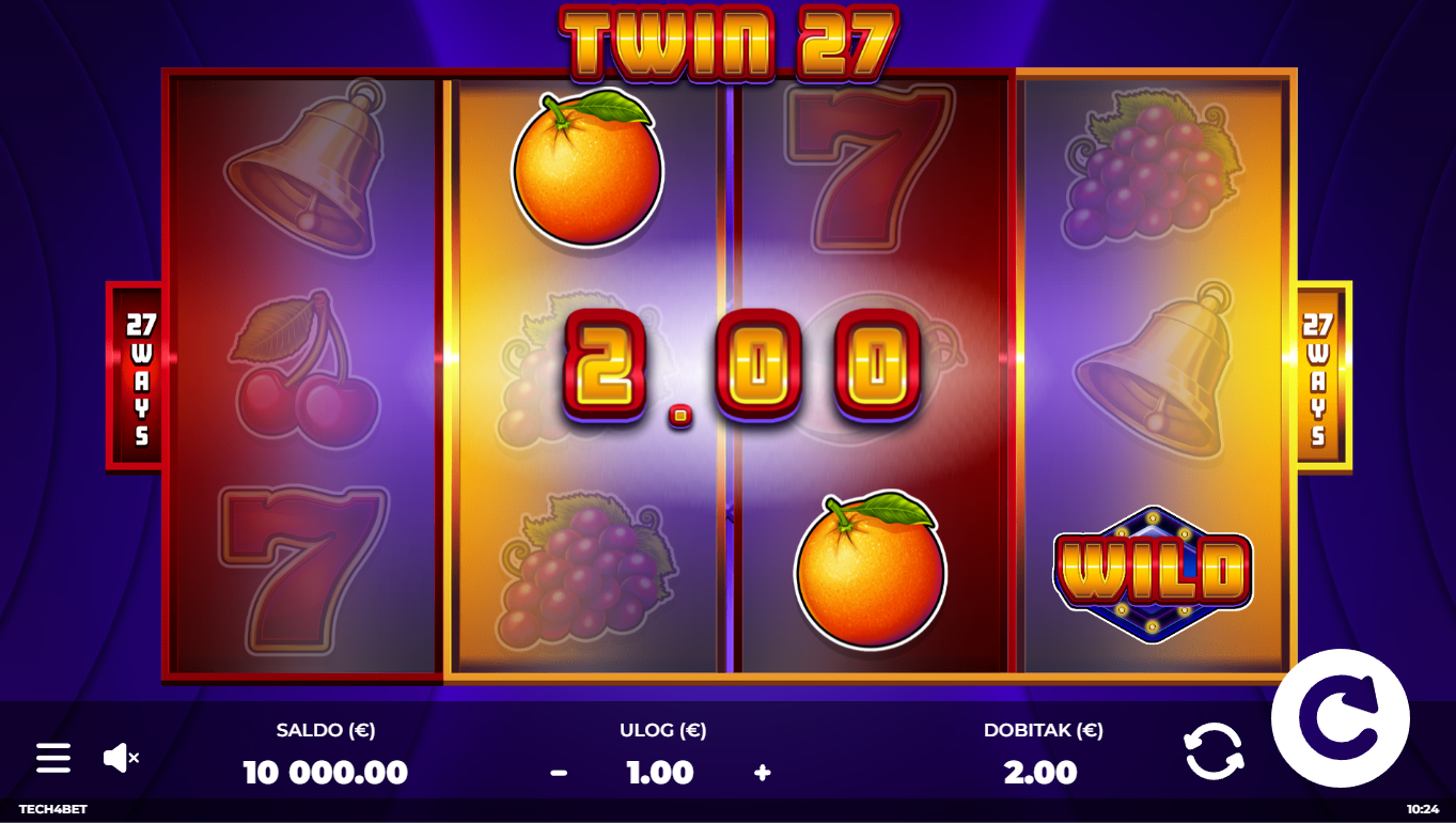Twin27 od Tech4Bet je brz i jednostavan voćni slot koji donosi dvostruku akciju,dva setakoluta i ukupno 27 načina dobitka. Igra vizualno izgleda kao klasična voćkica, ali twist je u tome što se koluti udvostručuju, pa se čini kao da igraš dva slota istovremeno. Svaki spin može iznenaditi dvostrukim isplatama koje se zbrajaju. Wild simbol doprinosi stvaranju jakih kombinacija i dodatno pojačava tempo igre. Ako želiš jednostavnost, ali s dvostrukim adrenalinom, Twin27 je pravi izbor.