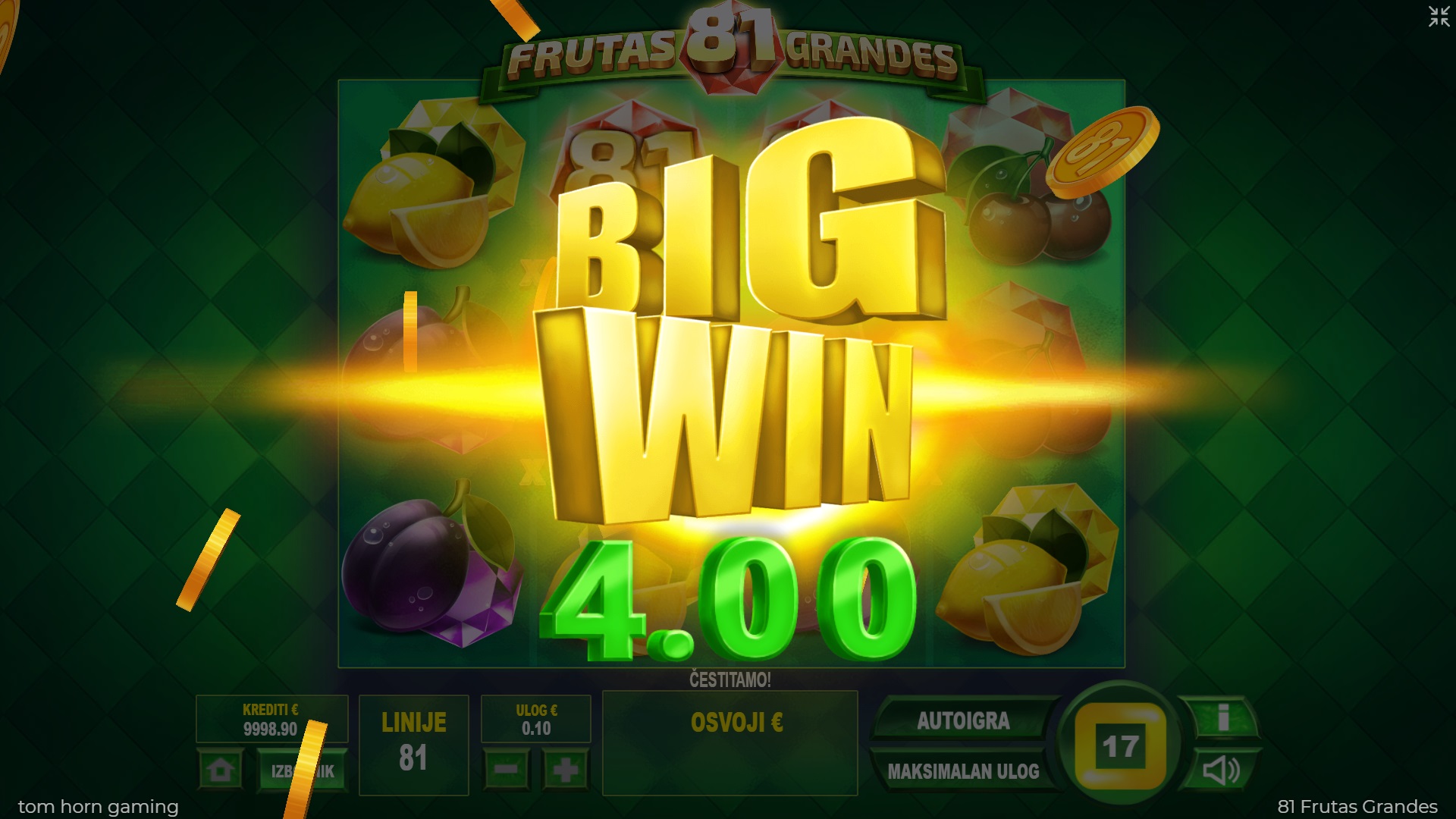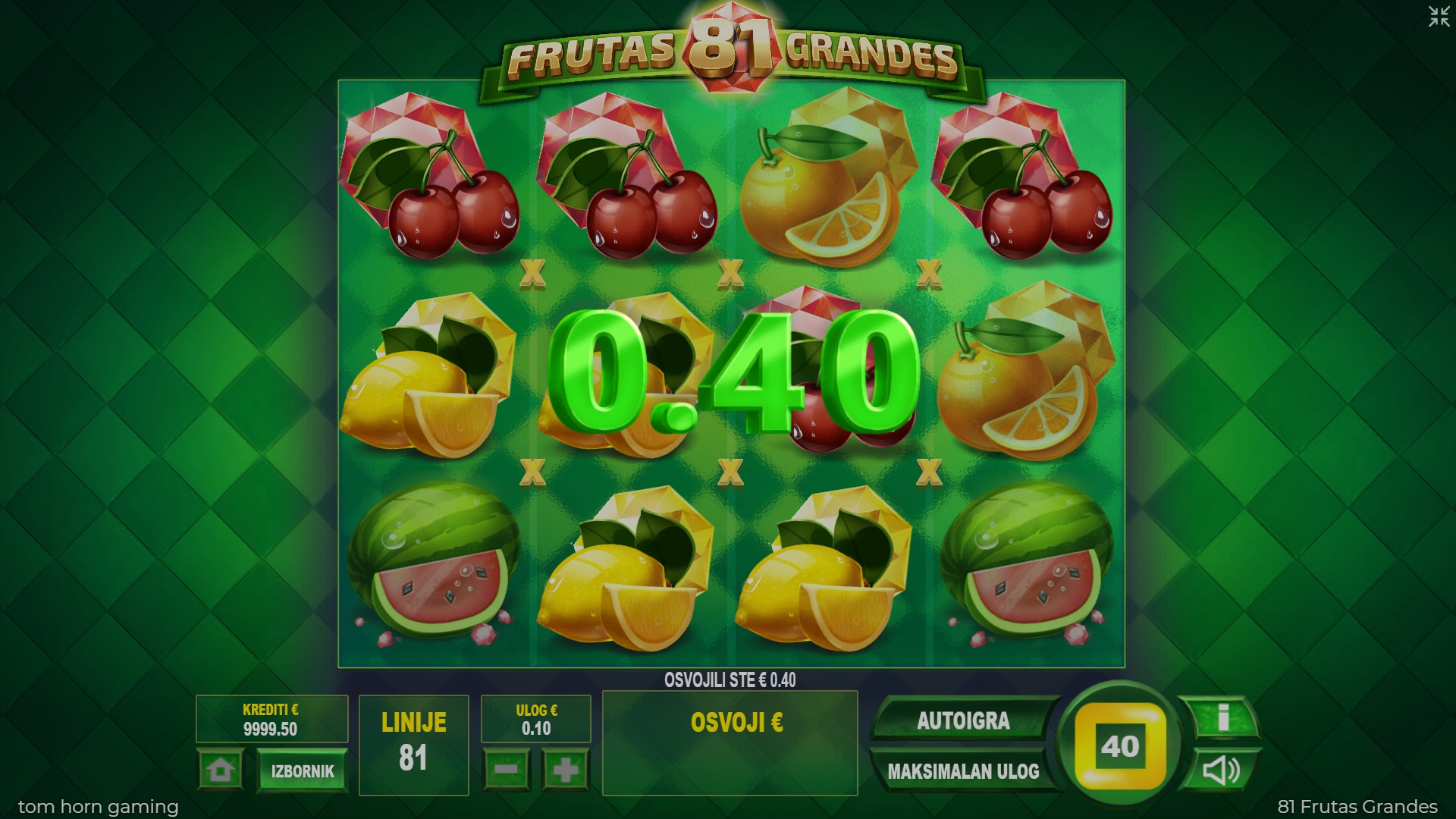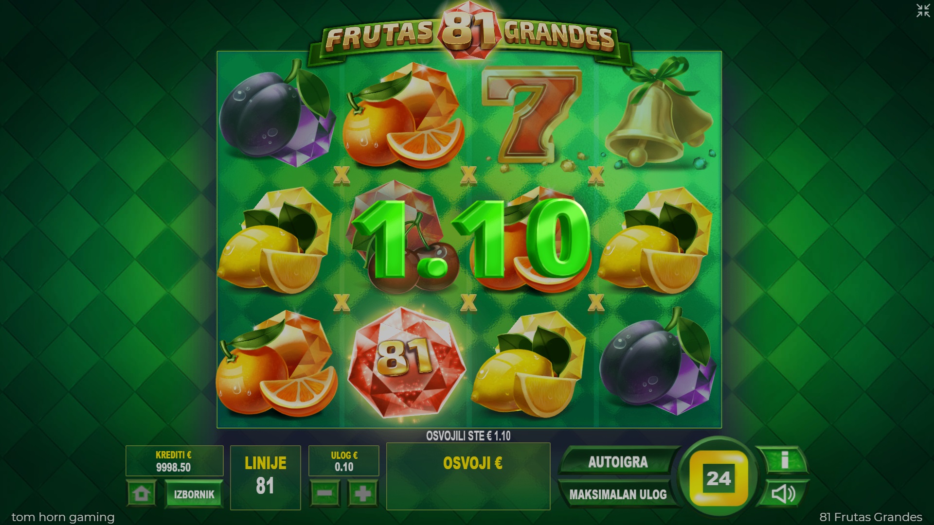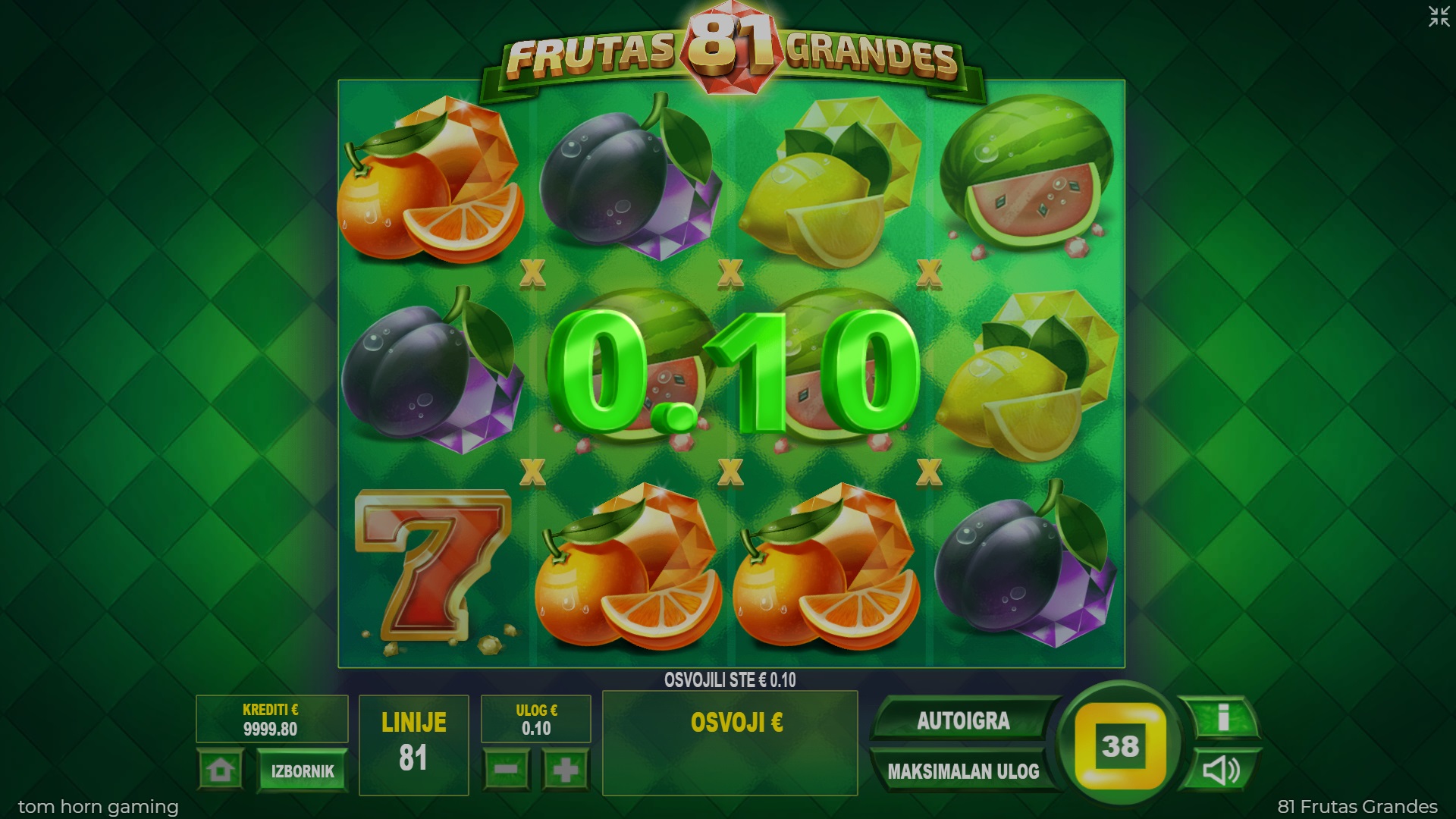 Dobrodošli u šareni svijet video automata 81 Frutas Grandes, gdje voće donosi sreću i dobitke. Ova zanimljiva igra s pet rotirajućih bubnjeva nudi ti 81 liniju za dobitak i devet simbola koji svaki spin čine uzbudljivim. Posebni simbol Wild tu je da ti pomogne ostvariti veće dobitke, zamjenjujući sve druge simbole i udvostručujući dobitne linije. Ako voliš jednostavne, ali uzbudljive igre, 81 Frutas Grandes pružit će ti sate zabave i priliku za osvajanje bogatih nagrada. Uz razne mogućnosti i značajke, poput opcije gamble, svakim spinom povećavaš šanse za uspjeh. Igra je idealna za ljubitelje klasičnih automata koji žele osjetiti uzbuđenje pri svakom okretanju bubnjeva.