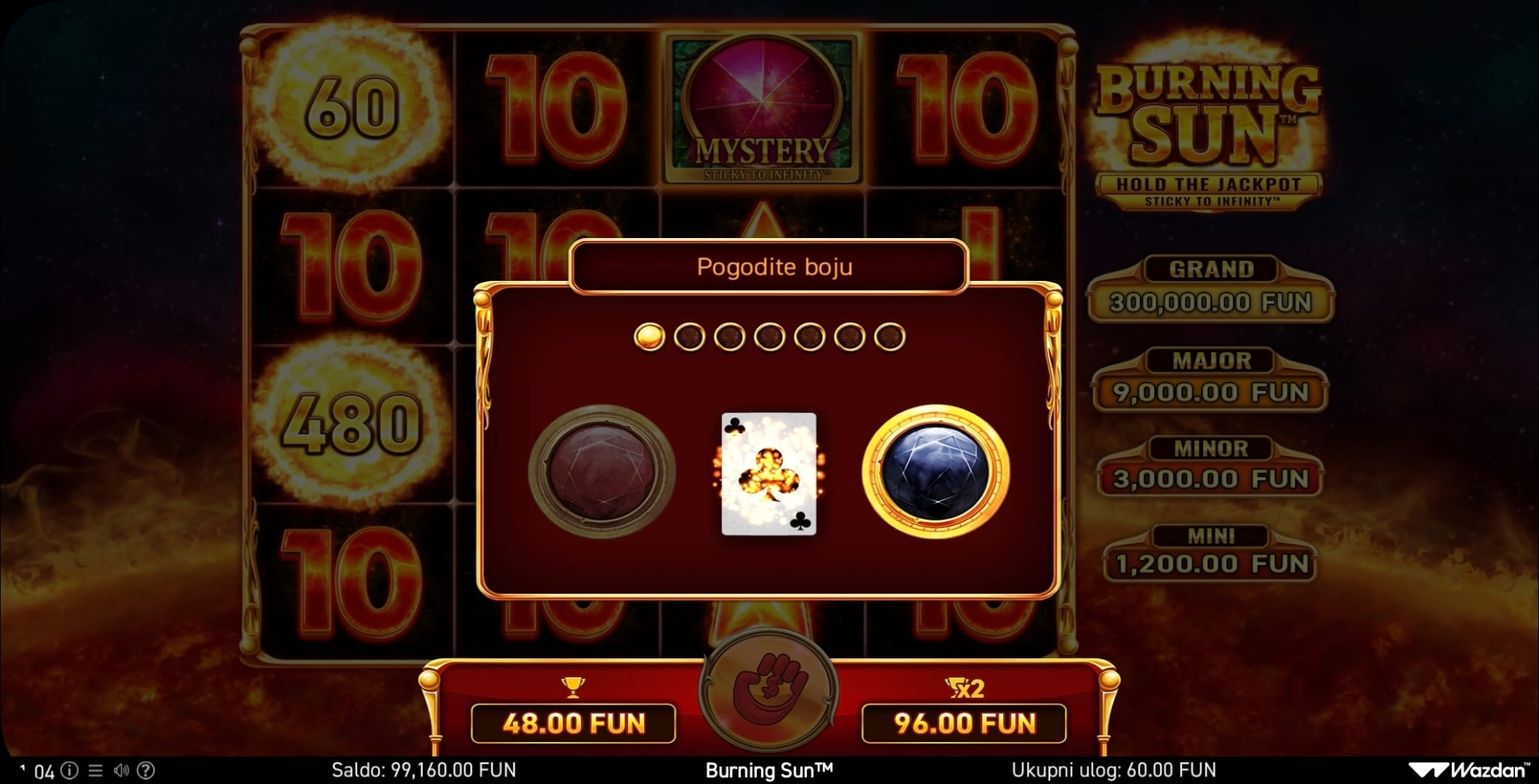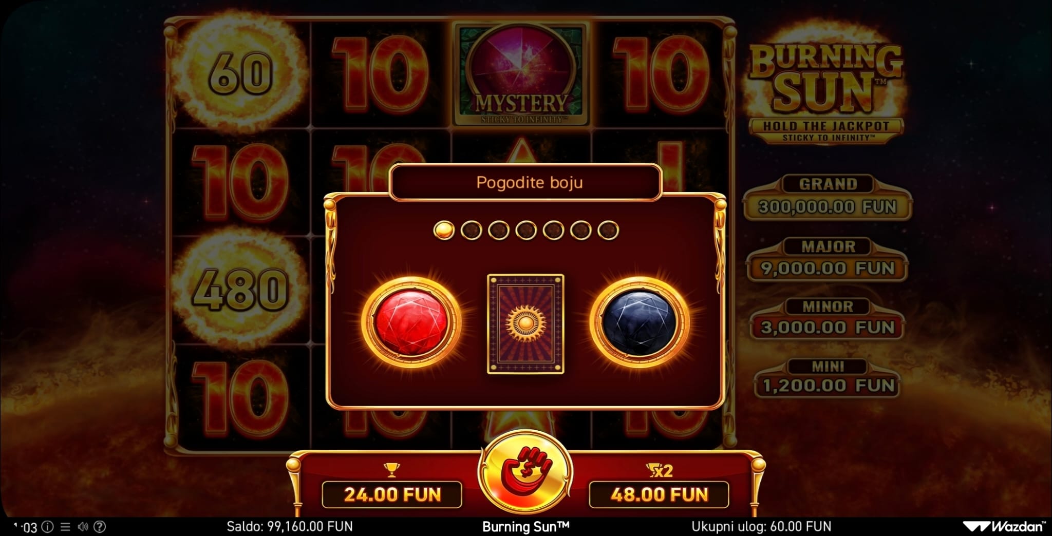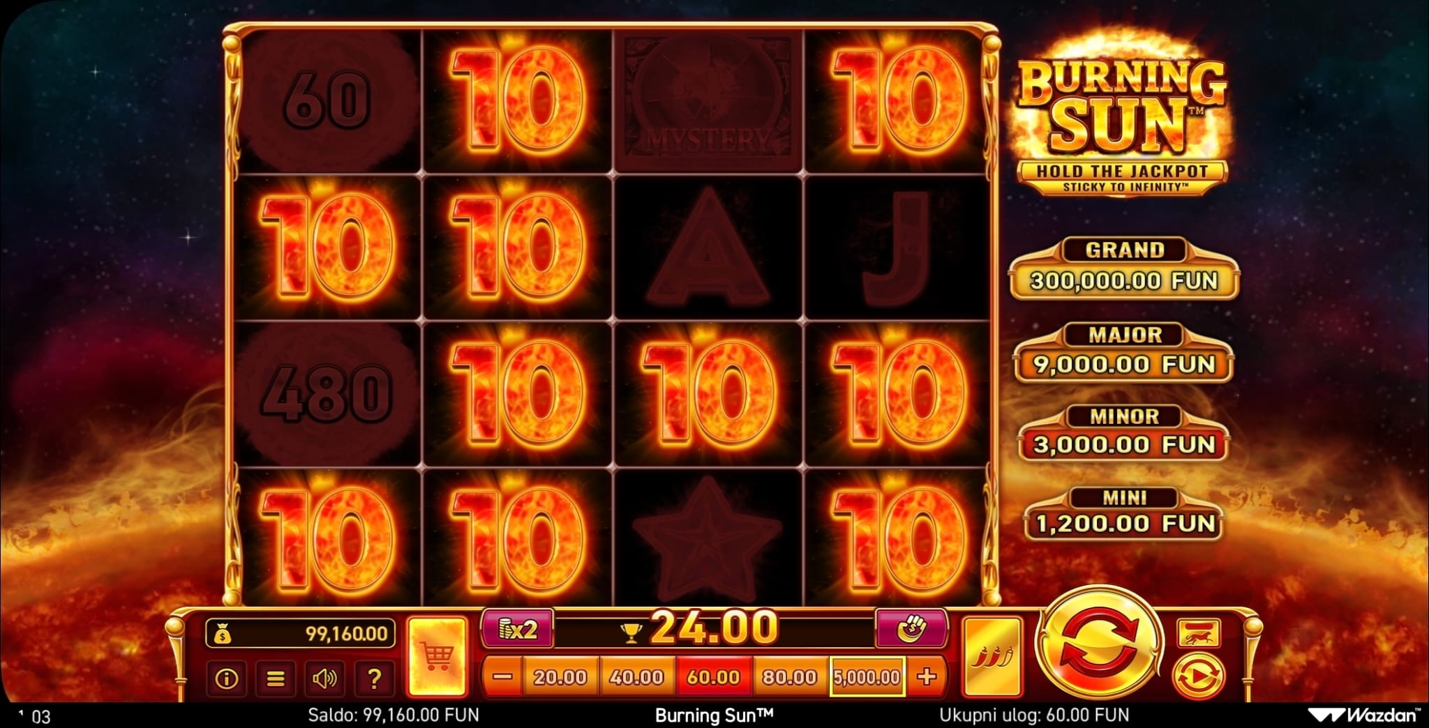 dobitke ostvarujete skupljanjem 10 ili više istih simbola bilo gdje na ekranu. Kao i sve igre ovog providera, i Burning Sun ima