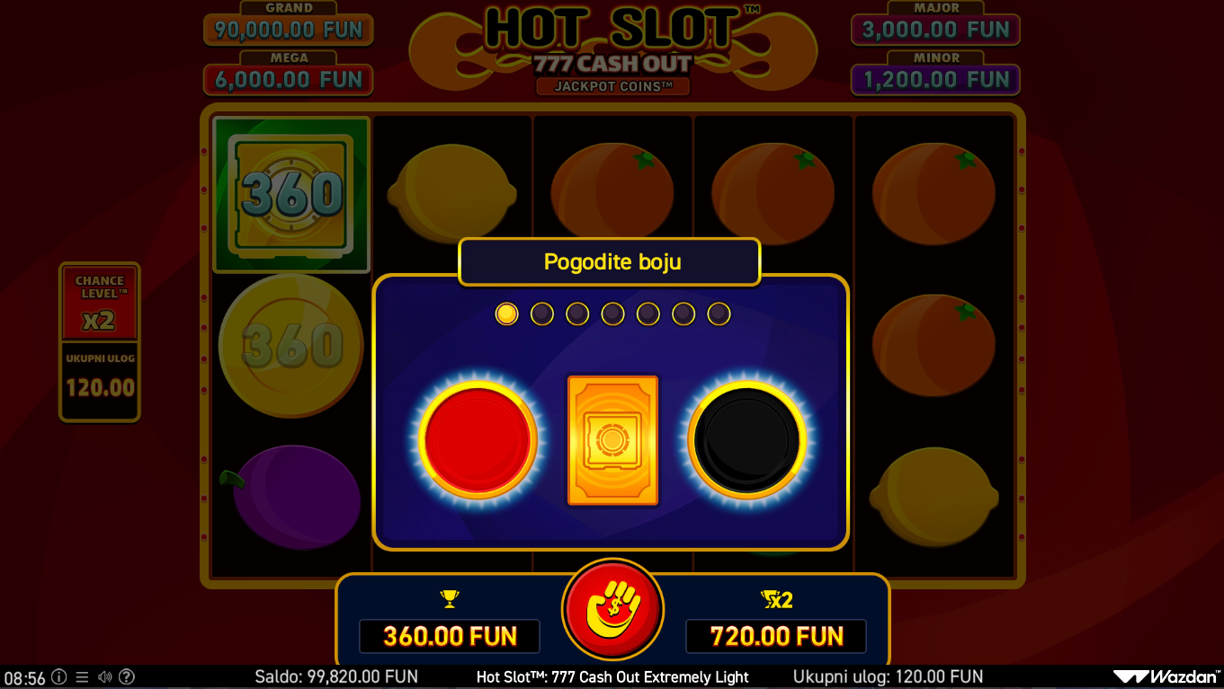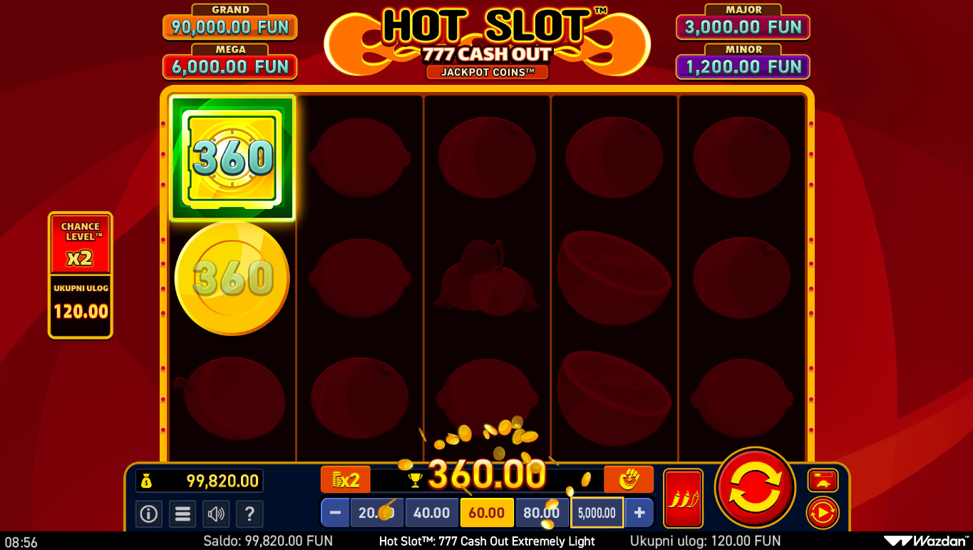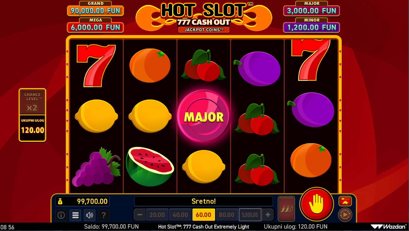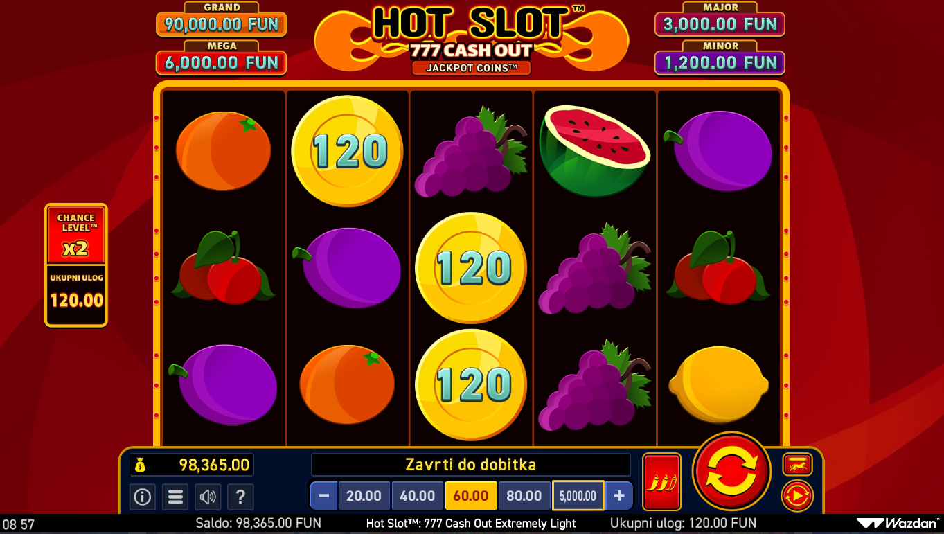 Hot Slot 777 Cash Out Extremely Light donosi klasični 777 retro vibe, ali u ultralaganom, super brzom formatu koji radi glatko na svakom uređaju. Igra pršti nostalgijom, vatrenim efektima i modernim Cash Out sustavom koji donosi instant uzbuđenje. Retro voćke, sedmice i zvona oživljavaju uz Wazdanovu modernu prezentaciju, dajući starinskom slotu potpuno novu energiju. Extremely Light verzija fokusira se na brzinu, jednostavnost i fluidnost. Ako voliš old school izgled, ali modernu akciju, ovo je savršena kombinacija.