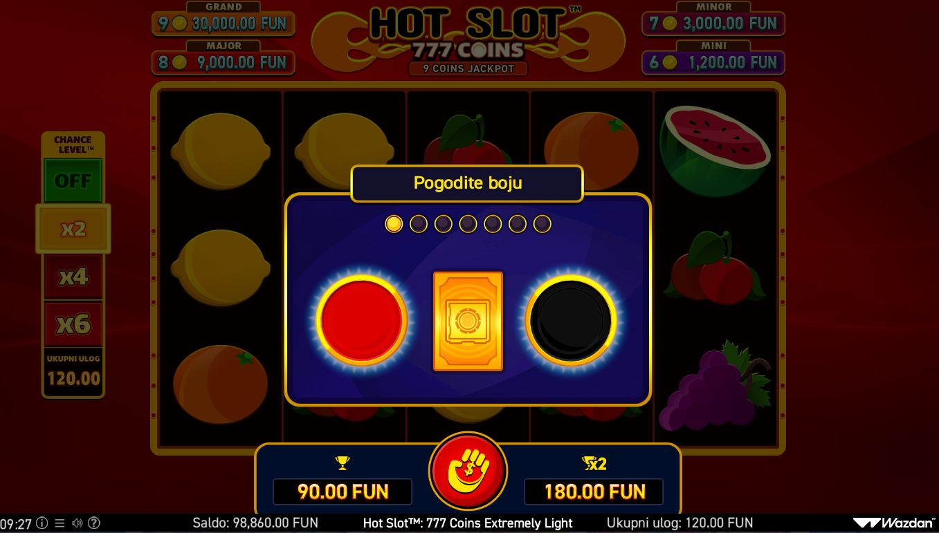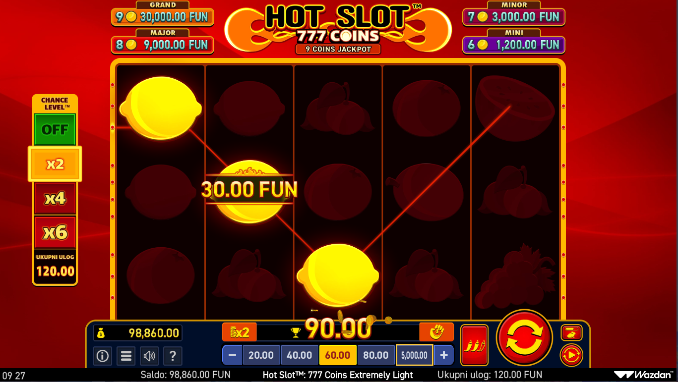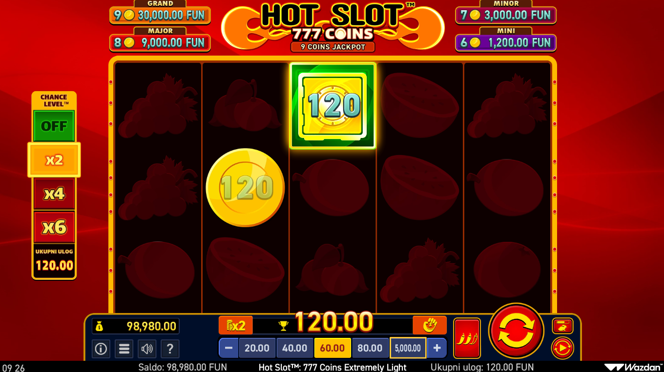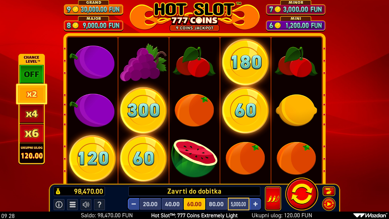 Hot Slot: 777 Coins Extremely Light i Wazdan donose retro slot iskustvo u ultra brzom, super optimiziranom formatu stvorenom za maksimalnu glatkoću igre. Simboli 7-ica, voćki i zlatnih kovanica daju igri klasičan Vegas štih, ali Extremely Light verzija čini sve još bržim, lakšim i fluidnijim. Igra zadržava sve ključne značajke originala, uključujući coin mehaniku i dinamične isplate. Vizuali su jednostavni, ali jasni i energični, savršeni za brze sesije. Ako voliš starinski stil s modernim dodirom, ovo je pravi retro hit u light pakiranju.