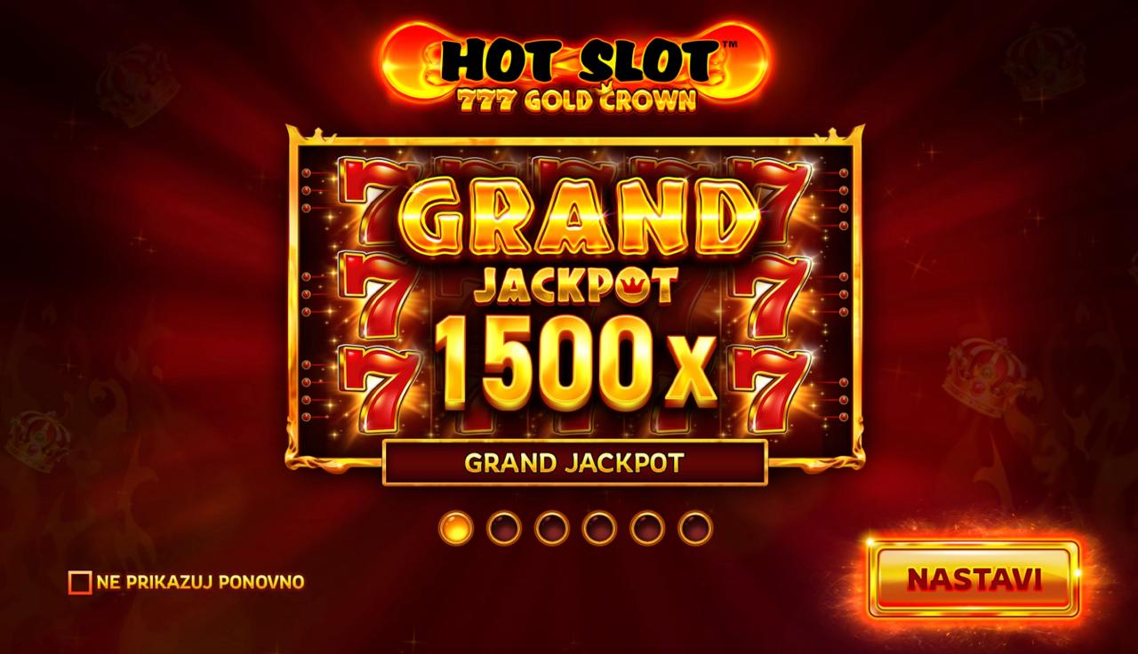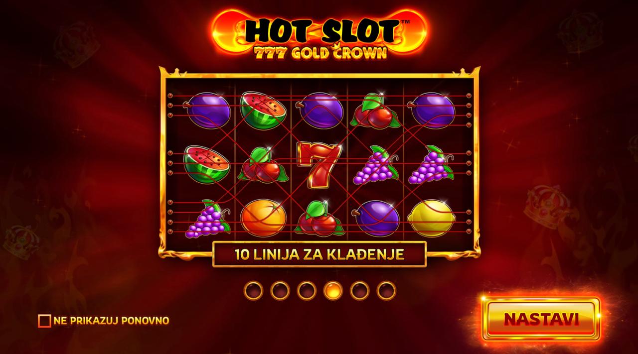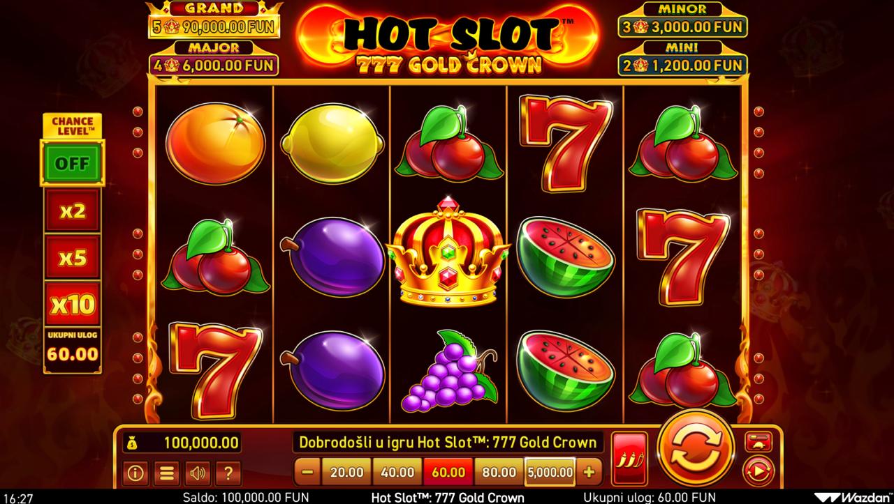Hot Slot 777 Gold Crown igra se na standardnom rasporedu rola gdje je cilj složiti iste simbole na aktivnim dobitnim linijama kako bi ostvario dobitak. Wild simboli mogu zamijeniti ostale simbole i pomoći u formiranju dobitnih kombinacija, dok bonus značajke mogu aktivirati dodatne isplate ili multiplikatore. Postavi željeni ulog i zavrti role kako bi otkrio klasične kombinacije i osvojio kraljevske dobitke!