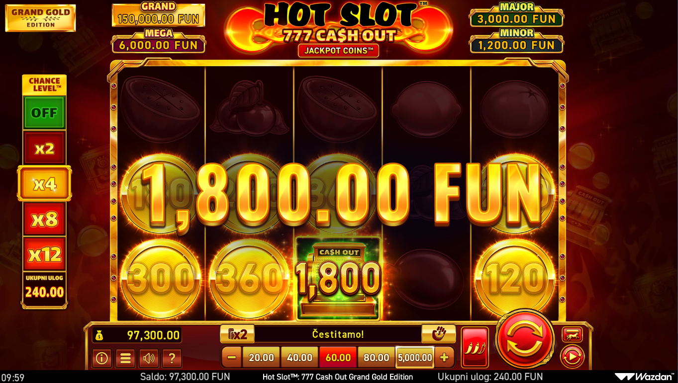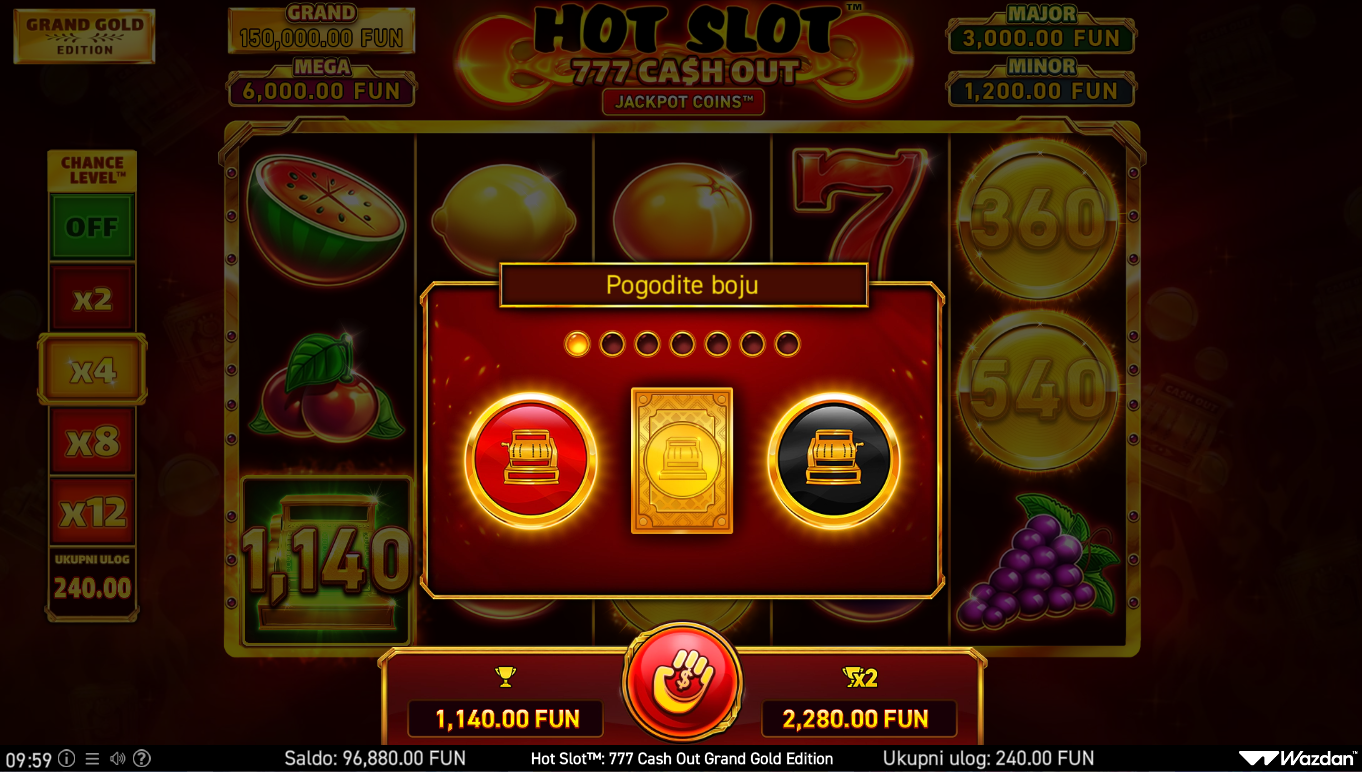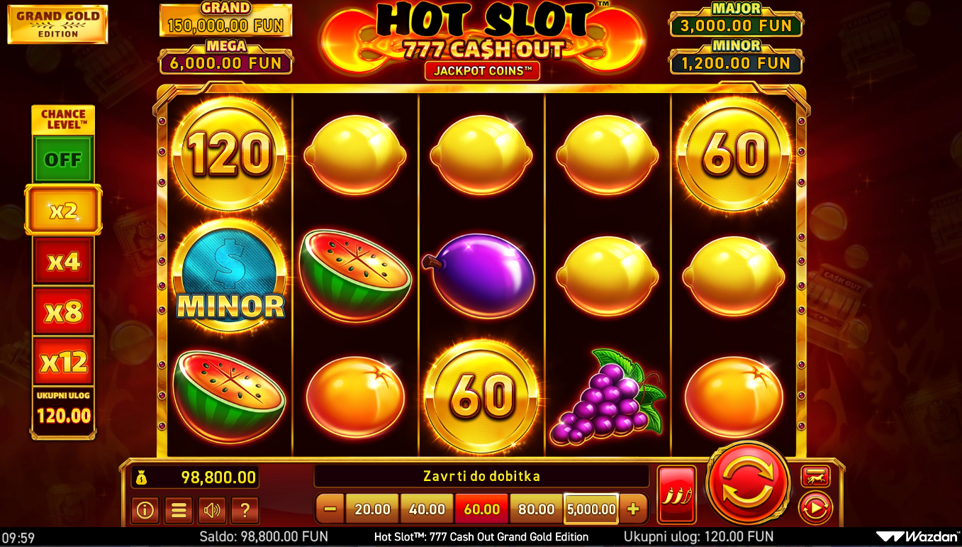 Zavrti valjke i ciljaj klasične simbole poput 7-ica, zvona i voćki, dok posebni Cash Out simboli mogu aktivirati trenutne isplate u bilo kojem trenutku. Gameplay je vrlo jednostavan: odabereš ulog, pritisneš spin i čekaš da se zlatni Cash Out pojavi. Grand Gold Edition ističe sve dobitne trenutke zlatnim efektima i premium zvukovima. Igra je idealna za brze sesije, jednostavno igranje i trenutni adrenalin. Sve je optimizirano za maksimalnu jasnoću i luksuzni osjećaj.
