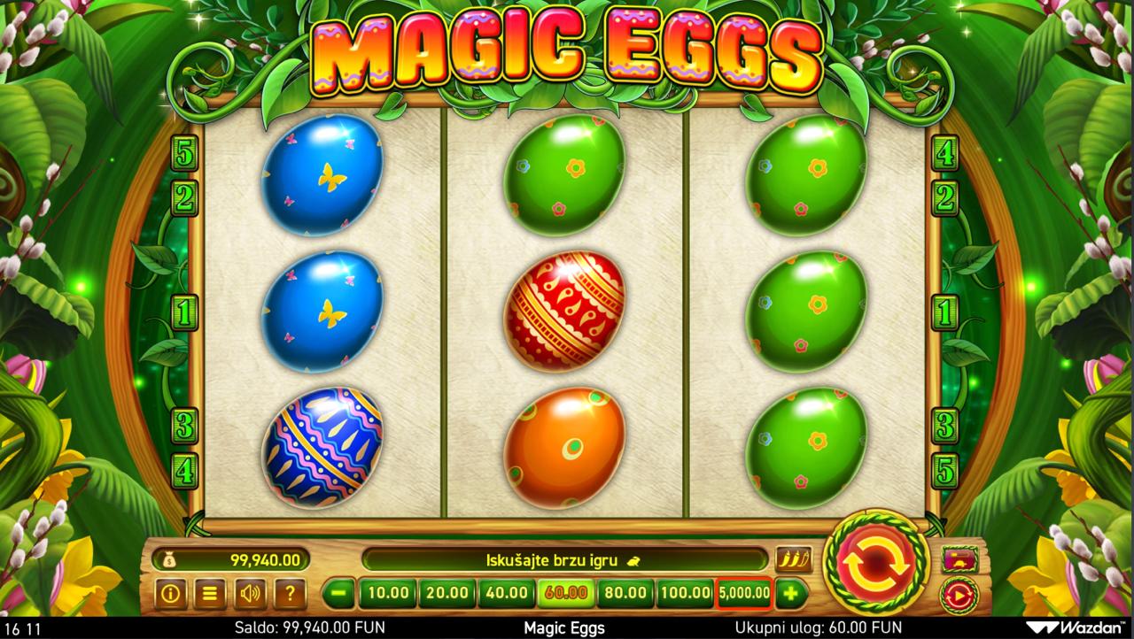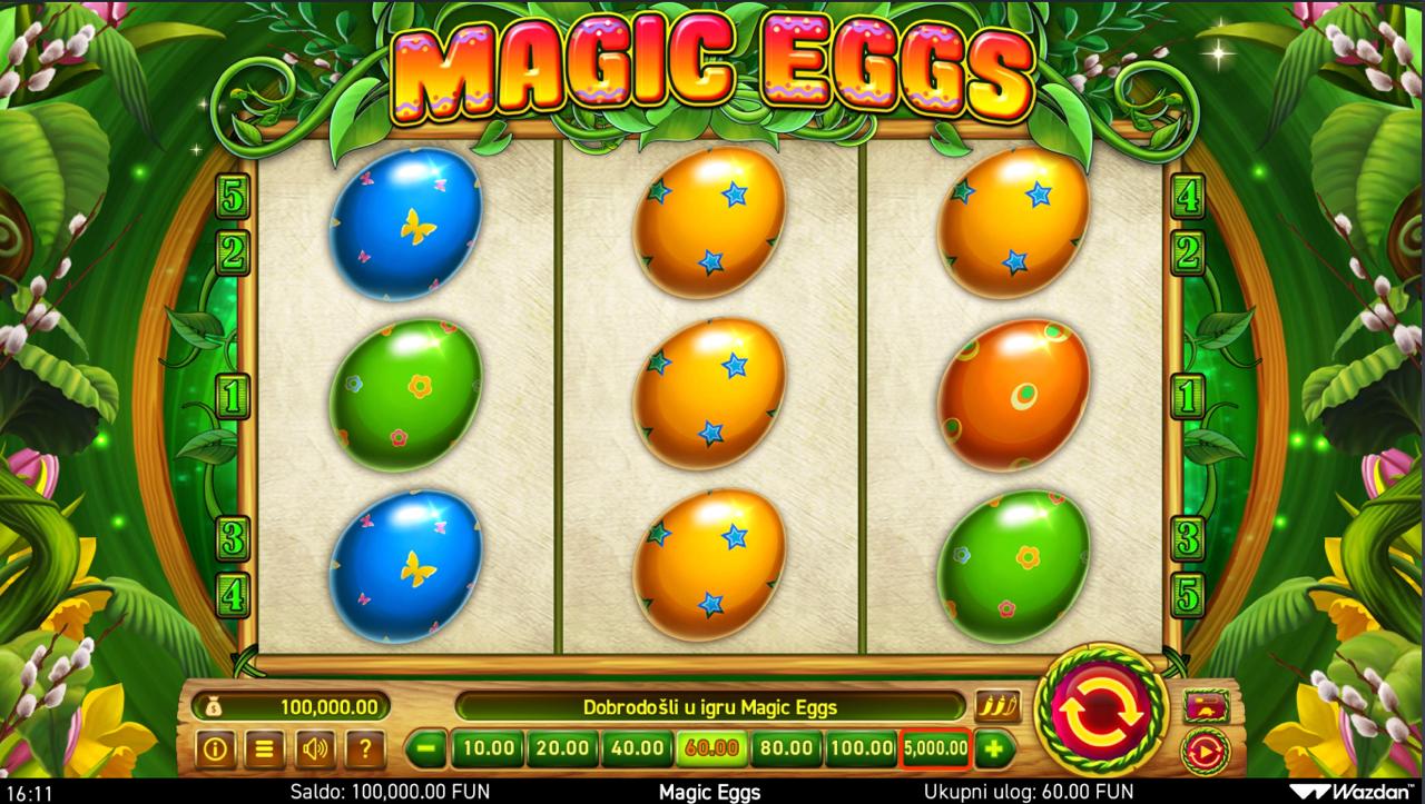 Zakorači u šareni svijet proljeća uz Magic Eggs, slot igru providera Wazdan koja donosi simpatičnu tematiku s jajima i zecom kao glavnim simbolima. Igra nudi jednostavno, ali zabavno iskustvo uz klasičnu strukturu i vizualno privlačan dizajn. Iako igra ne uključuje jackpot, Magic Eggs pruža solidne mogućnosti za dobitke kroz posebne simbole i dodatne opcije unutar igre.