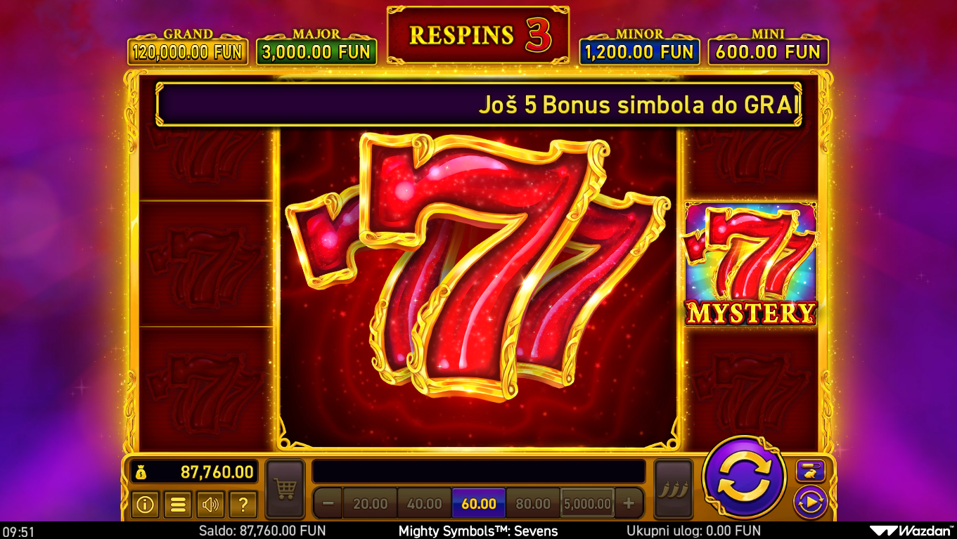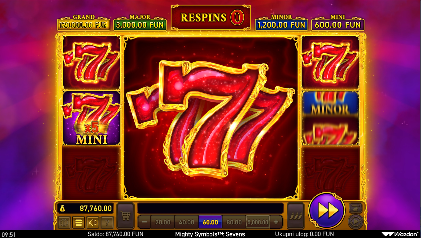Mighty Symbols™: Sevens spaja retro šarm klasičnih 7-ica s modernim Wazdan twistom, stvarajući slot koji izgleda i igra se moćnije nego što naslov sugerira. Igra donosi vizualno blistave 7-ice, energične animacije i napetu atmosferu koja podsjeća na luksuzne kasino automate. Svaki spin djeluje kao trenutak u kojem ekran može eksplodirati u moćnim kombinacijama. Ako voliš klasičan izgled, ali s turbo modernim efektima, ovo je savršen hit.