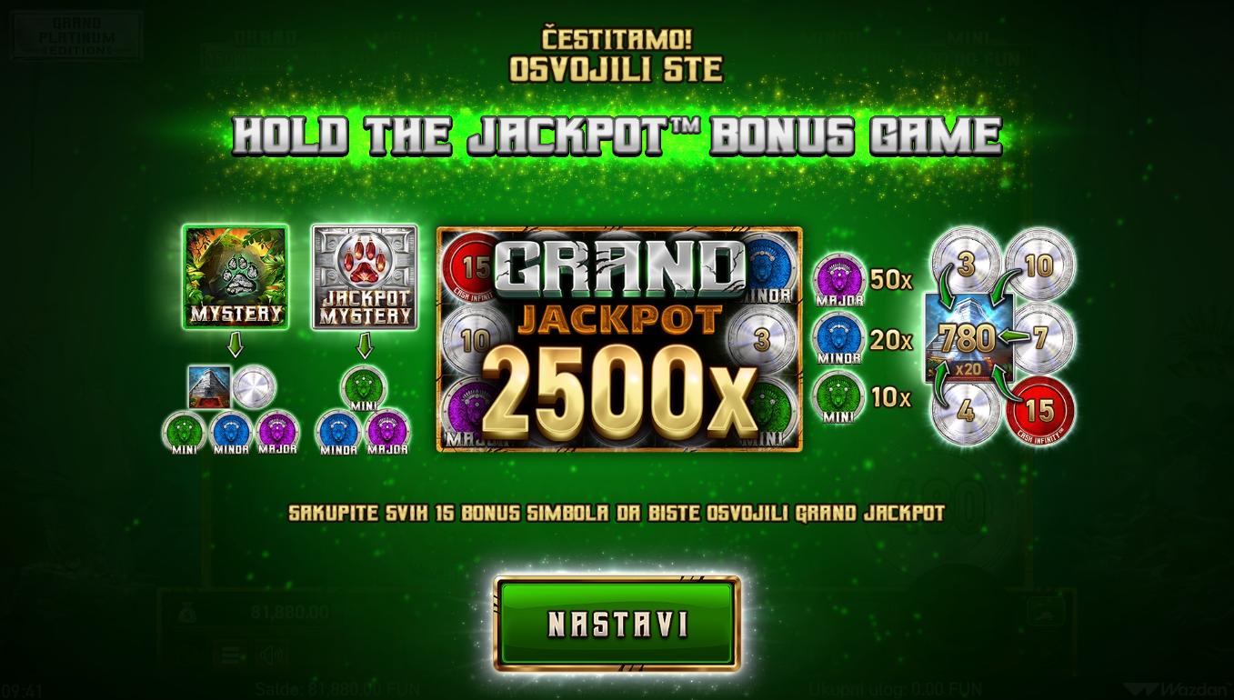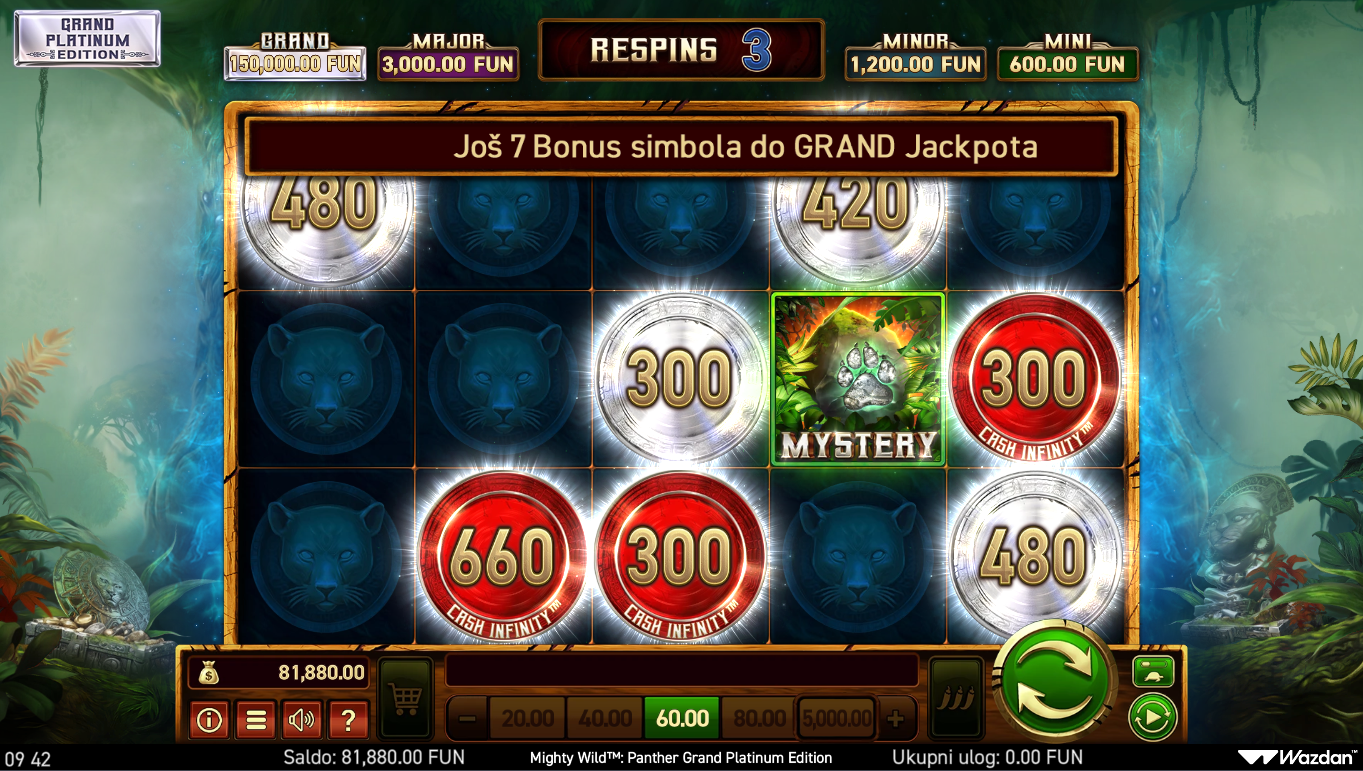 Zavrti valjke i lovi panteru, platinaste simbole, mistične toteme i ostale ikone koje nose najveće isplate. Platinum Edition uključuje snažne wild mehanike, multiplikatore i posebne Wazdan efekte koji mogu u trenu pojačati tvoje dobitke. Igra je jednostavna, brza i vizualno izvrsno izbalansirana, s platinastim bljeskovima koji naglašavaju svaki veći pogodak. Pantera je ključni premium simbol i kad se pojavi, stvara trenutak visoke napetosti i potencijala. Cilj je spojiti što više platinastih simbola i osjetiti snagu Grand Platinum efekata.