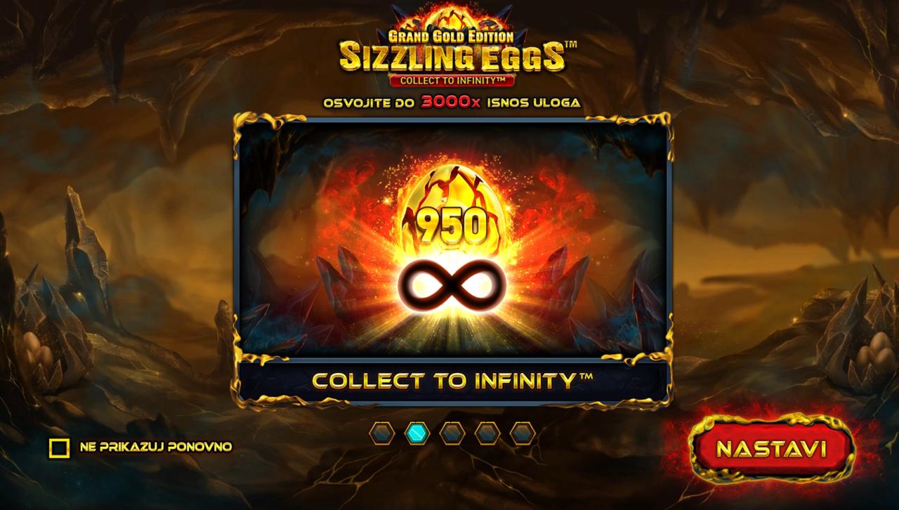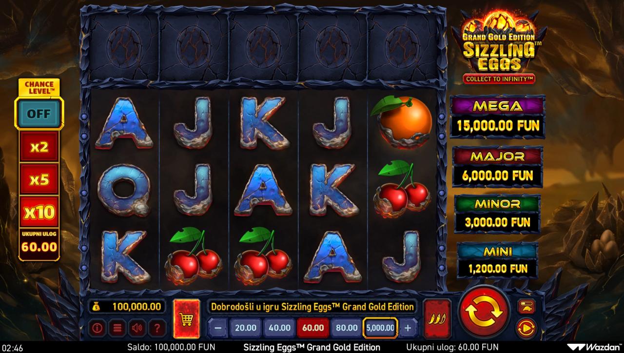 Sizzling Eggs Grand Gold Edition igra se na 5 rola gdje je cilj složiti iste simbole na aktivnim dobitnim linijama kako bi ostvario dobitak. Wild simboli mogu zamijeniti ostale simbole i pomoći u formiranju dobitnih kombinacija, dok posebni simboli mogu aktivirati dodatne značajke i bonus runde koje pružaju veće nagrade. Postavi željeni ulog i zavrti role kako bi osvojio sjajne nagrade!