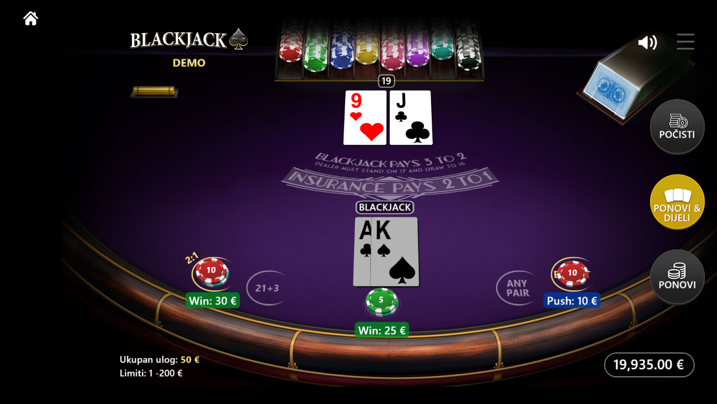Osnovni blackjack dio ove igre donosi visoki RTP od 99.4 %, što ga čini jednim od najisplativijih izbora za ozbiljne igrače. Side bet 21+3 ima nešto niži RTP, ali zato donosi eksplozivne isplate i dodatnu dozu uzbuđenja. Volatilnost raste kad se uključiš u poker opciju, ali upravo u tome leži njezina čar. Ako voliš strategiju, ali ti ne smeta povremeni adrenalinski val, ovo je prava kombinacija.