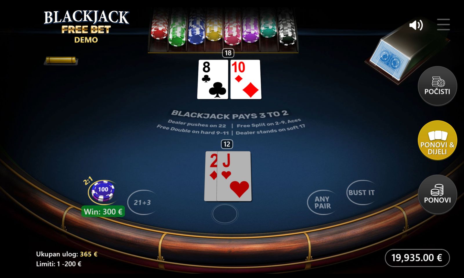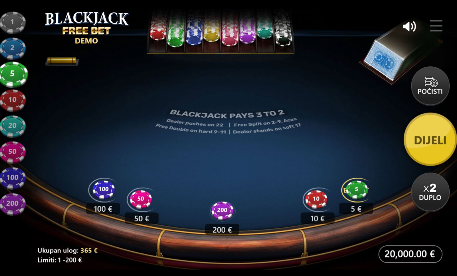 BLACKJACK FREE BET se igra prema standardnim pravilima blackjacka, uz dodatnu opciju “Free Bet”. Igrač postavlja ulog između 1,00 € i 200,00 €, dobiva karte, a može iskoristiti “Free Bet” za opcije kao što su “double down” ili “split” bez dodatnog troška. Ova opcija povećava fleksibilnost i strategiju igre, dajući više mogućnosti uz isti ulog. Igra nema bonus funkcija, besplatnih vrtnji ni jackpot — sve se svodi na strategiju, dobre odluke i dobru kartu.