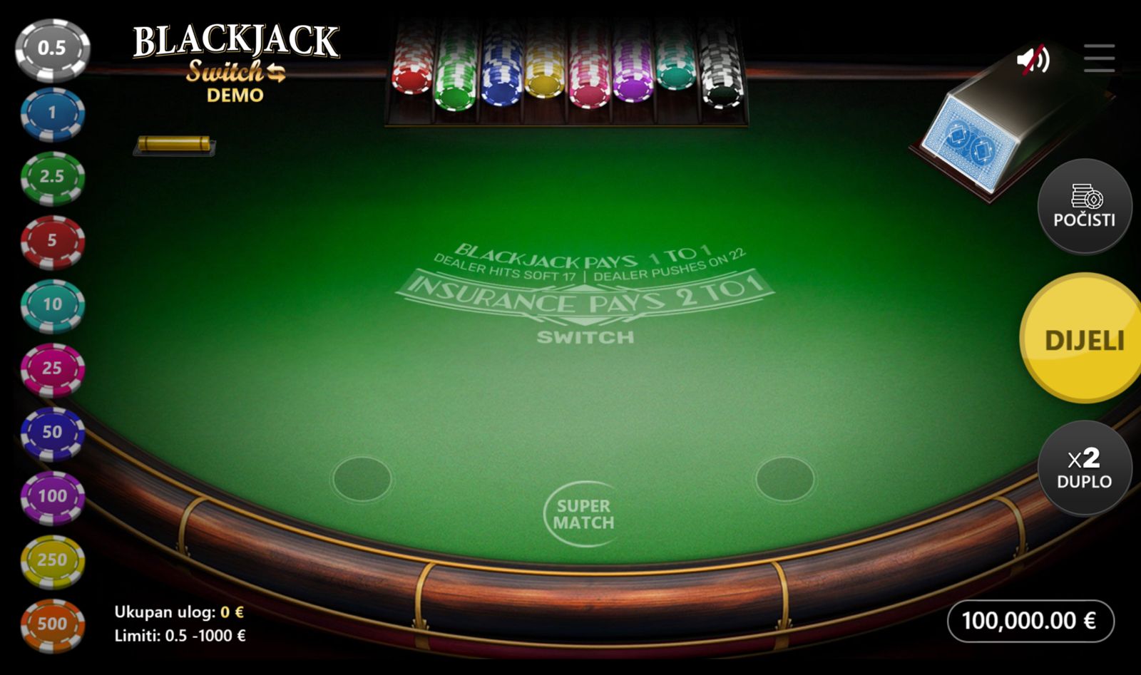 Dobrodošli u svijet fleksibilnih odluka i kartarske strategije! BLACKJACK SWITCH dolazi od providera XGames i nudi zanimljivu varijantu blackjacka u kojoj igrač dobiva dvije ruke odjednom i ima mogućnost razmjene karata — što donosi dodatnu dinamiku i taktiku. Minimalni ulog iznosi 0,50 €, dok maksimalni može biti 1.000,00 €, što igru čini pogodnom za širok raspon igrača — od casual do high-roller. Igra nema jackpot, ali mogućnost strateške razmjene karata povećava šanse za dobitak i dodaje element kontrole i razmišljanja. Ako voliš blackjack s više opcija, fleksibilnošću i dodatnim izazovima — BLACKJACK SWITCH može biti odličan izbor za tebe!
