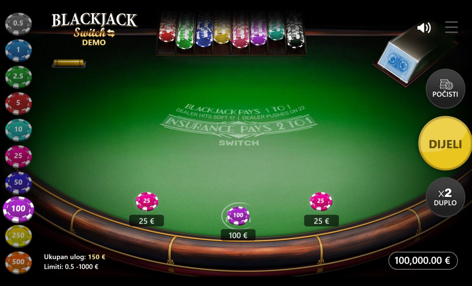 BLACKJACK SWITCH se igra tako što igrač dobije dvije ruke odjednom. Nakon što vidi obje ruke i dilerovu kartu, ima opciju “switch” — razmjene jedne karte između ruku kako bi optimizirao ishode. Ulozi su između 0,50 € i 1.000,00 €, što omogućuje igru prema vlastitoj strategiji i riziku. Igra nema bonus značajke, besplatne vrtnje ni jackpot — fokus je na kombinaciji taktičkog razmišljanja, sreće i pravilnog odabira.