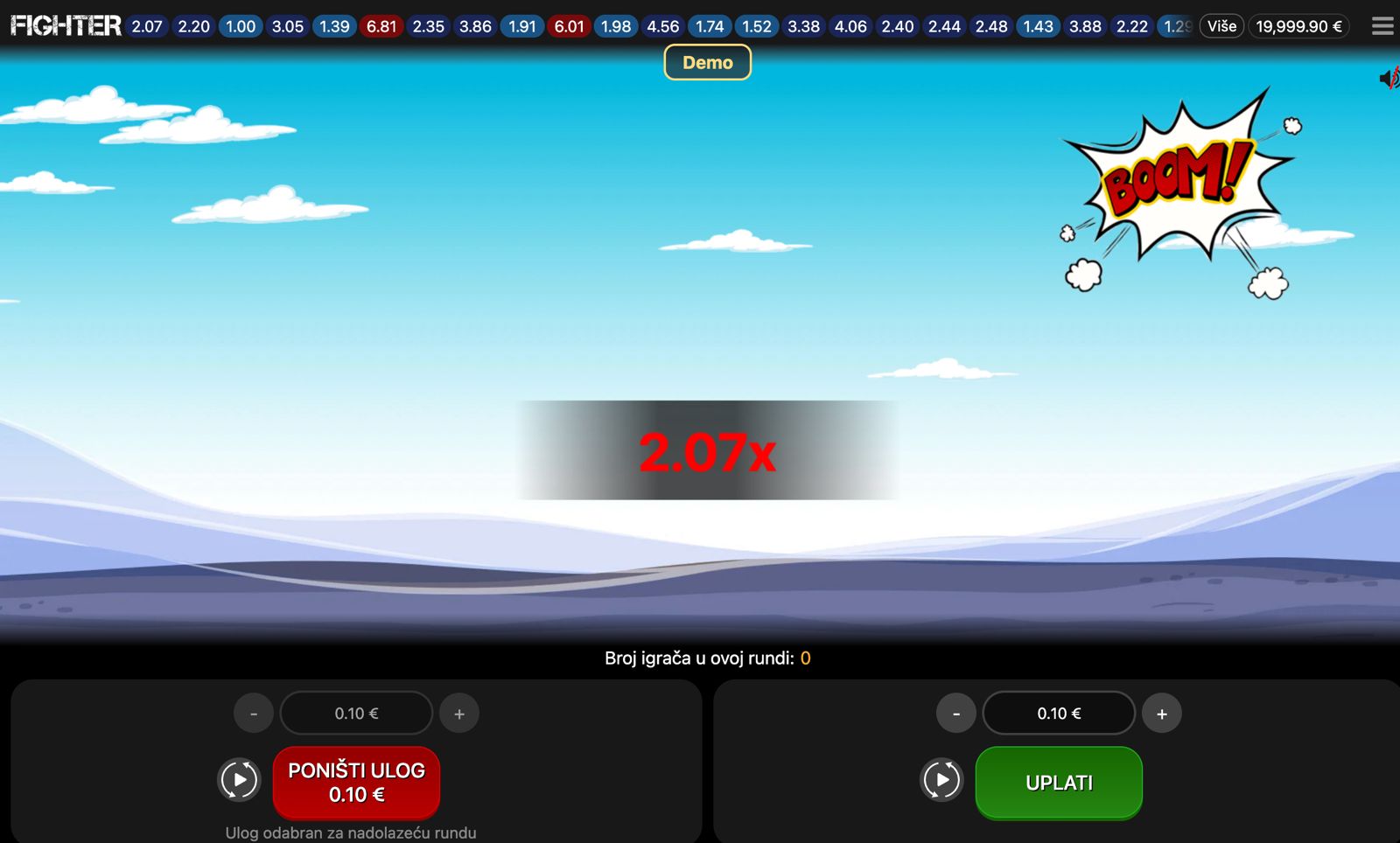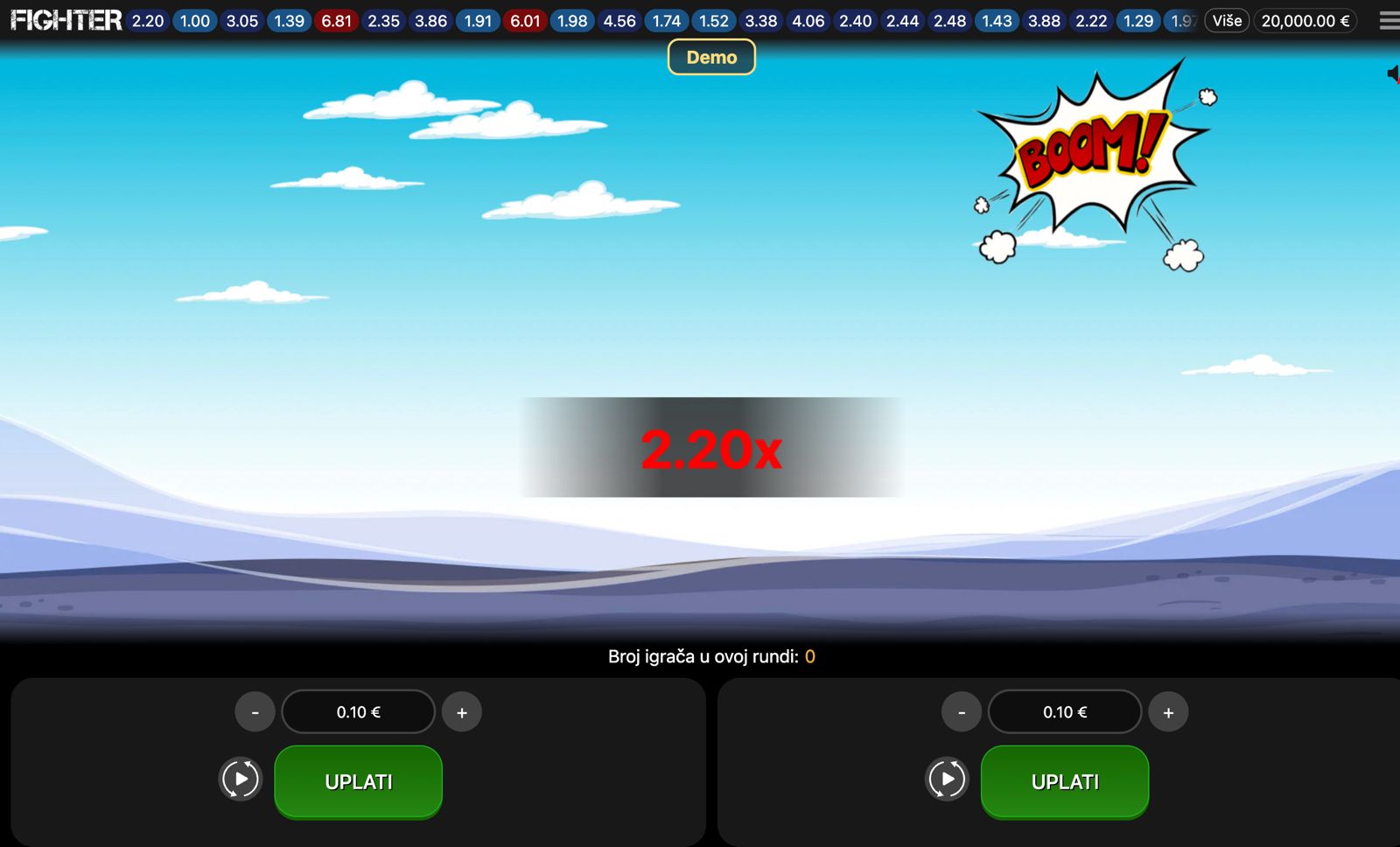FIGHTER se igra odabirom uloga i pokretanjem rundi u kojima se simboli ili karte kombiniraju za ostvarivanje dobitaka. Svaka runda traje kratko, a cilj je iskoristiti prilike za multiplikatore i veće kombinacije. Minimalni ulog je 0,10 €, a maksimalni 200,00 €, što omogućuje fleksibilan stil igre — od opreznog do visokorizičnog. Igra nema besplatnih vrtnji, bonus rundi ni jackpot, fokusirajući se na čistu borilačku akciju i napetost.