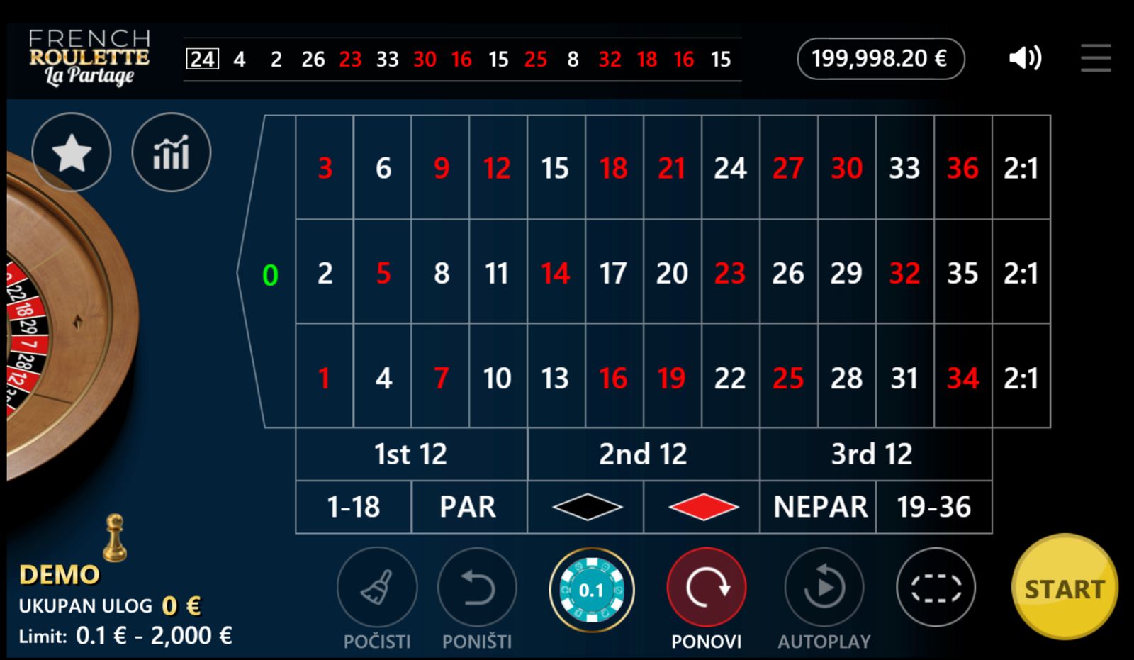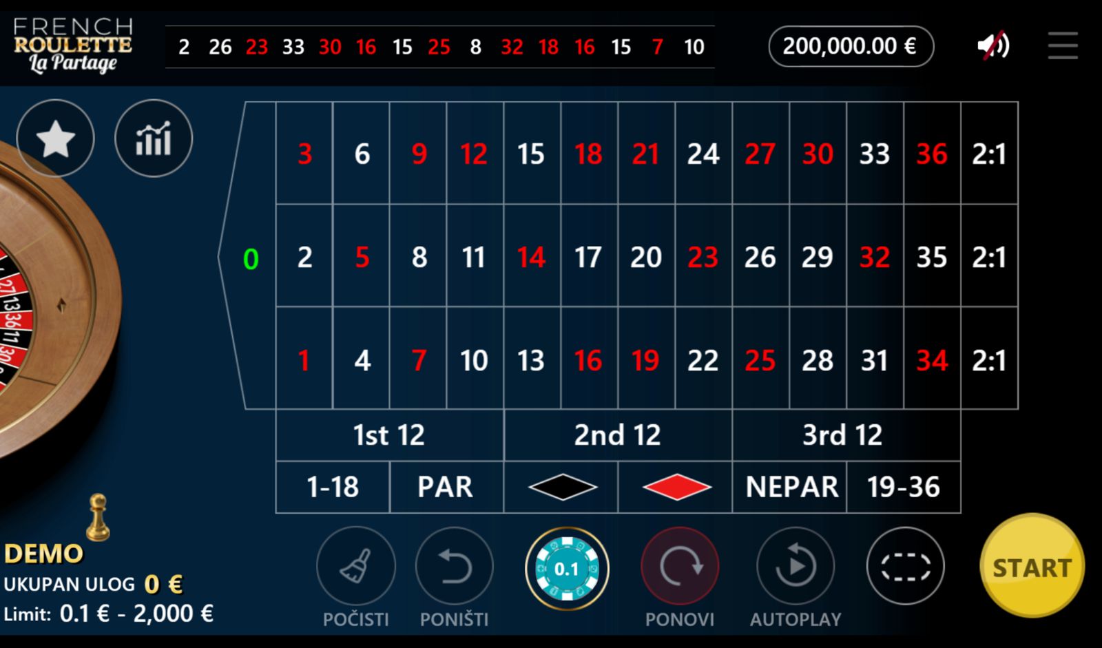 FRENCH ROULETTE – LA PARTAGE koristi pravila europskog ruleta, ali donosi dodatnu prednost: kod oklada na par/nepar ili crveno/crno, ako kuglica padne na nulu, pola uloga se vraća igraču. Ova značajka značajno smanjuje rizik i čini igru jednom od najisplativijih rulet varijanti. Igrač odabire vrste oklada — jednostavne, kombinirane ili visoko rizične — i pokreće spin. Minimalni ulog je 0,10 €, a maksimalni 2000,00 €, što omogućuje širok spektar strategija. Igra nema bonus rundi, besplatnih vrtnji ni jackpot, fokusirajući se na čisto i elegantno rulet iskustvo.